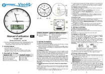 (2) L’aiguille des secondes de l'horloge reviendra sur sa position de départ (12h00), puis l'horloge murale tentera de recevoir le signal. Patientez environ 2 à 5 minutes avant que l'heure réelle ne s'affiche. 3.5 Réglage manuel de l'heure Il est nécessaire de régler manuellement l'heure dans les endroits où le signal radio est inexistant. (1) Maintenez enfoncée la touche M.SET(D3) pendant environ 3 secondes jusque les aiguilles soient bloquées. (2) Restez appuyer sur la touche M.SET(D3) jusqu’à l’obtention de la bonne heure. (3) Relâchez la touche M.SET(D3) pour arrêter le réglage manuel et enregistrer automatiquement l'heure. Après quelques secondes les aiguillent se mettent en fonctionnement. 3.6 Remise à zéro Si l'horloge murale ne répond pas en appuyant sur les touches, ou en cas de tout autre dysfonctionnement, suivez les étapes ci-dessous : En utilisant cette procédure, toutes les données reçues seront supprimées. (1) Appuyez sur la touche de RÉINITIALISATION (D4) avec un instrument pointu (par ex. un stylo). (2) Les aiguilles de l'horloge reviendront sur leur position de départ (12h00), puis l'horloge murale tentera de recevoir le signal. (3) Patientez environ 2 à 5 minutes avant que l'heure réelle ne s'affiche. 4. Horloge numérique 4.1 Mise en fonctionnement : Ouvrez le compartiment des piles (C2). Insérez 2 piles de format AA en respectant les polarités [signes «+» Manuel d'utilisation Section D– Réglage Analogique Remettez le couvercle du compartiment des piles (C2). C1: Trou de fixation C2: Capot du logement des piles D1: Touche «REC» pour la mise à l’heure automatique D2: Clou de transport D3: Touche M SET D4: Touche RESET de réinitialisation D5: Compartiment pile 4.2 Réglages au démarrage Viso60 –DCF (Europe continentale – sauf UK) !!! VEUILLEZ CONSULTER NOTRE SITE WEB : WWW.GEEMARC.COM CAR IL PEUT Y AVOIR DES MISES A JOUR IMPORTANTES ET CHANGEMENT DONT VOUS DEVEZ ETRE CONSCIENT !!! 1. Caractéristiques - Grand affichage des informations - Calendrier perpétuel jusqu'à l'an 2099 - 14 langages sélectionnables par l'utilisateur au démarrage - Affichage de l’heure, du jour, mois ou période de la journée 2. Descriptif de l’horloge Section A - LCD Section B - Arrière B1: Touche de réglage «SET» B2: Touche «▲» B3: Touche «▼» B4: Touche «RESET» A1: Jour de la semaine ou mois A2: Période de la journée A3: Heure analogique A4: Icône de commande radio 3. Horloge Analogique 3.1 Mise en fonctionnement (1) Retirez le clou de transport (D2) de la section D de d'horloge. L'horloge ne pourra fonctionner que si le clou a été retirée. (2) Insérez une pile (1,5 V AA/LR6) dans le compartiment pile (D5). Veillez à respecter strictement les polarités (+/-) indiquées dans le compartiment en installant la pile. 3.2 Réglage de l'heure Sitôt que l'horloge a reçu le signal horaire DCF, l'heure est réglée sur celle de l'Europe Centrale (CET). Les changements vers l'heure d'été et l'heure d'hiver (et vice-versa) sont également définis automatiquement. Les autres décalages horaires peuvent être uniquement réglés manuellement. 3.3 Réglage automatique de l'heure via le signal horaire DCF Une fois la pile installée, l'heure est automatiquement réglée via le signal DCF. Cette procédure peut prendre quelques minutes (entre 5 et 7 minutes environ). Au cours de cette séquence de réglage, les aiguilles de l'horloge tournent plusieurs fois avant que l'heure correcte s'affiche. Remarque: mettre l’horloge prêt d’une fenêtre pour la mise à l’heure automatique. 3.4 Réglage pour lancer une mise à l’heure en automatique DCF Utilisez cette fonctionnalité, lorsque la fonction de passage automatique à l'heure d'été / hiver ne fonctionne pas ou si l'horloge murale ne reçoit pas le signal horaire. (1) Maintenez enfoncée la touche REC(D1) pendant 3 secondes pour lancer la recherche en mode manuelle du signal DCF. 1 et «–»]. Section C - Structure 2 Lors de la mise en marche, vous avez 1 minute pour faire les premiers réglages. L'horloge affiche ENGLISH, appuyez sur «▲»(B2) ou «▼»(B3) pour choisir Français, puis sur «SET»(B1) pour confirmer. Appuyez sur «▲»(B2) ou «▼»(B3) pour choisir le type d'affichage, puis sur «SET»(B1) pour confirmer (voir remarque). Si, après une 1 minute, vous n'avez toujours pas appuyé sur une touche, la Viso60 lancera la procédure de réglage automatique de l'horloge. Remarque : mettre l’horloge prêt d’une fenêtre pour la mise à l’heure automatique. DP-1 affiche le jour et la DP-2 affiche le mois, le période de la journée. jour et l'année. -DP-3 affiche les 2 premiers types d’affichage les uns après les autres pendant XX secondes (voir chapitre 4.4.C pour régler le temps). 4.3 Horloge radiocommandée: Après le démarrage, l'horloge commence automatiquement à scanner le signal horaire DCF pendant 10 minutes. L'icône de commande radio « » (A4) clignote sur l'écran LCD. (A4) clignote pour indiquer la réception du signal DCF (A4) est activée pour indiquer la réception correcte du signal pour indiquer que la transmission du signal a échoué (A4) disparaît Il est possible de régler l'horloge afin que le signal radio soit scanné manuellement. Pour ce faire, maintenez 3 secondes la touche «▼»(B3) enfoncée. Chaque transmission de signal prend quelques minutes. Si la transmission échoue, la numérisation s'arrête (« »(A4) disparaît de l'écran LCD) et reprendra à la prochaine heure pleine. Par exemple : si la réception a échoué à 8h20. Elle reprendra à 9h00. Le passage à l’heure d’hivers ou l’heure d’été se fait automatiquement 3 si la réception du signal est bonne. 4.4 Réglage de l’heure Vous devez, tout d'abord, patienter 10 min. jusqu'à ce que la séquence de réglage automatique de l'horloge soit terminée (voir le chapitre 4.3) avant de pouvoir accéder au réglage ou maintenez 3 secondes la tou