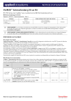 NOTICE D’UTILISATION VetMAX™ Schmallenberg Virus Kit RT-PCR temps réel TaqMan™ pour la détection du SBV (Schmallenberg Virus) Référence Catalogue SBVS50 Partie Nº 100020434 Pub. Nº MAN0007811 Rév. D Technique RT-PCR temps réel (ARN) – Duplex – IPC Endogène Espèce(s) Acides nucléiques isolés à partir des matrices Test Bovins Petits ruminants (ovins, caprins) Tissu encéphalique Sang (en tubes EDTA) Sérum Individuel AVERTISSEMENT ! Lire les fiches de données de sécurité (FDS) et suivre les consignes de manipulation. Porter des lunettes de sécurité, des gants et des vêtements appropriés. Les fiches de données de sécurité (FDS) sont disponibles à l’adresse thermofisher.com/support. AVERTISSEMENT ! RISQUES BIOLOGIQUES POTENTIELS. Lire les informations de sécurité relatives aux risques biologiques du produit disponibles sur thermofisher.com. Porter des lunettes de sécurité, des gants et des vêtements appropriés. Informations sur le produit Description du produit Applied Biosystems™ VetMAX™ Schmallenberg Virus Kit est un outil de diagnostic moléculaire du virus SBV. Il permet la détection spécifique du gène S du virus SBV par la technique de PCR en temps réel. Chaque échantillon d’ARN obtenu après extraction est analysé en monocupule : la même cupule est utilisée pour la détection spécifique de l’ARN viral du SBV et pour la détection d’un IPC (Internal Positive Control). La positivité de l’IPC traduit à la fois l’efficacité de l’extraction et l’absence d’inhibiteur dans les échantillons. Il est utilisable sur ARNs viraux extraits à partir de tissu encéphalique, de sang (en tube EDTA) ou de sérum. La recherche du virus est réalisée préférentiellement sur les encéphales des avortons, mais le virus peut également être localisé dans le sang (Source FLI – Laboratoire National de Référence allemand). En l’absence d’informations complémentaires sur la durée de la virémie qui semble très courte (2 à 3 jours) et sur la localisation du virus chez l’animal vivant, nous recommandons de travailler préférentiellement ARN viraux extraits à partir de tissu encéphalique. Les protocoles complets d’extractions des ARN viraux à partir de ces matrices sont disponibles sur demande au Support Technique. Réactifs du kit et conservation VetMAX™ Schmallenberg Virus Kit se présente sous la forme d’un coffret contenant des réactifs pour la détection en duplex du SBV et d’un contrôle interne IPC. À réception, le kit doit être conservé dans sa totalité entre −30°C et −10°C. A la première utilisation du kit, suivre les recommandations de conservation du tableau suivant pour chaque composant : Nom 3 - Mix SBVS (Tube vert) 4a - EPC SBVS (Tube marron) Description Mix pour RT-PCR TaqMan™. Il contient : • Le système de détection pour la cible SBV : primers forward et reverse, ainsi qu’une sonde TaqMan™ marquée FAM™ - NFQ (NFQ = Non-Fluorescent Quencher). • Le système de détection pour l’IPC : primers forward et reverse, ainsi qu’une sonde TaqMan™ marquée VIC™ - TAMRA™. • Le tampon, la reverse transcriptase et l’enzyme de PCR. External Positive Control : Contrôle positif en SBV. Il s’agit d’acides nucléiques déjà extraits à amplifier lors de la RT-PCR temps réel. Réservé à l’usage vétérinaire. Usage in vitro exclusivement. Conservation Volume (50 réactions) A réception Après première utilisation 2 × 500 µL −30°C à −10°C −30°C à −10°C 90 µL −30°C à −10°C −30°C à −10°C Témoins d’extraction et d’amplification Le VetMAX™ Schmallenberg Virus Kit contient 1 témoin permettant la validation de l’amplification des ARN viraux : 4a - EPC SBVS : contrôle positif en SBV Contrôle positif déjà extrait à amplifier lors de la RT-PCR temps réel. Un résultat positif compris dans l’intervalle accepté de Ct permet de valider l’amplification de la cible SBV par RT-PCR temps réel. La validation de l’extraction des acides nucléiques pour chaque échantillon s’effectue grâce à la détection d’un IPC endogène (Internal Positive Control), présent dans chaque échantillon. Un résultat IPC positif pour un échantillon permet de valider l’extraction de cet échantillon qu’il soit positif ou négatif pour le pathogène recherché : élimination des faux négatifs et vérification de l’effet des inhibiteurs. Il est recommandé de réaliser deux contrôles négatifs pour valider le bon déroulement de l’analyse : NCS : contrôle négatif d’extraction C’est un témoin composé des réactifs utilisés lors de l’extraction, sans ajout d’échantillon (le volume d’échantillon peut être remplacé par le tampon utilisé lors de la préparation des échantillons ou par de l’eau DNase/RNase-free), qui subit le même traitement que les échantillons : extraction des acides nucléiques (avec ajout d’IPC) puis RT-PCR temps réel. Un résultat négatif en SBV and en IPC permet de valider l’absence de contamination au cours de l’extraction et de la PCR temps réel. NC : contrôle négatif d’amplification Il s’agit du mix d’amplification déposé dans la plaque au moment de la préparation de la RT-PCR temps réel, complété de 5 µL d’eau DNase/RNase-free pour ajuster la réaction à 25 µL. Un résultat négatif pour toutes les cibles (SBV et IPC) permet de valider l’absence de contamination au cours de la préparation de la RT-PCR temps réel. Matériel et réactifs requis pour la RT-PCR temps réel non fournis dans le kit Sauf indication contraire, tous les produits sont disponibles sur thermofisher.com. • Micropipettes de précision (gamme de 1 µL à 1000 µL) avec pointes DNase/RNase-free à filtre • Eau DNase/RNase-free • Tampon TE 1X • Tampon PBS 1X • Un thermocycleur de PCR temps réel capable de détecter les fluorophores suivants : - FAM™ (maximum d’émission : λ