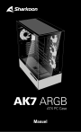AK7 ARGB ATX PC Case Manuel Spécifications Caractéristiques générales: Facteur de forme: Slots d‘expansion: Revêtement intérieur: Support carte graphique: Installation sans montage des périphériques: Système de gestion des câbles: Panneau latéral: Versions en couleur: Dimensions (L x P x H): ATX 7 Verre trempé Noir, Blanc 43,5 x 22,5 x 48,5 cm Compatibilité RVB: Type: Ports: Contrôle manuel: Compatibilité carte mère: Adressable 4 22 modes ASUS Aura Sync, MSI Mystic Light Sync, ASRock Polychrome Sync, Gigabyte RGB Fusion Ready 5V-D-coded-G Broche RVB: Baies maximum: 3,5" 2,5" 2 4 I/O: Type-C (USB 3.2 Gen 2): USB 3.0 (gauche): Audio (gauche): 1 2 (Prise jack TRRS) Configuration des ventilateurs: Panneau arrière: Panneau supérieur: Panneau latéral: Panneau inférieur: Concentrateur de ventilateur PWM: 1x ventilateur PWM ARVB de 120 mm (pré-installé) 3x ventilateur de 120 mm ou 2x ventilateur de 140 mm ou radiateur (en option) 3x ventilateur PWM ARVB de 120 mm (pré-installé) ou radiateur* (en option) 2x ventilateur de 120 mm (en option) 4 ports Compatibilité: Carte mère: Longueur max. des cartes graphiques: Hauteur max. du refroidisseur CPU: Longueur max. du bloc d‘alimentation: Hauteur max. du radiateur avec ventilateur (supérieur): Mini-ITX, Micro-ATX (BTF), ATX (BTF) 41,0 cm 17,0 cm 23,5 cm 6,0 cm Contenu de l‘emballage: AK7 ARGB, Kit d‘accessoires * Une longueur de carte graphique supérieure à 26 cm peut gêner l‘installation du radiateur sur la panneau latéral 01 Consignes de sécurité L’appareil est conçu comme un boîtier pour les composants matériels PC dans des zones intérieures sèches. Pour votre propre sécurité, suivez toujours les instructions ci-dessous et assurez-vous que l’appareil n’est pas endommagé avant de l’utiliser. En outre, utilisez uniquement des câbles compatibles et des accessoires autorisés. La garantie du fabricant sera annulée si le produit ou tout composant matériel installé est endommagé en raison d’une mauvaise utilisation ou du non-respect de ces consignes de sécurité. En cas de problème avec le produit, contactez notre service d’assistance technique à l’adresse support@ sharkoon.com. • • • • AVERTISSEMENT ! Risque d’étouffement ou de suffocation dû aux petites pièces et aux matériaux d’emballage. Gardez l’appareil et ses matériaux d’emballage hors de portée des enfants de moins de 6 ans ! AVERTISSEMENT ! Risque de blessure telle que coupure ou contusion. Faites attention aux bords tranchants, aux ouvertures et aux pièces mobiles. Utilisez des gants de sécurité lors de l’installation du matériel. AVERTISSEMENT ! Crises d’épilepsie provoquées par les lumières clignotantes. N’utilisez l’appareil que dans des pièces bien éclairées ou, si possible, désactivez l’éclairage de l’appareil ! En cas de doute, consultez un médecin avant utilisation ! ATTENTION ! Risque de casse dû à une tension de surface élevée. Évitez toute pression excessive sur les panneaux en verre trempé, par exemple en posant le verre trempé sur l’un de ses bords sur une surface dure. 02 Assemblage du panneau latéral 03 Installer les disques durs/SSD de 2,5” 04 Installer les disques durs/SSD de 2,5” 05 Installer les disques durs/SSD de 2,5” 06 Installer les disques durs de 3,5” en option en option en option en option 07 Installer les disques durs de 3,5” 08 Installer les cartes d’extension 09 Retirer les filtres anti-poussière 10 Ajuster le support carte graphique 11 Installer les ventilateurs 12 Installer le radiateur sous le panneau supérieur Radiateur de 120 mm 140 mm 240 mm 280 mm 360 mm 13 Installer le radiateur sur le panneau latéral Radiateur de 120 mm 140 mm 240 mm 280 mm 14 Kit de carte graphique verticale en option Si nécessaire, veuillez vérifier chez votre revendeur local pour acheter ce kit. 15 Commande RVB adressable via la carte mère Un ventilateur doit être connecté à FAN1 pour permettre le contrôle de la vitesse du ventilateur via la carte mère et l’affichage des signaux de vitesse du ventilateur. FAN4 LED4 FAN3 LED3 FAN2 LED2 FAN1 LED1 RESET SW Ventilateurs / bandes LED RVB adressables PWM à 4 broches ou ventilateurs à 3 broches +5V D ADD_HEADER Connecteur RVB adressable sur la carte mère Connecteur de ventilateur PWM à 4 broches sur la carte mère SATA 16 Commande RVB adressable manuelle Un ventilateur doit être connecté à FAN1 pour permettre le contrôle de la vitesse du ventilateur via la carte mère et l’affichage des signaux de vitesse du ventilateur. FAN4 LED4 FAN3 LED3 FAN2 LED2 FAN1 LED1 RESET SW Ventilateurs / bandes LED RVB adressables Connecteur de ventilateur PWM à 4 broches sur la carte mère PWM à 4 broches ou ventilateurs à 3 broches Rouge Vert Mode RVB 13 Bleu Blanc Jaune Cyan Rose SATA Blanc naturel Blanc chaud Mode RVB 1 Appuyez sur le bouton reset pour sélectionner différents modes Mode RVB 12 Mode RVB 11 Mode RVB 10 Mode RVB 9 Mode RVB 8 Mode RVB 7 Mode RVB 6 Mode RVB 5 Mode RVB 2 Mode RVB 4 Mode RVB 3 Appuyez sur le bouton reset pendant 2 secondes pour éteindre les LED. Lorsque les LED sont éteintes, appuyez sur le bouton reset pour allumer les LED. 17 Remarque(s) Mentions légales Sharkoon n’assume aucune responsabilité pour les pertes de données, en particulier celles causées par un traitement inapproprié. Les noms de produits et descriptions sont des marques commerciales et/ou protégées des fabricants respectifs, acceptées comme protégées. Dans le cadre de la politique d‘amélioration continue des produits chez Sharkoon, le design et les spécifications sont sujets à des modifications sans préavis. Les spécifications nationales du produit peuvent varier. Tous les droits sont réservés, en particulier pour la traduction, la réimpression, la reproduction par copie ou tout autre moyen technique. Toute infraction donnera lieu à une demande de compensation. Tous droits réser