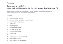 Français Roborock H60 Pro Manuel utilisateur de l'aspirateur balai sans fil Avant d’utiliser ce produit, lisez attentivement le présent manuel et ses illustrations et rangez-le soigneusement pour pouvoir vous y référer ultérieurement. Contenu 13 Instructions de sécurité 13 Explication des symboles internationaux 14 Présentation du produit 14 Installation 14 Mode d'emploi 17 Entretien de routine 18 Paramètres de base 19 Problèmes courants 19 Dépannage 20 Erreur 20 Déclaration de conformité UE 20 Informations WEEE 20 Informations sur la garantie 012 Instructions de sécurité Limitations d’utilisation • N’utilisez pas l’appareil à l’extérieur ou dans des environnements commerciaux ou industriels. Il est uniquement destiné à un usage domestique. • Ne rangez pas l’appareil dans une voiture afin d’éviter que des températures hautes ou basses n’affectent la durée de vie de sa batterie. • La batterie de cet aspirateur ne peut pas être chargée ou déchargée dans des environnements très humides ou à des températures supérieures à 40 °C (104 °F) ou inférieures à 4 °C (39 °F). • Les enfants doivent être surveillés pour éviter qu'ils ne jouent avec l'appareil. • Cet appareil ne doit pas être utilisé par des enfants ou des personnes handicapées sur le plan physique, sensoriel ou mental, ou qui manquent d’expérience et de savoir-faire, sauf si ces personnes l’utilisent sous la supervision ou la direction d’une personne responsable de leur sécurité (CB). • Cet appareil peut être utilisé par des enfants de 8 ans ou plus ou par des personnes handicapées sur le plan physique, sensoriel ou mental, ou qui manquent d’expérience et de savoir-faire, si ces personnes l’utilisent sous la supervision ou la direction de quelqu’un chargé de leur sécurité et si elles comprennent les risques possibles et comment utiliser l’appareil en toute sécurité. Les enfants ne doivent pas jouer avec l’appareil. Les enfants ne doivent pas procéder au nettoyage et à la maintenance de l'appareil sans surveillance (UE). • Évitez que les ouvertures et les pièces amovibles de l’appareil n’entrent en contact avec des cheveux ou des poils, des vêtements amples, des doigts et d’autres parties du corps. • Éloignez les membres (bras et jambes) et les animaux domestiques des têtes de brosse rotatives pour éviter toute blessure. • Ne touchez pas à l’alimentation électrique et ne faites pas fonctionner l’appareil avec les mains mouillées afin d’éviter les blessures. • N’aspirez pas d'éléments brûlants ou fumants (comme des mégots de cigarettes non éteints). • N’aspirez pas des objets durs ou pointus (comme les matériaux de construction, le verre et les clous). • Ce produit doit être utilisé uniquement dans des zones situées à moins de 3 000 mètres au-dessus du niveau de la mer. • N'aspirez pas les cordons ou autres câbles pour éviter tout danger. • Veuillez uniquement utiliser cet appareil selon les instructions fournies dans le manuel utilisateur. Toute perte ou tout dommage provoqués par une utilisation incorrecte du produit sera à la charge de l’utilisateur. • Roborock et ses revendeurs déclinent toute responsabilité liée aux dommages indirects, punitifs, accessoires ou consécutifs résultant de l'utilisation, de l'utilisation abusive ou de l'impossibilité d'utiliser ce produit. Cette clause de non-responsabilité n’affecte aucun droit statutaire qui ne peut être renoncé en vertu de la loi applicable. Batterie et chargement AVERTISSEMENT • Ne rechargez pas de batteries non rechargeables. • Aux fins de recharger la batterie, ce produit ne peut être chargé qu’à l’aide de l’adaptateur secteur ZD024M340100EU ou ZD024M340100AU fourni avec le produit. • N’utilisez ni batterie, ni câble d'alimentation, ni station de tierce partie. 013 • Pour réduire le risque de blessures causées par les pièces mobiles, coupez l’alimentation avant l’entretien. • Ne démontez pas, ne réparez pas et ne modifiez pas la batterie, l’adaptateur secteur ou la station. • Ne rechargez pas l’aspirateur et n’installez pas la station près d’une source de chaleur ou dans un endroit humide (radiateurs ou salles de bains). • N’essuyez pas l’adaptateur avec un chiffon humide ; ne les touchez pas si vos mains sont humides. • Si le cordon d’alimentation est endommagé ou rompu, cessez immédiatement de l’utiliser et contactez le service après-vente. • Si l’appareil ne doit pas être utilisé pendant une période prolongée, rechargez-le complètement, débranchez son alimentation et placez-le dans un endroit frais et sec. • Veillez à recharger l'appareil une fois tous les trois mois afin d’éviter un déchargement excessif de la batterie. • Ne jetez pas les batteries usagées. Confiez-les à un organisme professionnel de recyclage. Transport • Nous vous recommandons de transporter l’appareil dans son emballage d’origine. Remarque • Nettoyez la cartouche filtrante à la fréquence suggérée dans la section « Entretien de routine ». Explication des symboles internationaux : pour une utilisation en intérieur uniquement. A Présentation du produit B Installation C Mode d'emploi A1 B1 C1 Aspirateur Têtes de nettoyage Station murale —Changement de mode B2 —Alimentation * Nous vous recommandons de laisser des spécialistes installer la station murale. Au besoin, portez des vêtements de protection, des lunettes de sécurité et d’autres équipements de protection. A1-1 : Écran A1-2 : Châssis principal A1-3 : Bac à poussière A1-4 : Bouton de retrait du bac à poussière A1-5 : Brosse multi-surfaces A1-6 : Voyant d’état de la batterie A1-7 : Point antistatique A1-8 : Bouton de retrait de la batterie A1-9 : Port de rechargement A1-10 : Bouton de retrait du manche pliable A1-11 : Manche pliable A1-12 : Bouton de pliage A1-13 : Bouton de 