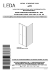 NOTICE DE MONTAGE POUR ARTY PAROI FIXE POUR MONTAGE AVEC PORTES BATTANTES MONTAGE EN ANGLE (01)20000002085573(94)AllBlank Vitrage transparent ou serigraphie W23 blanc Profilés argent brillant, satiné, blanc ou noir mat PAROI FIXE POUR PORTES BATTANTES La société LEDA se réserve le droit d’apporter des modifications techniques sans préavis. NOTICE A CONSERVER PAR L’UTILISATEUR DU PRODUIT INSTRUCTIES TE BEWAREN DOOR DE CONSUMENT LEDA : Z.A. Du Bois Gasseau - CS 80004 SAMOREAU - 77215 AVON CEDEX TEL : 01 60 71 66 41 - FAX : 01 60 71 66 49 SS1/ARTY Janvier 2024 2000 2016 C1 C1 ARTY A Paroi Fixe C1min-max [mm] 70 657-687 75 707-737 80 757-787 F montage receveur voir pages concernées 2 3 8x40 3,5x32 DIN7982 4 11 10 12 5 13 6 14 857-887 100 957-987 120 1157-1187 7 15 8 9 L R 16 17 11mm 1 4x40 90 50mm 18 3,5x13 DIN7982 19 20 21 23 22 24 3,0 26 27 28 2,9x25 4x20 29 30 31 32 33 25 34 2,5 6mm 1 2 3 4 5 6 7 8 9 10 11 12 13 14 15 16 17 18 19 20 21 22 23 24 25 26 27 28 29 30 31 32 33 34 PORTES BATTANTES 8 8 4 2 2 2 2 1 1 2 2 6 6 6 1 2 2 2 2 1 2 – – – PAROI FIXE 4 4 – – – – – – – – – 3 3 3 – – – – – – – 1 1 1 1+1 1 1 1 1 1 1 1 1 1 2 – – – – – – – – – – NE SILICO E IN VASEL EL ProLEV H2O 2m 2.5 2.8 4 8 ProKNIFE ENTRETIEN NE PAS UTILISER DE PRODUITS ABRASIFS pour nettoyer la paroi NOTICE: a. Lire attentivement la notice avant installation. Vérifier tous les éléments de la liste ci-dessus. b. Préparez toutes les pièces et les outils dont vous aurez besoin et installer le produit en suivant les étapes d’instructions. ONDERHOUD Gebruik geen agressieve, schurende onderhoudsproducten voor de reiniging van het scherm. Notitie a. Lees aandachtig de handleiding alvorens aan te vangen met de montage. Kijk na of alle onderdelen van onderstaande lijst aanwezig zijn. b. Leg alle materialen en werkgerief klaar en start met de installatie door de verschillende stappen van het montagevoorschrift te volgen. A ProLEVEL ProLEVEL Pro LE VE L Pro LE VE L 3 ARTY B (L) L (R) 1 1 6 6 2 2 7 7 8 9 L L 4 R R R C (L) pour faciliter le coulissement mettre du liquide vaisselle, savon ou spray graisse silicone. INTERIEUR 16 11 16 (R) INTERIEUR 16 11 4 3 4 3 5 ARTY D (L) 4 (R) 3 5 5 9 2 2 3 3 5 VA S EL 6 IN E 1 9 E (L) (R) 18 3 1 18 19 2 H2O 20 3 18 18 3 18 7 ARTY F 5 1 12 x4 3 4 ProLEVEL x4 10 24 12 2 9 2 x -ma Cmin 7 2 24 10 23 8 23 23 Bm in-m ax 11 B 1 A ou 1 27 27 26 26 28 2,5 4 Z Z 26 Z ax in-m Cm 9 Z [mm] Paroi fixe-70 670-700 580 Paroi fixe-75 720-750 630 Paroi fixe-80 770-800 680 Paroi fixe-90 870-900 780 Paroi fixe-100 970-1000 880 Paroi fixe-120 1170-1200 1080 S 8 x3 2 x3 1 A E ON C ILI 24 Cmin-max [mm] 13 B 1 Portes battantes-80 Z A ou B DIFFÉRENTES POSSIBILITÉS 8 Bmin -ma x ProLEVEL 10 x4 6 8 Bmin-max [mm] 770-800 Portes battantes-90 870-900 Portes battantes-100 970-1000 Portes battantes-110 1070-1100 Portes battantes-120 1170-1200 10 G 1 8 x2 1 2 ~1 80 mm 2 32 25 L=1100 31 130 3 2008 ProLEVEL 6b 3 5 4 14 6a 25 L=180 mm 10 6 x2 9 ARTY H 4 31 29 29 2 30 Z Z= 2m 34 4 7 33 25 22 d c 33 8 ProLEVEL 29 30 25 L=2200 x2 3 34 b /d 32 3 b 1 a 5 25 L=180 Z+ 4m m 34 6 x2 a /c 34 10 I 2 2 1 NE CO LI SI E ON IC L SI 11 ARTY J 14 2.8 12 13 3.1 3.5 2 3.4 3.2 1 3.6 3.3 21 1 Pro 2 18 2 1 21 12 LEV EL K SI SI NE LI O C LI NE O N E SILIC CO LI SI C ONE 6 6 SIL ICO NE ICO NE SIL 5 18 1 15 17 SI 4 LI C 9 O 12 12 9 N E 15 L= 2m 2 15 0 L+1 3 L 13 PIÈCES DE RECHANGE / ONDERDELEN Consulter votre revendeur pour toute commande de pièces détachées / Raadpleeg uw verdeler voor elke bestelling van onderdelen PAROI FIXE POUR MONTAGE AVEC PORTE C2383 C2649 C2650 C2651 C2059 6 C2381 E1810 E1811 E1812 E1813 E1814 E1818 (70) (75) (80) (90) (100) (120) C2649 C2695 14 15 TRAITEMENT GLASS PROTECT Le revêtement Glass Protect est un traitement du verre qui facilite l’entretien des parois vitrées en limitant les dépôts de calcaire, de graisse et de saleté. Le traitement rend la surface du verre hydrophobe et oléophobe. Ainsi, les liquides ou substances aqueux et huileux ou gras sont repoussés et glissent à la surface sans laisser de traces. Le verre a donc des propriétés de déperlence à l’eau, ainsi qu’aux substances grasses, et de ce fait présente des caractéristiques anti calcaires. Le revêtement Glass Protect est si fin qu’il ne se voit pas à l’oeil nu, il ne modifie pas la transparence du verre : le seul effet visible révélant la présence de ce revêtement, c’est la formation de grosses gouttes d’eau qui glissent à la surface de la paroi et non la diffusion uniforme de milliers de gouttelettes d’eau qui s’accrochent et s’étalent sur la paroi. A la différence des verres non traités, les verres traités Glass Protect vont être beaucoup plus faciles à nettoyer. Cela ne signifie pas pour autant que les verres traités Glass Protect ne doivent pas être nettoyés. Il peut rester des résidus visibles sur le verre après l’utilisation de la douche, notamment de savon. Ces résidus seront plus ou moins importants, et les particules se détacheront plus facilement. Dans ce cas-là, afin d’assurer la longévité du traitement des parois de douche, il faut absolument respecter les conseils d’entretien et éviter d’utiliser : - des poudres et des crèmes abrasives - des nettoyants alcalins - des nettoyants caustiques - des produits acides - des nettoyants désinfectants - des nettoyeurs vapeur Ces produits agressifs ne sont pas utiles puisque l’entretien s’effectue très facilement avec des produits doux comme les nettoyant neutres qui lavent mais n’attaquent pas le revêtement protecteur des parois de douche. ENTRETIEN - NE PAS UTILISER DE PRODUITS ABRASIFS OU SOLVANTS. ZA du bois Gasseau CS 80004 SAMOREAU 77215 AVON CEDEX France Tél. : 01 60 71 66 41 - Fax : 01 60 71 66 49 - [email protected] 175-0699A-ML-LED, PD 01/2024 - Il est possible que le traitement anti-calcaire laisse des traces sur les vitrages, nous vous conseillons d