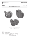 Hypro série 9000 Formulaire L-1562 Rév. A Manuel d’utilisation original CONSERVER POUR RÉFÉRENCE ULTÉRIEURE 9000C-O, 9000C-SP & 9000P-O Pompes centrifuges de séries fonte et polypropylène Pentair 375 5th Ave., New Brighton, MN 55112 Téléphone : +1 651 766-6300 -OU- +1 800 424-9776 Fax : +1 800 323-6496 www.hypropumps.com Représentant autorisé UE : CE REP QNET BV Hommerterweg 286 6436 AM Amstenrade, Pays-Bas KvK Zuid-Limburg 14091511 Table des matières Langues de l’UE......................................................................................................................................................................3 Introduction..............................................................................................................................................................................4 Description..................................................................................................................................................................4 Usages prévus............................................................................................................................................................4 Objectif du manuel......................................................................................................................................................4 Mauvais usages..........................................................................................................................................................4 Identification de la pompe...........................................................................................................................................5 Données techniques de la pompe..............................................................................................................................5 Applications de pompage de fluides...........................................................................................................................8 Outils...........................................................................................................................................................................8 Levage, transport et stockage intermédiaire...............................................................................................................8 Assemblage et installation.......................................................................................................................................................9 Assemblage................................................................................................................................................................9 Installation...................................................................................................................................................................9 Diagramme de plomberie.........................................................................................................................................10 Mise en service, démarrage, fonctionnement et mise hors tension......................................................................................13 Informations..............................................................................................................................................................13 Démarrage, fonctionnement et mise hors tension....................................................................................................13 Maintenance et entretien.......................................................................................................................................................15 Informations..............................................................................................................................................................15 Mise au rebut............................................................................................................................................................15 Nettoyage.................................................................................................................................................................15 Maintenance, entretien courant et inspection...........................................................................................................15 Dépannage...............................................................................................................................................................16 Pièces de rechange..................................................................................................................................................17 Déclaration d’incorporation....................................................................................................................................................19 Garantie.............................................................................................................................................................. Dernière page -2- Langues de l’UE DO NOT attempt to install or operate your pump before reading the manual. Original copies of the manual for Hypro pumps are provided in English. To find a copy in your native language, go to www.hypropumps.com. Vor dem Ablesen des Handbuches versuchen Sie NICHT, Ihre Pumpe zu installieren. Originale des Handbuches fur Hypro-Pumpen werden auf englisch zur Verfugung gestellt. Zu eine Kopie in Ihrer Muttersprache finden, zu www.hypropumps.com zu gehen (en allemand) N’essayez pas d’installer votre pompe avant de lire le manuel. Les exemplaires originaux du manuel pour les pompes Hypro sont fournis en anglais. Pour trouver un exemplaire dans votre langue maternelle, consultez le site www.hypropumps.com (en français) NON tentare di installare la vostra pompa prima di leggere il manuale. Esemplare originale del manuale per Hypro pompe sono in inglese. Per trovare una copia nella vostra lingua anda
