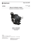 Hypro série 9307 Formulaire L-1552 Rév. B Manuel d’utilisation original CONSERVER POUR RÉFÉRENCE ULTÉRIEURE 9307C et 9307CWS Pompes centrifuges, série fonte Pentair 375 5th Ave., New Brighton, MN 55112 Téléphone : +1 651 766-6300 -OU- +1 800 424-9776 Fax : +1 800 323-6496 www.hypropumps.com Représentant autorisé UE : QNET BV Hommerterweg 286 6436 AM Amstenrade, Pays-Bas KvK Zuid-Limburg 14091511 CE REP Table des matières Langues de l’UE .....................................................................................................................................................................3 Introduction..............................................................................................................................................................................4 Description..................................................................................................................................................................4 Usages prévus............................................................................................................................................................4 Objectif du manuel......................................................................................................................................................4 Mauvais usages..........................................................................................................................................................4 Identification de la pompe...........................................................................................................................................5 Données techniques de la pompe...............................................................................................................................5 Applications de pompage de fluides...........................................................................................................................8 Outils...........................................................................................................................................................................8 Levage, transport et stockage intermédiaire...............................................................................................................9 Assemblage et installation.....................................................................................................................................................10 Assemblage..............................................................................................................................................................10 Installation.................................................................................................................................................................10 Diagramme de plomberie..........................................................................................................................................11 Mise en service, démarrage, fonctionnement et mise hors tension......................................................................................12 Informations..............................................................................................................................................................12 Démarrage, fonctionnement et mise hors tension....................................................................................................12 Maintenance et entretien.......................................................................................................................................................14 Informations..............................................................................................................................................................14 Mise au rebut............................................................................................................................................................14 Nettoyage..................................................................................................................................................................14 Maintenance, entretien courant et inspection...........................................................................................................14 Dépannage................................................................................................................................................................15 Pièces de rechange..................................................................................................................................................16 Déclaration d’incorporation....................................................................................................................................................19 Garantie..............................................................................................................................................................Dernière page -2- Langues de l’UE DO NOT attempt to install or operate your pump before reading the manual. Original copies of the manual for Hypro pumps are provided in English. To find a copy in your native language, go to www.hypropumps.com. Vor dem Ablesen des Handbuches versuchen Sie NICHT, Ihre Pumpe zu installieren. Originale des Handbuches fur Hypro-Pumpen werden auf englisch zur Verfugung gestellt. Zu eine Kopie in Ihrer Muttersprache finden, zu www.hypropumps.com zu gehen (en allemand) N’essayez pas d’installer votre pompe avant de lire le manuel. Des exemplaires originaux du manuel pour les pompes de Hypro sont fournis en anglais. Pour trouver un exemplaire dans votre langue maternelle, consultez le site www.hypropumps.com (en français) NON tentare di installare la vostra pompa prima di leggere il manuale. Esemplare originale del manuale per Hypro pompe sono in inglese. Per trovare una copia nella vostra lingua andare a www.hypropumps.com (en i