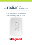 Prise intelligente, compatible avec Matter grâce au Wi-Fi avant de commencer Passer l’ensemble de ce guide en revue. En cas de question ou d’incertitude concernant vos capacités, consulter un électricien. Avertissement : Une installation inappropriée pourrait entraîner la mort, des blessures graves et (ou) des dommages à votre domicile ou à vos dispositifs. Attention : Pour réduire le risque de blessures et (ou) de surchauffe et de dommage à d’autre matériel : • Pour usage intérieur dans un endroit sec seulement. • Raccorder la prise intelligente UNIQUEMENT à une source d’alimentation de 125 VCA, 60 Hz. • Ne pas utiliser pour alimenter du matériel médical. • Ne convient pas comme moyen de débranchement. • Ne pas utiliser avec des charges dépassant la capacité de charge du dispositif. • Toujours utiliser un fil de cuivre pour installer l’interrupteur intelligent et respecter tous les codes de l’électricité locaux et nationaux applicables. ce dont vous avez besoin OUTILS REQUIS : Tournevis cruciforme Tournevis à tête plate AUTRES ÉLÉMENTS POUVANT ÊTRE REQUIS : Testeur de tension, pince, pince coupe-fils, pince à dénuder, ruban isolant, lampe de poche et connecteurs de fils Consulter le site www.legrand.us/radiant/smart-lighting/support pour obtenir du soutien. installation et configuration 1|m ettre le dispositif hors tension au disjoncteur Brancher une lumière ou un ventilateur dans la prise et mettre la lumière ou le ventilateur sous tension. Se rendre ensuite au disjoncteur et couper le courant du disjoncteur qui se raccorde à la prise. Vérifier que les DEUX prises sont maintenant hors tension. ON ON OFF ON OFF ON OFF ON OFF 1 OFF REMARQUE : S’assurer que tous les dispositifs du boîtier électrique sont hors tension. 2 VO TE LTA ST GE ER 2 | retirer le dispositif existant Vérifier les fils suivants : IL CHARGÉ ou FIL DE LIGNE : Reçoit le courant du boîtier de circuits A F électriques. Appelé fil « chargé » aux fins du présent guide. Ne pas toucher aux fils « chargés » ni les laisser entrer en contact avec d’autres fils. EUTRE : Crée un chemin pour renvoyer le courant à la source B N d’alimentation lorsque le dispositif est hors tension. Requis pour l’installation de votre prise. ISE À LA TERRE : Fournit un chemin sécuritaire à l’électricité en cas C M de court-circuit. 3 | raccorder la prise intelligente Lors du raccordement de chaque fil, desserrer la vis de la borne, insérer le fil dans une fente de la borne et serrer la vis de la borne jusqu’à ce que le fil soit bien fixé. 1. Insérer le fil neutre BLANC de la boîte dans la borne neutre 2. Insérer le fil CHARGÉ de la boîte dans la borne chargée 3. Enrouler le fil de mise à la terre VERT de la boîte autour de la vis de mise à la terre verte 4. Serrez toutes les bornes à vis à 12 in-lbs (1,4 Nm). Remarque : La prise peut être éventuellement câblée pour contrôler les prises en aval. Pour plus de renseignements, consulter la section des ressources de ce produit sur le site egrand.us/p/WWMRR15WH TERR E E NEU RE UT NE CH AR G CHAU D TR E N’utiliser que des fils en cuivre. 4 | fixer la prise intelligente Lors du raccordement de chaque fil, desserrer la vis de la borne, insérer le fil dans une fente de la borne et serrer la vis de la borne jusqu’à ce que le fil soit bien fixé. 1. Plier les fils dans le boîtier électrique en prenant soin de ne pas les pincer. 2. Utiliser les vis fournies pour fixer la prise intelligente au boîtier électrique. Ne pas serrer complètement les vis. Controlled 5 | mettre la prise intelligente à l’essai REMARQUE : Consulter la section « apprendre à connaître votre prise » pour plus de détails sur les caractéristiques. 1. Remettre le disjoncteur sous tension et vérifier que le voyant lumineux de la prise intelligente est allumé pour indiquer qu’elle est active. 2. Brancher une lampe ou un appareil dans la prise intelligente. 3. Appuyer sur le bouton marche/arrêt pour mettre sous tension la prise intelligente. La lampe ou l’appareil doit être alimenté. 4. Appuyer sur le bouton marche/arrêt pour mettre hors tension la prise intelligente. La lampe ou le dispositif devrait s’éteindre. OFF OFF OFF OFF OFF ON ON ON ON ON Remarque : La prise peut être éventuellement câblée pour contrôler les prises en aval. Pour plus de renseignements, consulter la section des ressources de ce produit sur le site egrand.us/p/WWMRR15WH CONSEIL DE DÉPANNAGE : Si le dispositif ne s’allume pas, consulter le site www.legrand.us/radiant/ smart-lighting/support pour obtenir du soutien. 6 | fixer la plaque murale tiliser les vis de la sous-plaque (fournies) pour fixer la sous-plaque à A U la prise intelligente. errer les vis fournies avec le dispositif pour fixer la prise intelligente au B S boîtier électrique. lacer l’extrémité supérieure de la plaque murale en angle sur C P le bord supérieur de la sous-plaque. Abaisser la plaque murale sans vis jusqu’à ce qu’elle « s’enclenche » en place sur la sous-plaque. REMARQUE : Pour retirer la plaque murale, placer la pointe d’un tournevis à tête plate dans la fente située sous la plaque murale et la faire tourner doucement. MOUNT OVER DEVICE THIS SIDE OUT MOUNT OVER DEVICE MOUNT OVER DEVICE 3 C Controlled Controlled Controlled THIS SIDE OUT B2 THIS SIDE OUT A1 7 | configurer votre prise compatible avec Matter Ce produit est certifié Matter et conçu pour être utilisé avec une plateforme de maison intelligente compatible avec Matter (Amazon Alexa, Google Home, Apple Home, Samsung SmartThings, etc.) 1. Un contrôleur compatible avec Matter (Home Hub/Admin) et une application de maison intelligente de la même plateforme sont requis pour la configuration. 2. Activer le Bluetooth et connecter au réseau Wi-Fi de 2,4 GHz de votre téléphone intelligent (les réseaux de 5 GHz ne sont pas pris en charge). 3. Ouvrir votre application de mais