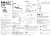 tibelec 3 Projecteur solaire LED à détecteur de mouvement réf. 356040 4. Installation ! Placez le panneau solaire à un endroit suffisamment exposé aux rayonnements du soleil pendant la journée (évitez les emplacements situés sous les arbres ou les endroits trop à l'ombre) 6,5cm Vue de profil support d'inclinaison du panneau solaire (3 positions) 10m maxi VIM: 20975_19W48 1. Votre produit : hauteur conseillée 2 à 3m Support mural Respectez les distances indiquées ci-dessus. Vérifiez qu'aucun obstacle ne se trouve dans la zone de couverture (arbre, buisson, ...). A installer hors de portée de bras. x2 x2 - choisissez un endroit pour l'installation - présentez le support de fixation - perçez les trous, installez les chevilles et fixez le support avec les vis fournies 5. Fonctionnement • Réglage de la cellule infrarouge : SENS • Chargement des accus : avant d’utiliser le projecteur, les accus doivent être chargés au maximum. Pour cela, positionnez l’inter sur OFF et laissez charger 2 jours en plein soleil. 2. Avant utilisation : • ATTENTION : la pile installée à l'intérieur n'est pas chargée ou très peu. Avant de commencer l'installation, laissez charger le projecteur pendant une journée entière et plus si nécessaire, en plein soleil pour un fonctionnement optimal. • Vous pouvez vérifier son bon fonctionnement en passant la main devant la cellule infrarouge, inter en position ON. • Il est conçu pour fonctionner dans le noir. S'il y a de la lumière, il fonctionnera faiblement ou ne fonctionnera pas du tout. • Il aura une plus grande autonomie d’éclairage les nuits d’été et une durée moindre en hiver. La durée d’éclairage est proportionnelle au nombre d’heures d’exposition au rayonnement direct du soleil. • Le panneau solaire doit être maintenu propre : toute pollution (poussière, neige,...) réduira son efficacité et augmentera le temps de recharge de l'accumulateur. • Bien qu'il soit protégé des projections d'eau, il est toujours recommandé de l'installer dans un endroit sous abri. • Ne jamais regarder la lumière LED directement. • Ne jamais l'installer et l'utiliser à côté de produits inflammables ou explosifs. • Ne l'ouvrez pas et ne le démontez pas. • Ne jamais l'installer dans l’eau et éviter une utilisation autour d’une piscine, fontaine ou autre source d’eau. • Ne pas essayer de le réparer vous-même. Cela doit être fait par le fabricant ou une personne compétente et autorisée. SENS TIME LUX • Inter on/off : - ON : la lumière s’allume automatiquement lorsqu’un mouvement est détecté - OFF : le projecteur est éteint 6. Caractéristiques techniques : Modèle WTT-1011 • Alimentation : 5V par panneau solaire • 2 accumulateurs Li-ion 2x2000mAh 3,7V, format 18650 (non remplaçable) • Autonomie : ~1H (allumage constant) / charge : ~10H • LED 8,5W, 620 lumens, blanc froid 6150°K, +/- 30000h • Interrupteur on/off • Portée de 1 à 10m, angle de détection 120° • Sensibilité et luminosité réglable • Temporisation réglable de 10 sec. à 1 min. • Dimensions : 210x250x335mm 7. Garantie : Certifié conforme aux normes européennes Notre service SAV est à votre disposition pour conseils et assistance, vous pouvez nous écrire à [email protected]. Toutes les notices de nos produits sont téléchargeables depuis notre site www.tibelec.fr Classe III, matériel alimenté sous une tension inférieure à 50 volts LUX - SENS : réglage de la sensibilité, vous pouvez régler la distance de déclenchement du détecteur. Dans le sens des aiguilles d’une montre, vous augmentez la sensibilité au mouvement, ainsi plus vous le tournez à droite, plus une personne éloignée en portée pourra être détectée. Au plus la portée est courte, au moins le projecteur se déclenchera de façon intempestive. - TIME : réglage de la temporisation, vous pouvez régler le temps d’éclairage de 10 sec. à 1 min., après avoir détecté un mouvement. - LUX : réglage de la luminosité, vous pouvez régler le degré d’obscurité à partir duquel votre projecteur va se déclencher. - vers le soleil : déclenchement le jour et la nuit - vers la lune : déclenchement que la nuit - entre le soleil et la lune : déclenchement à la tombée du jour. TIBELEC GARANTIT LA QUALITE ET LA FIABILITE DES COMPOSANTS DE CE PRODUIT ; IL FAIT PARTIE DES ARTICLES SOUS GARANTIE LEGALE D’UNE DUREE DE 2 ANS POUR DEFAUTS ET VICES CACHES CONFORMEMENT AUX ARTICLES 1641 A 1648 DU CODE CIVIL. Tibelec ne pourra pas être tenu responsable des dommages causés suite à une mauvaise utilisation, mauvais entretien, un détournement de l’utilisation de ce produit, l’usure normale, bris par chute, ouverture de l’appareil. Tibelec ne pourra pas accepter en retour les produits pour remplacement des consommables (lampes, transfo., verre) nécessaires à l’utilisation de ce produit. Le remplacement des consommables est à votre charge. Importé par Tibelec - 996 rue des Hauts de Sainghin - CRT4 - 59262 Sainghin en mélantois TIME INDICE DE PROTECTION 44: 1er chiffre : protégé des corps solides diamètre supérieur à 1mm 2ème chiffre : protégé des projections d'eau de toutes directions Collecte séparée : lors de la fin de vie du produit, les accumulateurs ne doivent pas être jetés dans la poubelle ordinaire. Il faut les retraiter dans des poubelles spécialement prévues à cet effet (accessibles en déchèterie municipale, lieux de vente...). Ne pas jeter les appareils portant ce symbole avec les ordures ménagères. Veuillez utiliser un point de collecte adapté. ">