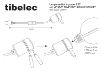 tibelec Lampe métal à poser E27 réf. 45500110-45500120/LHC-959-E27 VIM: 30270_23W41 1m50 Compatible LED et fluo 60W maxi Certifié conforme aux normes européennes Matériel de Classe II, dispensé de raccord à la terre Ne pas jeter les appareils portant ce symbole avec les ordures ménagères. Veuillez utiliser un point de collecte adapté. Tibelec garantit la qualité et la fiabilité des composants de ce produit : il fait partie des articles sous garantie légale d’une durée de 2 ans pour défauts et vices cachés conformément aux articles 1641 a 1648 du code civil. Notre service technique est à votre disposition pour conseils et assistance, vous pouvez nous écrire à [email protected]. Toutes les notices de nos produits sont téléchargeables depuis notre site www.tibelec.fr. Tibelec ne pourra pas être tenu responsable des dommages causés suite à une mauvaise utilisation, mauvais entretien, un détournement de l’utilisation de ce produit, l’usure normal, bris par chute, ouverture de l’appareil. Tibelec ne pourra accepter en retour les produits pour remplacement des consommables (lampes, transfo, verre…) nécessaires à l’utilisation de ce produit. Le remplacement des consommables est à votre charge. FR 996 rue des hauts de Sainghin - CRT4 59262 Sainghin en mélantois FRANCE. www.tibelec.fr ">