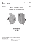 Hypro série 9305 Formulaire L-1551 Rév. A Manuel d’utilisation original CONSERVER POUR RÉFÉRENCE ULTÉRIEURE 9305C et 9305C-SP Pompes centrifuges, série fonte Pentair 375 5th Ave., New Brighton, MN 55112 Téléphone : +1 651 766-6300 -OU- +1 800 424-9776 Fax : +1 800 323-6496 www.hypropumps.com Représentant autorisé UE : QNET BV Hommerterweg 286 6436 AM Amstenrade, Pays-Bas KvK Zuid-Limburg 14091511 CE REP Table des matières Langues de l’UE......................................................................................................................................................................3 Introduction..............................................................................................................................................................................4 Description..................................................................................................................................................................4 Usages prévus............................................................................................................................................................4 Objectif du manuel......................................................................................................................................................4 Mauvais usages..........................................................................................................................................................4 Identification de la pompe...........................................................................................................................................5 Données techniques de la pompe..............................................................................................................................5 Applications de pompage de fluides...........................................................................................................................7 Outils..........................................................................................................................................................................7 Levage, transport et stockage intermédiaire..............................................................................................................7 Assemblage et installation.......................................................................................................................................................8 Assemblage................................................................................................................................................................8 Installation..................................................................................................................................................................8 Diagramme de plomberie...........................................................................................................................................9 Mise en service, démarrage, fonctionnement et mise hors tension......................................................................................11 Informations..............................................................................................................................................................11 Démarrage, fonctionnement et mise hors tension....................................................................................................11 Maintenance et entretien.......................................................................................................................................................13 Informations..............................................................................................................................................................13 Mise au rebut............................................................................................................................................................13 Nettoyage.................................................................................................................................................................13 Maintenance, entretien courant et inspection...........................................................................................................13 Dépannage...............................................................................................................................................................14 Pièces de rechange..................................................................................................................................................15 Déclaration d’incorporation....................................................................................................................................................19 Garantie..............................................................................................................................................................Dernière page -2- Langues de l’UE DO NOT attempt to install or operate your pump before reading the manual. Original copies of the manual for Hypro pumps are provided in English. To find a copy in your native language, go to www.hypropumps.com. Vor dem Ablesen des Handbuches versuchen Sie NICHT, Ihre Pumpe zu installieren. Originale des Handbuches fur Hypro-Pumpen werden auf englisch zur Verfugung gestellt. Zu eine Kopie in Ihrer Muttersprache finden, zu www.hypropumps.com zu gehen (en allemand) N’essayez pas d’installer votre pompe avant de lire le manuel. Des exemplaires originaux du manuel pour les pompes de Hypro sont fournis en anglais. Pour trouver un exemplaire dans votre langue maternelle, consultez le site www.hypropumps.com (en français) NON tentare di installare la vostra pompa prima di leggere il manuale. Esemplare originale del manuale per Hypro pompe sono in inglese. Per trovare una copia nella vostra lingua andare a www.hypropumps.com (en ita