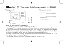 Thermostat digital programmable réf. 986630 Votre produit : Vous aurez besoin : 1 P Set At Température + une perçeuse x2 x2 Avant de commencer l’installation... • Coupez toujours le courant à votre tableau électrique. • Cet appareil n’est pas prévu pour être utilisé par des personnes (y compris les enfants) dont les capacités physiques, sensorielles ou mentales sont réduites, ou des personnes dénuées d’expérience ou de connaissance, sauf si elles ont pu bénéficier, par l’intermédiaire d’une personne responsable de leur sécurité, d’une surveillance ou d’instructions préalables concernant l’utilisation de l’appareil. Il convient de surveiller les enfants pour s’assurer qu’ils ne jouent pas avec l’appareil. • Si vous avez des doutes ou des problèmes, consultez un électricien. 1 1. Sommaire : • Caractéristiques techniques • Garantie • Installation des piles • Réglage du jour et de l’heure • Réglage de la programmation • Fonction «copie» • Fonction manuelle • Réglage des températures «confort» et «économique» • Rétro éclairage • Mode (réglage technique) • Verrouillage des touches • Mode de fonctionnement • Remise à zéro (reset) • Indicateur batteries faibles • Raccordement électrique • Fixation 2. Des page 4 page 5 page 6 page 7 page 8 à 17 page 18 page 19, 20 page 21 page 21 page 22, 23 page 24 page 24 page 25 page 25 page 26, 27 page 28 1 2 3 4 5 6 7 2 2. Description : 20 22 21 1 2 3 4 5 6 7 2 1 2 3 4 Set At 5 6 P 7 Temperature Hold Holiday RESET HOLD DAY LIGHT MODE COPY PROG 8 9 10 11 12 13 LOCK SET 14 15 1. Jours de la semaine 2. Heure 3. Indicateur mode manuel 4. Température programmée 5. Marche forcée temporaire 19 6. Chauffage en fonctionnement 18 7. Indicateur batterie faible 8. Réglage mode manuel 17 9. Réglage du jour et de l’heure 10. Rétro éclairage bleu 16 11. Touche de réglages techniques 12. Touche copie 13. Touche programme 14. Verrouillage des touches 15. Touche de validation 16. Touche de remise à zéro 17. Température ambiante 18. Touche de réglage «-» 19. Touche de réglage «+» 20. Numéro du programme 21. Mode climatisation 22. Indicateur de verrouillage des touches 3 3. Caractéristiques techniques : 4. Gar Modèle S2302 : • Alimentation : 2 piles LR03/AAA 1,5V non fournies - 230V~, 50-60Hz, 6(2)A • Indicateur batteries faibles • Charge admissible : 1380W maxi • Courant de sortie : 6A maxi 230V • Consommation : 17µA, rétro-éclairage 4,2mA • Affichage de la température : 0°C à 40°C • Plage de réglage de température : 5°C à 35°C • Précision de régulation : +/- 0,5C° • Dimensions : 26x119x80mm BIEN Q DE CE LA GA CONFO EST A ECRIRE Tibelec utilisati male, b les pro à l’utilis Toutes Importé par Tibelec - 996 rue des hauts de Sainghin - CRT4 - 59262 Sainghin en mélantois. Dans le souci d’une amélioration constante de nos produits, nous nous réservons le droit d’apporter à leurs spécifications toutes modifications liées à l’évolution technique (décret du 24-03-1978). IMPORTANT: Ces instructions sont pour votre sécurité. Lisez les attentivement avant utilisation et conservez les pour une consultation ultérieure. 4 4. Garantie : BIEN QUE TIBELEC GARANTISSE LA QUALITE ET LA FIABILITE DES COMPOSANTS DE CE PRODUIT ; IL NE FAIT PAS PARTIE DES ARTICLES SOUS GARANTIE EXCEPTE LA GARANTIE LEGALE D’UNE DUREE DE 2 ANS POUR DEFAUTS ET VICES CACHES CONFORMEMENT AUX ARTICLES 1641 A 1648 DU CODE CIVIL. NOTRE SERVICE SAV EST A VOTRE DISPOSITION POUR CONSEILS ET ASSISTANCE, VOUS POUVEZ NOUS ECRIRE à [email protected]. Tibelec ne pourra pas être tenu responsable des dommages causés suite à une mauvaise utilisation, mauvais entretien, un détournement de l’utilisation de ce produit, l’usure normale, bris par chute, ouverture de l’appareil. Tibelec ne pourra pas accepter en retour les produits pour remplacement des consommables (lampes, transfo., verre) nécessaires à l’utilisation de ce produit. Le remplacement des consommables est à votre charge. Toutes les notices de nos produits sont téléchargeables depuis notre site www.tibelec.fr. Certifié conforme aux normes européennes vant 4 Matériel de classe II, double isolation, dispensé de raccord à la terre Les produits électriques usagés ne doivent pas être jetés avec les ordures ménagères. Veuillez utiliser les aménagements spécifiques prévus pour les traiter. Renseignez-vous auprés des autorités locales ou du revendeur pour obtenir la marche à suivre en matière de recyclage. 5 + - + LR03/AAA 1,5V - - LR03/AAA 1,5V - + 6. Rég + 5. Installation des piles Les réglages (heure, programmation,...) peuvent être fait sans connexion à la chaudière. Déclipsez la facade et installez les 2 piles LR03/AAA 1,5V non fournies en respectant la polarité. Le thermostat est maintenant en fonction, vous pouvez effectuer la programmation. 6 6. Réglage du jour et de l’heure le jour 1 clignote sélectionnez de 1 à 7* l’heure clignote sélectionnez de 0 à 23 les minutes clignotent sélectionnez de 0 à 59 DAY DAY DAY validation des réglages (ou validation automatique après 15 secondes) udière. ctant ogram6 SET * 1 = lundi, 2 = mardi, 3= mercredi, ..., dimanche = 7 SET 7 SET 7. Réglage de la programmation Ce thermostat propose 4 types de programmation : - à la journée (1 ou 2 ou 3... 7) - du lundi au vendredi (1 2 3 4 5) - le week end (6 7) - la semaine entière (1 2 3 4 5 6 7). Lexique : d. SET SET appui 1x appui maintenu e. SET Important : quelque soit votre programmation, il est impératif de régler 6 programmes SET par jour (P1, P2,..., P6). sélectionnez : -12345 ou les jours de -67 ou a. la semaine + PROG - 1 2 3 4 5 6 7 ou SET clignotent - 1 ou 2 ou 3 ou ...7 b. c. l’heure clignote PROG PROG la température clignote réglez l’heure de début du 1er programme (par tranche de 10mn) f. g. P1 réglez la température de P1 h. reco i. 8 d.