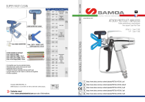 Code 18280: GUARNITURE Code 18270: SUPER FASTCLEAN support UE 11/16x16 FILTRE CROSSE DU PISTOLET Code 11039: Vert (30M) Code 11038: Blanc (60M) - Fourni Code 11037: Jaune (100M) - Fourni Code 11019: Rouge (200M) - Fourni • Compatible avec tous les pistolets Airless • Remplacement rapide de la buse de travail • Nettoyage facile et sécurisé • Pression de travail maximale 350 bars (5075 psi) • Longue durée de vie de l’insert en carbure de tungstène • Finition excellente 0,009’’ Filtre Tip. produits cons. Peintures transp. 0,18 Rouge et pigmentées, 200 M vernis fins 0,23 0,011’’ 0,28 0,013’’ 0,33 0,015’’ 0,38 0,007’’ Peintures nitro, synthétiques et polyuréthane Jaune 100 M ED. 13 - 01/2024 Ø Ø mm pouces Anti-rouille 0,017’’ 0,43 0,019’’ 0,48 0,021’’ 0,53 0,023’’ 0,58 0,025’’ 0,63 0,027’’ 0,68 0,74 0,031’’ 0,79 0,033’’ 0,83 0,035’’ 0,037’’ 0,89 0,94 0,039’’ 1,00 0,041’’ 1,05 0,043’’ 1,10 0,045’’ 0,047’’ 0,15 1,20 0,051’’ 1,30 www.larius.com AT300 PISTOLET AIRLESS Pistolet professionnel à haute pression Avec support Super Fast-Clean M16x1,5 - Code 11000 1/4” - Code 11090 Fonds, zinc non-organique, peinture à l’eau Blanc 60 M 0,029’’ FR Thixotropiques, stucs à pulvériser, haut solide, vernis avec colles, vernis de remplissage Vert 30 M MANUEL D’INSTRUCTIONS BUSE SUPER FAST-CLEAN *Cod. buse angle SFC07-20 SFC07-40 SFC09-20 SFC09-40 SFC11-20 SFC11-40 SFC13-20 SFC13-40 SFC13-60 SFC15-20 SFC15-40 SFC15-60 SFC17-20 SFC17-40 SFC17-60 SFC19-20 SFC19-40 SFC19-60 SFC21-20 SFC21-40 SFC21-60 SFC23-20 SFC23-40 SFC23-60 SFC25-20 SFC25-40 SFC25-60 SFC27-20 SFC27-40 SFC27-60 SFC27-80 SFC29-20 SFC29-40 SFC29-60 SFC29-80 SFC31-40 SFC31-60 SFC31-80 SFC33-40 SFC33-60 SFC33-80 SFC35-40 SFC37-40 SFC39-40 SFC39-60 SFC39-80 SFC41-40 SFC43-40 SFC43-60 SFC43-80 SFC45-60 SFC47-60 SFC51-60 SFC51-80 Cod. 150171 SUPER FAST-CLEAN IT https://www.larius.com/wp-content/uploads/PISTOLA-AT300_I.pdf ©Copyright, SAMOA INDUSTRIAL, S.A. SAMOA Industrial, S.A. is an ISO 9001, ISO 14001 and ISO 45001 certified company. Contactez-nous! Visitez www.samoaindustrial.com pour plus d’informations. EN https://www.larius.com/wp-content/uploads/PISTOLA-AT300_GB.pdf DE https://www.larius.com/wp-content/uploads/PISTOLA-AT300_D.pdf FR https://www.larius.com/wp-content/uploads/PISTOLA-AT300_F.pdf ES https://www.larius.com/wp-content/uploads/PISTOLA-AT300_E.pdf Pos. Code Description Pos. Code Description A 1 2 3 4 5 6 7 Voir tab.* 18270 18280 11004 11005 11008 11007 11021 16 17 18 19 20 11018 11006 11017 32010 11015 10155 11027 Filtre Poignée Protection pour les mains Ressort Rondelle Raccord articulé M16x1,5 Raccord articulé 1/4” Écrou de sécurité 8 11035 9 10 11 12 13 14 15 11023 11024 11025 11026 11028 11029 11020 Buse Super Fast Clean Corps Super Fast Clean Joint Super Fast Clean Manchon Pointeau Détente pistolet Corps Fiches Ressorts Bauer Le kit compte 8 ressorts Cale Manchon de tenue Vis presse-manchon Plaque Ressort Bouton de réglage Joint 21 22 13 10 11 12 9 8 6 4 18 15 A 5 2 16 1 17 Pos. Description 40020 3,4 Kit AT 300 Code kit Pos. Description 40015 8, 9, 10, 2x(15) Kit joint AT 300 22 7 3 Code kit AT300 PISTOLET AIRLESS 14 haute pression 19 - NE PAS placer les mains et les doigts devant la buse - NE PAS pointer le pistolet vers soi ou vers d’autres personnes - Décharger la pression dans le pistolet et utiliser les sécurités appropriées lorsque l’opérateur ne travaille pas - NE PAS couper ou retirer les protections spécifiques de l’appareil Filtre pistolet : pour les matériaux bruts ou hautement visqueux utilisez les buses ayant un diamètre minimal de 0,018’’, et nous vous conseillons d’utiliser des filtres de 50 Mesh. Pour les matériaux fins et fluides, utiliser des filtres de 200 Mesh. Les filtres peuvent être nettoyés avec un pinceau et un liquide spécifique pour le nettoyage. Ne pas racler avec des outils coupants. Nettoyage du filtre : dévisser manuellement la poignée du pistolet (si besoin, utiliser une clé appropriée et extraire entièrement le filtre). Insérer le nouveau filtre comme l’indique le dessin. 20 21 Pression max 400 bars bar ">