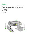Manuel Préhenseur de sacs léger LBG-50 Ce manuel est disponible dans les langues suivantes sur piab.com Anglais Espagnol Portugais Allemand Français Italien Polonais Suédois Manuel LBG-50 Page 2 Sommaire 1 Présentation du manuel ............................................................................................................ 5 1.1 À propos de ce manuel......................................................................................................................................................5 1.2 Symboles de sécurité utilisés dans le manuel.............................................................................................................5 1.3 Groupe cible .........................................................................................................................................................................6 1.4 Conformité ........................................................................................................................................................................... 7 2 Déclaration d’incorporation de quasi-machine .................................................................... 8 3 Sécurité ..................................................................................................................................... 9 3.1 Sécurité générale ...............................................................................................................................................................9 3.2 Utilisation sécurisée ....................................................................................................................................................... 10 3.3 Utilisation prévue ............................................................................................................................................................. 13 3.4 Utilisation inadaptée........................................................................................................................................................ 13 3.5 Exigences R.E.S.S. appliquées et respectées ........................................................................................................... 13 4 Présentation du préhenseur de sacs LBG-50 ...................................................................... 17 4.1 Fabricant ...................................................................................................................................................... 17 5 Vue d’ensemble ...................................................................................................................... 18 5.1 Zones dangereuses ..........................................................................................................................................................19 5.2 Pièces liées à la sécurité ................................................................................................................................................ 21 6 Caractéristiques techniques .................................................................................................. 22 6.1 Spécification de l’interface robot ............................................................................................................................... 23 6.2 Capteur de présence de sac à ultrasons ................................................................................................................... 24 6.3 Capteurs de vérin ............................................................................................................................................................ 27 7 Fonction ...................................................................................................................................28 7.1 Modes opératoires ..................................................................................................................................... 29 8 Installation................................................................................................................................ 31 8.1 Conditions environnementales ..................................................................................................................................... 31 8.2 Installation mécanique .................................................................................................................................................... 31 8.3 Changement de taille ..................................................................................................................................................... 32 8.4 Raccordement de l’installation pneumatique .......................................................................................................... 34 8.5 Caractéristiques des électrovannes ........................................................................................................................... 35 8.6 Raccordement/installation électrique ....................................................................................................................... 35 8.7 Contrôles préparatoires................................................................................................................................................. 35 8.8 Test du préhenseur à vide............................................................................................................................................. 36 8.9 Test du préhenseur avec charge ................................................................................................................................. 36 8.10 Programmation du capteur de présence de sac ..................................................................................................... 36 Manuel LBG-50 Page 3 9 Dépannage ............................................................................................................................... 39 10 Entreti