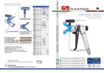 BUSE SUPER FAST-CLEAN Code 18280: GUARNITURE Code18270: SUPER FAST-CLEAN support UE 11/16x16 FILTRE CROSSE DU PISTOLET Code 11039: Vert (30M) Code 11038: Blanc (60M) - en dotation Code 11037: Jaune (100M) - en dotation Code 11019: Rouge (200M) - en dotation • Compatible avec tous les pistolets Airless • Remplacement rapide de la buse de travail • Nettoyage facile et sécurisé • Pression de travail maximale 350 bars (5075 psi) • Longue durée de vie de l’insert en carbure de tungstène • Finition excellente REV. 04 - 05/2024 Cod. 150081 *Cod. buseØ Filtre Ø mm Tip. produits angle pouces cons. SFC07-20 Peintures transp. 0,007’’ 0,18 Rouge et pigmentées, SFC07-40 200 M vernis fins SFC09-20 0,009’’ 0,23 SFC09-40 SFC11-20 Peintures 0,011’’ 0,28 SFC11-40 nitro, synthétiques SFC13-20 SFC13-40 0,013’’ 0,33 et polyuréthane SFC13-60 Jaune 100 M SFC15-20 SFC15-40 0,015’’ 0,38 SFC15-60 Anti-rouille SFC17-20 SFC17-40 0,017’’ 0,43 SFC17-60 SFC19-20 SFC19-40 0,019’’ 0,48 SFC19-60 Fonds, SFC21-20 zinc SFC21-40 0,021’’ 0,53 non-organique, peinture à l’eau SFC21-60 SFC23-20 SFC23-40 0,023’’ 0,58 SFC23-60 SFC25-20 SFC25-40 0,025’’ 0,63 SFC25-60 SFC27-20 SFC27-40 0,027’’ 0,68 SFC27-60 Blanc SFC27-80 60 M SFC29-20 SFC29-40 0,029’’ 0,74 SFC29-60 SFC29-80 Thixotropiques, SFC31-40 stucs à SFC31-60 0,031’’ 0,79 pulvériser, SFC31-80 haut solide, SFC33-40 vernis avec SFC33-60 0,033’’ 0,83 colles, SFC33-80 vernis SFC35-40 0,035’’ 0,89 de remplissage SFC37-40 0,037’’ 0,94 SFC39-40 SFC39-60 0,039’’ 1,00 SFC39-80 SFC41-40 0,041’’ 1,05 SFC43-40 SFC43-60 0,043’’ 1,10 SFC43-80 Vert 30 M SFC45-60 0,045’’ 0,15 SFC47-60 0,047’’ 1,20 SFC51-60 0,051’’ 1,30 SFC51-80 FR www.larius.com AT250 PISTOLET AIRLESS Pistolet professionnel à haute pression avec support Super Fast-Clean MANUEL D’INSTRUCTIONS SUPER FAST-CLEAN IT https://www.larius.com/wp-content/uploads/PISTOLA-AT250_I.pdf ©Copyright, SAMOA INDUSTRIAL, S.A. EN https://www.larius.com/wp-content/uploads/PISTOLA-AT250_GB.pdf SAMOA Industrial, S.A. is an ISO 9001, ISO 14001 and ISO 45001 certified company. DE https://www.larius.com/wp-content/uploads/PISTOLA-AT250_D.pdf FR https://www.larius.com/wp-content/uploads/PISTOLA-AT250_F.pdf Contactez-nous! Visitez www.samoaindustrial.com pour plus d’informations. ES https://www.larius.com/wp-content/uploads/PISTOLA-AT250_E.pdf PT https://www.larius.com/wp-content/uploads/PISTOLA-AT250_PT.pdf Entrée PISTOLET AT250 - FAST CLEAN Code Europe Code Amérique M16x1.5 11200 - 1/4 BSP 11250 - 1/4 NPSM 11255 11257 AT250 PISTOLET AIRLESS Pos. Code Description Pos. Code Description A Réf. tab.* 18270 18290 18280 11004R 11217 11006 Réf. kit 40005 ou 40006 11008 11206 Buse Super Fast Clean Corps Super Fast Clean Corps Super Fast Clean Amérique Joint Super Fast Clean Manchon complet Manchon complet Amérique Protection mains 8 11207 Réf. kit 40462 11209 11020 11037 Fiche 11038 11019 11018R 11017R 32010 11015 10152R 10155R Filtre Pistolet Blanc 60 Mes Filtre Pistolet Rouge 200 Mesh Poignée Ressort Joint en cuivre Raccord rotatif M16x1,5 Raccord articulé 1/4’’ NPSM Raccord articulé 1/4’’ GAS 1 2 3 4 5 6 6a 6b 6c 6d 6e 6f 6g 7 Pointeau complet Détente complète Manette de sécurité Rondelle de freinage Détente Pivot Fiche Pivot Écrou Corps pistolet 9 10 11 12 13 14 15 16 haute pression Plaque Écrou Joint Filtre Pistolet Jaune 100 Mesh - NE PAS placer les mains et les doigts devant la buse - NE PAS pointer le pistolet vers soi ou vers d’autres personnes - Décharger la pression dans le pistolet et utiliser les sécurités appropriées lorsque l’opérateur ne travaille pas - NE PAS couper ou retirer les protections spécifiques de l’appareil 10 8 9 7 6 11 5 4 6g 3 6f 6g A 6a 6b 6c 6d 6e 2 1 6b 6a Filtre pistolet : pour les matériaux bruts ou hautement visqueux utilisez les buses ayant un diamètre minimal de 0,018’’, et nous vous conseillons d’utiliser des filtres de 60 Mesh. Pour les matériaux fins et fluides, utiliser des filtres de 200 Mesh. Les filtres peuvent être nettoyés avec un pinceau et un liquide spécifique pour le nettoyage. Ne pas racler avec des outils coupants. Nettoyage du filtre : dévisser manuellement la poignée du pistolet (si besoin, utiliser une clé appropriée et extraire entièrement le filtre). Insérer le nouveau filtre comme l’indique le dessin. 12 13 Code kit Pos. Description 14 40005 3, 5 Kit AT250 15 40006 3, 5 Kit AT250 Amérique 16 40462 8, 9, 10 Kit Plaque Pression max 250 bar ">