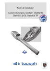 Notice d´installation Automatisme pour portails à battants SWING-X (HD), SWING X TP Safety Sensor Avertissements et indications de sécurité • La présente instruction de montage et mode d‘emploi est une partie intégrante du produit „opérateur pour portails“, s‘adresse exclusivement à un personnel qualifié et devrait être lue attentivement et en entier avant le montage. Elle ne concerne que l‘opérateur pour portails et non l‘installation générale pour le portail automatique. Le manuel d‘instructions doit être remis à l‘exploitant après le montage. • Montage, branchements, mise en service et entretien ne doivent être effectués que par un personnel qualifié et en tenant compte des instructions de montage et les normes valables. Une mauvaise installation peut mener à des blessures et dommanges de matériel ! • Il faut observer et respecter la Directive sur les machines ainsi que les instructions concernant la prévention des accidents, de même que les normes CEE et les normes nationales respectivement en vigueur. • La société TOUSEK Ges.m.b.H. [Sarl] ne peut être tenue responsable du non-respect des normes lors du montage ou du fonctionnement de l‘installation. • Le matériel d‘emballage (plastique, styropore, etc.) doit être éliminé conformément au règlement. Il constitue une source de danger pour les enfants et doit pour cela être entreposé hors de leur portée. • Le produit ne doit pas être installé dans des endroits à risque d‘explosion. • Le produit ne doit être employé que pour l‘usage prévu; il a été développé exclusivement pour l‘utilisation décrite dans ce manuel d‘instructions. La société TOUSEK Ges.m.b.H. décline toute responsabilité en cas d‘usage non approprié. • Avant de commencer l‘installation, il faut vérifier si les composants mécaniques, tels vantaux du portail, rails de guidage, etc., sont suffisamment solides. • L‘installation électrique doit être effectuée conformément aux prescriptions respectivement en vigueur, comme par exemple avec disjoncteur de protection, mise à la terre, etc • Il faut prévoir un interrupteur/sectionneur omnipolaire avec une distance d‘ouverture des contacts d‘au moins 3mm. • les dispositifs de sécurité (cellules photoélectrique, barre palpeuse, interrupteur STOP etc...) doivent correspondre aux normes et directives en vigueur, aux règles de conduite, à l´environnement de montage, à la logique de fonctionnement/marche et aux forces produites par le portail. • Les dispositifs protecteurs doivent éviter des possibles dangers génerals, d´écrasement, de tonsure etc du portail motorisé. • Une fois l’installation effectuée, il faut absolument s’assurer du bon fonctionnement du produit et des dispositifs de sécurité. • Après la mise en service, le système de portail doit être testé avec un dispositif de mesure de force approprié conformément aux normes applicables EN 12453 ou aux réglementations nationales. • Placer des indications d´avertissement selon les directives en vigueur. • Pour chaque installation il faut placer les dates d´identification du portail motorisé visible sur le site. • Une pancarte pour l´émetteur manuel doit être placer près de son secteur d´activité. • Le moteur électrique dégage de la chaleur lors du fonctionnement. Par conséquence il ne faut toucher l‘appareil que lorsque celui-ci s‘est refroidit. • Durant la marche de l´installation en mode Totmann (=homme présent; interrupteur avec préréglage éteint) veiller à ce qu´il y a personne près du portail motoriséS-Voreinstellung). L´ interrupteur avec préréglage éteint doit être installé à portée de vue du portail mais pas à côté de élements qui se bougent. Cet interrupteur doit être installé dans une hauteur d´au moins 1,5m et pas accessible au public . • Dans ce sens, les enfants doivent absolument être informés du fait que l’installation et les dispositifs qui en font partie ne sont pas destinés à un usage abusif (par ex. le jeu). Il faut en outre veiller à garder les télécommandes en lieu sûr et à installer d’autres émetteurs d’impulsions tels boutons et interrupteurs hors de la portée des enfants • En cas de réparation il ne faut utiliser que des pièces de rechange originales. • La société TOUSEK Ges.m.b.H. décline toute responsabilité en cas d‘utilisation de composants non conformes aux consignes de sécurité. • La société de montage/installateur doit remettre à l‘utilisateur toutes les informations relatives au mode de fonctionnement automatique de l‘ensemble de l‘installation pour portails ainsi que le fonctionnement d‘urgence de l‘installation. L‘utilisateur de l‘installation doit aussi recevoir toutes les consignes générales de sécurité concernant le fonctionnement de l‘automatisme pour portails. L‘instruction de montage et le mode d‘emploi doivent également être remis à l‘utilisateur. • L ´utilisateur doit être informer qu´au cas de dérangement du produit il faut éteindre l´interrupteur principal. L´installation peut être mise en marche seulement après les travaux de réglage/réparation ont éte effectués. • Faites attention à ce que la plaque numérotée avec le numéro du moteur ne soit pas pas enlevée ou abîmée, car sinon la réclamation de garantie n´est plus valable! Maintenance • Débranchez l’alimentation électrique pendant les travaux d’installation, de maintenance ou de réparation. • Les travaux d‘entretien doivent être effectués uniquement par quelqu´un de qualifié. • Lors de chaque entretien, le système de portail doit être vérifié à l’aide d’un appareil de mesure de force approprié, conformément aux normes en vigueur EN 12453 ou aux réglementations nationales. • Vérifier le fonctionnement du déverrouillage de secours. • Vérifier que toutes les vis 