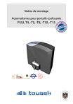Notice de montage Automatismes pour portails coulissants EN NITIA S SOU 1*) 11324 par üd Safety Sensor TI L TES PULL T4, -T5, -T8, -T10, -T15 T ÜV- S Index Remarques générales de sécurité, maintenance.............................................................................................. 3 1. Remarques générales, caracteristiques, fonctionnement, données techniques............................................... 4 2. Montage ......................................................................................................................................................... 5 3. Déverrouillage d‘urgence en cas de panne de courant (consigne pour l‘utilisateur) .................................. 8 Commande, structure de la commande électronique....................................................................................... 9 Avertissements - travaux de raccordement............................................................................................... 10 Programmation, Plan du menu............................................................................................................ 11, 12 Raccordement et réglages ....................................................................................................................... 13 bouton-poussoir / interrupteurs............................................................................................................ 13 Sécurité................................................................................................................................................ 15 Moteur.................................................................................................................................................. 19 Logique de fonctionnement................................................................................................................. 20 Lampe/voyants.................................................................................................................................... 21 Diagnose.............................................................................................................................................. 23 4. Montage du récepteur radio ........................................................................................................................... 24 5. Rail DIN en option pour les accessoires de montage .................................................................................... 25 6. Mise en marche ........................................................................................................................................ 26, 27 7. Recherche d´erreurs....................................................................................................................................... 28 8. Plan de câblage.............................................................................................................................................. 29 9. Dessin coté .................................................................................................................................................... 30 Déclaration de constitution ............................................................................................................................. 31 Ce manuel d‘instructions est notre propriété et ne doit pas être remis à des entreprises concurrentes. Toute reproduction, même partielle, est interdite sans notre consentement. Toute responsabilité concernant d‘éventuelles fautes d‘impression ou erreurs est déclinée. Avec la parution de cette édition toutes les versions précédentes perdent leur validité. -2- tousek / FR_PULL-T4-T5-T8-T10-T15_00 / 02. 09. 2020 Avertissements et indications de sécurité • La présente instruction de montage et mode d‘emploi est une partie intégrante du produit „automatisme pour portails“, s‘adresse exclusivement à un personnel qualifié et devrait être lue attentivement et en entier avant le montage. Elle ne concerne que l‘opérateur pour portails et non l‘installation générale pour le portail automatique. Le manuel d‘instructions doit être remis à l‘exploitant après le montage. • Montage, branchements, mise en service et entretien ne doivent être effectués que par un personnel qualifié et en tenant compte des instructions de montage. • Avant d‘effectuer des travaux sur l‘installation il faut débrancher le courant. • Il faut observer et respecter la Directive sur les machines ainsi que les instructions concernant la prévention des accidents, de même que les normes CEE et les normes nationales respectivement en vigueur. • La société TOUSEK Ges.m.b.H. [Sarl] ne peut être tenue responsable du non-respect des normes lors du montage ou du fonctionnement de l‘installation. • Le matériel d‘emballage (plastique, styropore, etc.) doit être éliminé conformément au règlement. Il constitue une source de danger pour les enfants et doit pour cela être entreposé hors de leur portée. • Le produit ne doit pas être installé dans des endroits à risque d‘explosion. • Le produit ne doit être employé que pour l‘usage prévu; il a été développé exclusivement pour l‘utilisation décrite dans ce manuel d‘instructions. La société TOUSEK Ges.m.b.H. décline toute responsabilité en cas d‘usage non approprié. • En ce sens, les enfants doivent absolument être informés du fait que l’installation et les dispositifs qui en font partie ne sont pas destinés à un usage abusif (par ex. le jeu). Il faut en outre veiller à garder les télécommandes en lieu sûr et à installer d’autres émetteurs d’impulsions tels boutons et interrupteurs hors de la portée des enfants. • Avant de commencer l‘installation, il faut vérifier si les composants mécaniques, tels vantaux du portail, rails de guidage, etc., sont suffisamment solides. • L‘installation électrique doit être