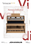 T-255 / T-355 / D-455 Fabricant Global Organ Group B.V. Adresse Keplerlaan 2 6716 BS EDE Pays Pays-Bas Téléphone +31 (0)318 63 74 03 E-mail [email protected] Site Internet www.johannus.com Version 1.2 Date Mai 2025 © 2025 Global Organ Group B.V. Tous droits réservés. Aucun élément de cette édition ne peut être copié, enregistré dans un fichier automatisé, ou publié, que ce soit sous forme électronique, mécanique, par photocopies, photographies ou de quelque manière que ce soit sans l’autorisation de Global Organ Group B.V. obtenue au préalable. Manuel d'utilisation Vivaldi 260 / 360 2 CONTENU 1 SÉCURITÉ ....................................................................................... 5 1.1 1.2 1.3 1.4 1.5 1.6 1.7 1.8 2 Consignes de sécurité ................................................................................. 5 Symboles sur l'instrument .......................................................................... 6 Pictogrammes présents dans ce manuel .................................................... 6 Transport et entreposage ........................................................................... 7 Avertissements et avis importants ............................................................. 8 Emplacement ............................................................................................ 10 Réparations et données ............................................................................ 10 Précautions Supplémentaires ................................................................... 11 INSTALLATION ..............................................................................12 2.1 Installation et connexion .......................................................................... 12 2.1.1 2.1.2 2.2 2.3 2.4 2.5 3 Ouvrir et fermer le couvercle enrouleur (optionnel) ............................... 14 Calibrage du contact de la pédale ............................................................ 14 Allumer ..................................................................................................... 15 Paramètres d'Ecran................................................................................... 15 DESCRIPTION DE L'INSTRUMENT ...................................................16 3.1 3.2 Vue d'ensemble des composants ............................................................. 16 Vue d’ensemble des éléments principaux ................................................ 17 3.2.1 3.2.2 3.3 3.4 3.5 4 Vivaldi 260 .................................................................................................. 12 Vivaldi 360 .................................................................................................. 13 Vivaldi 260 .................................................................................................. 17 Vivaldi 360 .................................................................................................. 18 Raccordement et mise sous tension de l’équipement périphérique ....... 19 Raccordements externes .......................................................................... 19 Connexion USB (type A) pour Mémoire USB ............................................ 20 COMMANDE .................................................................................20 4.1 4.2 4.3 4.4 4.5 4.6 4.7 4.8 4.9 4.10 VOL : Volume général ............................................................................... 20 REV.. : Volume de la réverbération .......................................................... 20 Pédales d’expression ................................................................................ 21 Réverbération ........................................................................................... 21 AMB : Système d'ambiance adaptatif ...................................................... 22 Style d'orgue, lettres de disposition ......................................................... 22 Registres ................................................................................................... 24 Accouplements ......................................................................................... 24 Accessoires ............................................................................................... 25 Espaces mémoire ...................................................................................... 26 4.10.1 4.10.2 4.11 4.12 4.13 4.14 Espaces mémoire préprogrammés (PP - T, PL)........................................... 26 Mémoire du combinateur .......................................................................... 27 Transpositeur ............................................................................................ 28 Pédale de crescendo ................................................................................. 28 Zimbelstern (optionnel) ............................................................................ 28 Quick Access ............................................................................................. 28 4.14.1 4.14.2 4.14.3 Mode de programmation de la pédale de crescendo ................................ 29 Mode de programmation Réglages orchestraux ........................................ 29 Mode de programmation Réglages orchestraux par défaut au démarraget30 Manuel d'utilisation Vivaldi 260 / 360 3 4.14.4 5 Programmation du mode de démarrage.................................................... 30 MENU JOHANNUS .........................................................................31 5.1 5.2 5.3 5.4 5.5 5.6 5.7 5.8 5.9 5.10 5.11 5.12 5.13 5.14 5.15 5.16 5.17 Reverb Settings ......................................................................................... 32 Tempéraments ..................................................................................... 32 Orchestrals (optionnel) ............................................................................. 34 Audio Settings ....