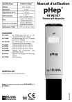 Spécifications Gamme HI 98107 pHep® 0,0 à 14,0 pH Résolution 0,1 pH Exactitude (à 20 °C) ± 0,1 pH Environnement 0 à 50 °C 95% humidité relative Piles 4 piles 1,5 V “bouton” alcalines (fournies) Durée de vie des piles Environ 400 heures d’utilisation continue Dimensions / Poids 175 x 41 x 23 mm / 78 g Manuel d’utilisation pHep® HI 98107 Testeur pH de poche ACCESSOIRES HI 77400P HI 77700P HI 770710P HI 7004M HI 7007M HI 7010M HI 70300M HI 7061M HI 731326 Kit d’étalonnage (pH 4,01 et 7,01, 5 sachets de 20 mL de chaque) Kit d’étalonnage (pH 7,01, 10 sachets de 20 mL de chaque) Kit d’étalonnage (pH 7,01 et 10,01, 5 sachets de 20 mL de chaque) Solution tampon pH 4,01, 230 mL Solution tampon pH 7,01, 230 mL Solution tampon pH 10,01, 230 mL Solution de conservation pour électrodes, 230 mL Solution de nettoyage de l’électrode, 230 mL Mini tournevis GARANTIE et SAV 6 mois contre tout vice de fabrication EN 50081-1 EN 50082-1 Ed. 06/2009 pHep est conforme aux directives CE EN 50081-1 et EN 50082-1. PRÉPARATION • • Ôtez le capuchon Pour activer l’électrode, plongez le pHEP dans la solution de conservation (HI 70300) ou dans une solution tampon pH 7 pendant 2 heures. ÉTALONNAGE En fonction de votre application, procédez à l’un des deux étalonnage en deux points : 1) Étalonnage acide pour des mesures en-dessous de pH 7 • Plongez le pHep dans la solution Potentiomètre d'étalonnage pH 7. • Attendez la stabilisation de la lecture puis à l’aide d’un mi n i -to u r n e vi s to u r n ez l e potentiomètre afin de lire «7,0». • Rincez l’électrode à l’eau claire et plongez-là dans la solution à pH 4. • Attendez la stabilisation de la lecture puis tournez le potentiomètre d’étalonnage pH 4 / pH 10 afin de lire «4,0». 2) Étalonnage alcalin pour des mesures au-dessus de pH 7: • Plongez le pHep dans la solution pH 7. • Attendez la stabilisation de la lecture puis à l’aide d’un mini-tournevis tournez le potentiomètre afin de lire «7,0». • Rincez l’électrode à l’eau claire et plongez-là dans la solution à pH 10. • Attendez la stabilisation de la lecture puis tournez le potentiomètre d’étalonnage pH 4 / pH 10 afin de lire «10,0». Des grandes différences de lecture (± 1 pH) peuvent être dues à un mauvais étalonnage ou une électrode trop sèche. MAINTENANCE Il est indispensable de garder le capteur toujours humide. En cas de lecture erronée même après un étalonnage précis, la jonction de référence pourrait être contaminée ou obstruée. Dégagez 2 mm de la jonction tissu en tirant délicatement puis coupez le surplus. Cette opération peut être renouvelée environ 20 fois. ATTENTION : Ne pas perdre le bouchon de la jonction BEPS & REMPLACEMENT DES PILES pHep est livré avec BEPS (Système de prévention d’erreur des piles) qui évite toute erreur de lecture due à des piles trops faibles. Dans ce cas, l’instrument s’éteint automatiquement. Pour accéder aux piles, faites glisser le couvercle du compartiment à piles et remplacez les 4 piles en respectant les polarités. Veillez à remplacer les piles dans un endroit sec et bien aéré en utilisant les modèles LR 44 Faites glisser Compartiment à piles UTILISATION • • • • • • • Ôtez le capuchon de protection. Allumez le pHep à l’aide du bouton ON/OFF situé sur le dessus du boîtier. Plongez l’électrode dans la solution en respectant le niveau maximum d’immersion. Agitez doucement puis attendez la stabilisation de l’afficheur. Après utilisation, rincez l’électrode à l’eau afin d’éviter toute contamination. Mettez quelques gouttes de solution de conservation (HI 70300) ou de solution d’étalonnage pH 7 (HI 7007) dans le capuchon de protection. Remettez systématiquement le capuchon de protection après chaque utilisation et stockez à la verticale. N’UTILISEZ JAMAIS D’EAU DISTILLÉE POUR LA CONSERVATION DE L’ÉLECTRODE. Recyclez avec nous vos instruments HANNA instruments ! Cet instrument ne doit être ni rejeté dans la nature, ni déposé dans les déchetteries communales ou collectes d’ordures ménagères. Si vous ne disposez pas de votre propre filière de recyclage, retrouvez toutes les modalités de retour sur notre site internet www.hanna-france.com ou contactez-nous : HANNA instruments France Parc d’Activités des Tanneries - 1 rue du Tanin - BP 133 LINGOLSHEIM - 67833 TANNERIES CEDEX Tél. : 03 88 76 91 88 - Fax : 03 88 76 58 80 [email protected] - www.hanna-france.com ">