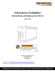 ® Instructions d’installation Génératrices refroidies par air 60 Hz 9 kW à 22 kW AVERTISSEMENT Danger de mort. Ce produit ne doit pas être utilisé dans une application critique de support de vie. Le non-respect de cet avertissement peut entraîner la mort ou des blessures graves. (000209b) Enregistrez votre produit Generac à : WWW.GENERAC.COM 1-888-GENERAC (888-436-3722) For English, visit: http://www.generac.com/service-support/product-support-lookup Para español, visita: http://www.generac.com/service-support/product-support-lookup CONSERVER CE MANUEL POUR TOUTE CONSULTATION ULTÉRIEURE Utiliser cette page pour consigner l’information importante sur cette génératrice. Consigner dans cette page l’information figurant sur l’étiquette signalétique de l’appareil. Voir l’emplacement de l’étiquette Modèle : signalétique dans le manuel de l’utilisateur. L’étiquette signalétique de l’appareil est apposée sur la paroi intérieure, à gauche du tableau de commande. N° de série : Toujours fournir les numéros de modèle et de série complets de l’appareil lorsqu’on communique avec un IASD (Independent Semaine date Authorized Service Dealer, fournisseur de services d’entretien prod. : agréé indépendant) concernant des pièces ou une réparation. Utilisation et entretien : Un entretien et des soins corrects de l’appareil permettent de minimiser les problèmes et de maintenir Tension (V) : les coûts d’exploitation à un minimum. L’exploitant a pour responsabilité d’effectuer toutes les inspections de sécurité, de vérifier que tout l’entretien est effectué sans délai pour garantir Courant (A) GPL : un fonctionnement sans danger et de faire inspecter le matériel à intervalles réguliers par un IASD. L’entretien courant, les réparations et le remplacement de pièces relèvent de la Courant (A) GN : responsabilité du propriétaire/exploitant et ne constituent pas des défauts de pièces ou de main-d’œuvre en vertu des dispositions de la garantie. Les pratiques d’exploitation et Fréquence (Hz) : l’usage d’un appareil particulier peuvent contribuer à la nécessité d’un entretien ou de réparations plus fréquents. Lorsque le générateur nécessite un entretien ou une réparation, Phases : Generac recommande de communiquer avec un IASD pour obtenir de l’assistance. Les techniciens en entretien et en réparation agréés sont formés en usine et peuvent répondre à Réf. contrôleur : tous les besoins en matière d’entretien et de réparation. Pour trouver l’IASD le plus près, visitez le : www.generac.com/Dealer-Locator. AVERTISSEMENT CANCER ET EFFET NOCIF SUR LA REPRODUCTION www.P65Warnings.ca.gov. (000393a) ii Guide d’installation des génératrices refroidies par air 60 Hz Table des matières Section 1 : Règles de sécurité et généralités Introduction ............................................................. 1 Veiller à lire attentivement ce manuel ............................. 1 Surface de montage appropriée ...........................17 Installation sur les toits, plateformes et autres structures portantes .............................................. 17 Règles de sécurité .................................................. 1 Pour tout besoin d’assistance ......................................... 2 Risques généraux ................................................... 2 Risques liés à l’échappement ................................ 3 Risques électriques ................................................ 3 Risques d’incendie ................................................. 3 Risques d’explosion ............................................... 4 Risques liés aux batteries ...................................... 4 Règles générales .................................................... 5 Avant de commencer ...................................................... 5 Exigences du Code national de l’électricité des États-Unis (NEC) ............................................................. 5 Index des normes ............................................................ 6 Section 2 : Déballage et inspection Généralités .............................................................. 7 Outillage nécessaire ............................................... 7 Déballage ................................................................. 7 Ouvrir le capot supérieur ................................................. 8 Dépose des panneaux d’enceinte ......................... 8 Dépose du panneau d’accès avant ................................. 8 Dépose du panneau latéral d’admission ......................... 9 Branchements d’abonné et pièces en vrac .......... 9 Branchements arrière ............................................. 9 Disjoncteur principal de la génératrice ............... 10 Pièces livrées en vrac ........................................... 10 Interrupteur d’arrêt auxiliaire ............................... 11 Section 3 : Sélection et préparation du site Sélection du site ................................................... 13 Monoxyde de carbone .......................................... 13 Détecteurs de monoxyde de carbone ........................... 13 Points d’entrée potentiels du monoxyde de carbone .... 14 Protection de la structure .............................................. 14 Exigences en matière de distance ................................ 15 Codes, normes et directives en matière d’incendie ....... 16 Maintenance du générateur .......................................... 16 Section 4 : Placement de la génératrice Placement de la génératrice ................................. 19 Pose de la bordure de socle (le cas échéant) ..... 19 Pose des bouchons de socle (le cas échéant) ... 20 Section 5 : Sélection de carburant et raccordements de gaz Exigences et recommandations concernant le carburant ........................................