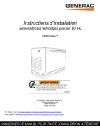 ® Instructions d’installation Génératrices refroidies par air 60 Hz 15kW EcoGen™ AVERTISSEMENT Danger de mort. Ce produit ne doit pas être utilisé dans une application critique de support de vie. Le non-respect de cet avertissement peut entraîner la mort ou des blessures graves. (000209b) Enregistrez votre produit Generac à : WWW.GENERAC.COM 1-888-GENERAC (888-436-3722) For English, visit: http://www.generac.com/service-support/product-support-lookup Para español, visita: http://www.generac.com/service-support/product-support-lookup CONSERVER CE MANUEL POUR TOUTE CONSULTATION ULTÉRIEURE Utiliser cette page pour consigner l’information importante sur cette génératrice. Modèle : N° de série : Date de fabrication : Tension (V) : Courant (A) PL : Courant (A) GN : Fréquence (Hz) : Phases : Réf. contrôleur : STA MAC ID : SSID (Service Set Identifier) : Consigner dans cette page l’information figurant sur l’étiquette signalétique de l’appareil. Voir l’emplacement de l’étiquette signalétique dans le manuel de l’utilisateur. L’étiquette signalétique de l’appareil est apposée sur la paroi intérieure, à gauche du tableau de commande. Toujours fournir les numéros de modèle et de série complets de l’appareil lorsqu’on communique avec un IASD (Independant Authorized Service Dealer, fournisseur de services d’entretien agréé indépendant) concernant des pièces ou une réparation. Utilisation et entretien : Un entretien et des soins corrects de l’appareil permettent de minimiser les problèmes et de maintenir les coûts d’exploitation à un minimum. L’exploitant a pour responsabilité d’effectuer toutes les inspections de sécurité, de vérifier que tout l’entretien est effectué sans délai pour garantir un fonctionnement sans danger et de faire inspecter le matériel à intervalles réguliers par un IASD. L’entretien courant, les réparations et le remplacement de pièces relèvent de la responsabilité du propriétaire/exploitant et ne constituent pas des défauts de pièces ou de maind’œuvre en vertu des dispositions de la garantie. Les pratiques d’exploitation et l’usage d’un appareil particulier peuvent contribuer à la nécessité d’un entretien ou de réparations plus fréquents. Lorsque le générateur nécessite un entretien ou une réparation, Generac recommande de communiquer avec un IASD pour obtenir de l’assistance. Les techniciens en entretien et en réparation agréés sont formés en usine et peuvent répondre à tous les besoins en matière d’entretien et de réparation. Pour trouver l’IASD le plus près, visitez le : www.generac.com/Dealer-Locator. AVERTISSEMENT CANCER ET EFFET NOCIF SUR LA REPRODUCTION www.P65Warnings.ca.gov. (000393a) ii Guide d’installation des génératrices EcoGen™ 60 Hz Table des matières Section 1 : Règles de sécurité et généralités Introduction ............................................................. 1 Air frais pour la ventilation et le refroidissement ................................................. 16 Veiller à lire attentivement ce manuel ............................. 1 Prévention de l’infiltration d’eau .......................... 16 Règles de sécurité .................................................. 1 Proximité du réseau de distribution public ......... 16 Pour tout besoin d’assistance ......................................... 2 Vérification de la portée du Wi-Fi ...................................17 Risques généraux ................................................... 2 Recommandations de transport .......................... 17 Risques liés à l’échappement ................................ 3 Surface de montage appropriée ...........................17 Risques électriques ................................................ 3 Installation sur les toits, plateformes et autres structures portantes .............................................. 17 Risques d’incendie ................................................. 3 Risques d’explosion ............................................... 4 Risques liés aux batteries ...................................... 4 Règles générales .................................................... 5 Avant de commencer ...................................................... 5 Exigences du Code national de l’électricité des États-Unis (NEC) ............................................................. 5 Index des normes ............................................................ 6 Section 2 : Déballage et inspection Section 4 : Mise en place de la génératrice Mise en place de la génératrice ............................ 19 Pose de la bordure de socle (le cas échéant) ..... 19 Pose des bouchons de base (le cas échéant) ..... 20 Section 5 : Sélection de carburant et raccordements de gaz Généralités .............................................................. 7 Exigences et recommandations concernant le carburant ................................................................ 21 Outillage nécessaire ............................................... 7 Pouvoir calorifique .........................................................21 Pression de carburant ....................................................21 Déballage ................................................................. 7 Ouvrir le couvercle supérieur .......................................... 8 Changement de carburant .................................... 21 Retrait des panneaux d’enceinte ........................... 8 Consommation de carburant ................................ 22 Retirer le panneau d’accès avant .................................... 8 Retirer le panneau latéral d’admission ............................ 9 Diamètre des conduites de gaz ............................ 22 Branchements d’abonné et pièces en vrac .......... 9 Branchements arrière ............................................. 9 Disjoncteur prin