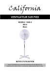 VENTILATEUR SUR PIED MODÈLE : FS40-3 40cm Blanc NOTICE D’UTILISATION Avant l’installation ou la première utilisation de cet appareil, lire attentivement cette notice. La conserver soigneusement par la suite. TABLE DES MATIÈRES TABLE DES MATIÈRES ..................................................................................... 1 CONSIGNES DE SÉCURITÉ ............................................................................... 3 DESCRIPTION DU PRODUIT ............................................................................ 8 ASSEMBLAGE ................................................................................................. 9 UTILISATION ................................................................................................ 11 ENTRETIEN ET NETTOYAGE .......................................................................... 12 CARACTÉRISTIQUES TECHNIQUES ................................................................ 13 PROTECTION DE L’ENVIRONNEMENT ........................................................... 14 1 Vous venez d'acquérir un produit de la marque California et nous vous en remercions. Nous apportons un soin particulier au design, à l'ergonomie et à la simplicité d'usage de nos produits. Nous espérons que cet appareil vous donnera entière satisfaction. Dans le souci d'une amélioration constante de nos produits, nous nous réservons le droit d'apporter à leurs caractéristiques techniques, fonctionnelles ou esthétiques toutes modifications liées à leur évolution. LISEZ ATTENTIVEMENT CES INSTRUCTIONS AVANT D'UTILISER L'APPAREIL ET CONSERVEZ-LES POUR POUVOIR LES CONSULTER ULTÉRIEUREMENT. 2 CONSIGNES DE SÉCURITÉ CONSIGNES GÉNÉRALES DE SÉCURITÉ QUANT À L'UTILISATION D'UN APPAREIL ÉLECTRIQUE 1. AVERTISSEMENT : afin d’éviter tout risque d’incendie, d’électrocution ou de blessure, veillez à toujours suivre les consignes de sécurité suivantes quand vous utilisez un appareil électrique. 2. Veillez à ce que les différents types d’emballage (cartons, sacs en plastique, polystyrène, bandes collantes, liens, etc.) soient hors de portée des enfants. Ces éléments comportent un risque potentiel. 3. Lors du déballage de l'appareil, de son installation et avant chaque utilisation, vérifiez son bon état général. Si vous constatez une quelconque anomalie sur l'appareil, le cordon d'alimentation ou la fiche, n'utilisez pas l'appareil et adressez-vous au service après-vente pour qu'il soit vérifié ou réparé. 4. Cet appareil n’est pas destiné à un usage professionnel ou commercial, ou pour d’autre but que celui pour lequel il a été conçu. Cet appareil peut cependant être utilisé dans des applications domestiques et analogues telles que : 3 - des coins cuisine réservés au personnel dans des magasins, bureaux et autres environnements professionnels ; - des fermes ; - l’utilisation par les clients des hôtels, motels et autres environnements à caractère résidentiel ; - des environnements du type chambres d’hôtes. Mais n’est pas destiné à être utilisé dans : - la restauration et autres applications similaires y compris la vente au détail. 5. L'installation du produit doit respecter strictement les exigences de la norme NF C15-100. 6. Avant de brancher votre appareil, assurez-vous que la tension électrique de votre domicile correspond à celle indiquée sur la plaque signalétique de l'appareil. 7. Ne laissez pas l'appareil sans surveillance lorsqu'il fonctionne. 8. Cet appareil peut être utilisé par des enfants âgés d'au moins 8 ans et par des personnes ayant des capacités physiques, sensorielles ou mentales réduites ou dénuées d’expérience ou de connaissance, s'ils (si elles) sont correctement surveillé(e)s ou si des instructions relatives à l'utilisation de l'appareil en toute sécurité leur ont été données et si les risques encourus ont été appréhendés. Les enfants ne doivent pas jouer 4 avec l’appareil. Le nettoyage et l'entretien de l'appareil ne doivent pas être effectués par des enfants, à moins qu'ils ne soient âgés d'au moins 8 ans et qu'ils soient sous la surveillance d'un adulte. 9. Cet appareil n’est pas un jouet. Les enfants de moins de 8 ans ne doivent pas utiliser l'appareil sans la surveillance d'un adulte. 10. Pour éviter tout risque d’incendie, d’électrocution ou autres blessures aux personnes, ne plongez jamais l'appareil, le cordon d’alimentation ou la fiche dans l’eau ou tout autre liquide. Ne manipulez pas l’appareil et la fiche avec les mains mouillées. 11. Le cordon d'alimentation doit être manipulé avec précaution. L'appareil ne doit pas être tiré par le cordon. Celui-ci ne doit pas être placé sur le rebord d'une table ou d'un plan de travail. Il ne doit pas entrer en contact avec des surfaces chaudes. Lorsque vous le débranchez, tirez-le toujours au niveau de la fiche, ne tirez pas sur le câble lui-même. 12. Si le cordon d’alimentation est endommagé, il doit être remplacé par le fabricant, son service après-vente ou une personne de qualification similaire, afin d'éviter tout danger. 5 13. Toute intervention sur l'appareil pendant son installation ou toute réparation doit être effectuée par le service après-vente ou une personne de qualification similaire. 14. Toute intervention ou nettoyage sur le produit doit se faire hors alimentation. Pour cela, la fiche d’alimentation doit être déconnectée de la prise de courant. 15. Le stockage de matériaux ou de liquides inflammables, de même que leur utilisation à proximité de l'appareil ou pour le nettoyage de l'appareil sont interdits. Les vapeurs peuvent provoquer un incendie ou une explosion. 16. N’utilisez que les accessoires fournis et recommandés par le fabricant. CONSIGNES DE SÉCURITÉ QUANT L'UTILISATION D'UN VENTILATEUR À 1. Une fois l’installation terminée, il est strictement interdit d’enlever les grilles de protection avant tou