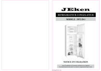 REFRIGERATEUR-CONGELATEUR MODELE : DF2-28-1 NOTICE D’UTILISATION Avant l’installation ou la première utilisation de cet appareil, Lire attentivement cette notice. La conserver soigneusement par la suite. 8101 Jeken DF2-28-1_IB INSTRUCTIONS D’UTILISATION CONSIGNES DE SECURITE 1 AVANT L’UTILISATION 8 PROTECTION DE L’ENVIRONNEMENT 8 NOMENCLATURE9 PRECAUTIONS ET RECOMMANDATIONS GENERALES 9 INSTALLATION11 MODIFICATION DU SENS D’OUVERTURE DE LA PORTE 13 INSTALLATION DE L’INDICATEUR DE TEMPERATURE 15 ZONE LA PLUS FROIDE DU REFRIGERATEUR 16 VERIFICATION DE LA TEMPERATURE DANS LA ZONE LA PLUS FROIDE 17 UTILISATION DU COMPARTIMENT REFRIGERATEUR 18 UTILISATION DU COMPARTIMENT CONGELATEUR 19 CONSERVATION DES ALIMENTS DANS LE REFRIGERATEUR EN FONCTION DE LEUR NATURE 20 NETTOYAGE ET RESPECT DES REGLES D’HYGIENE ALIMENTAIRE 21 DEGIVRAGE22 ENTRETIEN ET MAINTENANCE 23 DEPANNAGE24 CONSEILS POUR REDUIRE VOTRE CONSOMMATION D’ENERGIE 25 PARAMETRES PRINCIPAUX 26 REPARATIONS27 non-observation des instructions d’entretien et à l’usage inadéquat de l’appareil. Après avoir retiré l’emballage des différentes pièces de l’appareil, vérifiez que celui-ci se trouve en parfait état. Si vous avez des doutes à ce sujet, n’utilisez pas l’appareil et adressez-vous au vendeur ou à un technicien qualifié. Veillez également à ce que les différents types d’emballage (cartons, sacs en plastique, polystyrène, bandes collantes, liens, etc.) soient hors de portée des enfants. Ces éléments comportent un risque potentiel. Avant d’utiliser l’appareil, vérifiez si le courant de votre secteur correspond à celui qui est indiqué sur la plaque signalétique. CONSIGNES DE SECURITE Cet appareil est d’un usage très simple. Nous vous conseillons néanmoins de lire attentivement cette notice d’utilisation car elle contient des informations importantes concernant la sécurité et des instructions de nettoyage. Cet appareil est exclusivement destiné à un usage domestique. Tout autre usage (professionnel) est exclu. Le fabricant décline toute responsabilité en cas de blessure causée à des personnes ou de dégâts matériels dus à la 1 2 8101 Jeken DF2-28-1_IB Quand vous utilisez cet appareil, veuillez suivre les consignes de sécurité suivantes : notice d’utilisation. Conservez cette notice avec soin. 2. Ne laissez pas les enfants jouer avec cet appareil. 3. Ne laissez pas l’appareil sans surveillance lorsqu’il est branché. Enlevez la prise quand vous n’utilisez pas l’appareil ou quand vous le nettoyez. 4. Cet appareil n’est pas un jouet. Ayez une stricte surveillance quand vous utilisez l’appareil en présence d’enfants, d’animaux domestiques. Ne permettez pas à des enfants d’utiliser cet appareil. 5. Vérifiez régulièrement l’état de votre appareil. N’utilisez pas l’appareil si ce dernier est endommagé. 6. N’utilisez pas l’appareil si le cordon d’alimentation ou la prise est endommagé. N’utilisez pas l’appareil s’il est tombé, s’il est endommagé, s’il est resté dehors ou s’il est tombé dans l’eau. 7. N’immergez jamais cet appareil dans l’eau ou tout autre liquide. 8. Ne tirez ou portez pas l’appareil par le cordon d’alimentation, n’utilisez pas le cordon comme poignée, ne coincez pas le fil dans la porte et ne le tirez pas le long de bords ou angles acérés. 9. Ne placez pas l’appareil sur le cordon d’alimentation. Ne laissez d’aucune façon le cordon s’enrouler ou s’emmêler. Tenez le cordon éloigné des surfaces chaudes. 10. Ne retirez pas la prise en tirant sur le cordon. Pour enlever la prise, prenez celle-ci en main et retirez-la prudemment de la prise murale. 11. Ne manipulez ni l’appareil, ni la prise avec les mains mouillées. 12. Portez une attention particulière à cet appareil et suivez toutes les instructions données dans la notice d’utilisation. 13. Utilisez uniquement une rallonge certifiée avec l’ampérage en vigueur dans votre pays. Des rallonges certifiées avec un ampérage inférieur risquent de surchauffer. Veillez à ce que personne ne trébuche sur le cordon ou la prise. 14. Gardez cet appareil à l’intérieur et dans un endroit sec. 15. Gardez l’appareil à l’écart des sources de chaleur comme les radiateurs, afin d’éviter la déformation des 3 4 Avertissement : afin d’éviter tout risque d’incendie, d’électrocution ou de blessure, veillez à toujours suivre les principales consignes de sécurité suivantes quand vous utilisez un appareil électrique. 1. Avant l’utilisation de cet appareil, lisez attentivement la 8101 Jeken DF2-28-1_IB parties en plastique. 16. Débranchez toujours le cordon d’alimentation avant de nettoyer l’appareil. 17. Si le câble d’alimentation est endommagé, il doit être remplacé par le fabricant, son service après-vente ou des personnes de qualification similaire afin d’éviter tout danger. 18. Toute réparation doit être effectuée par le service après-vente ou des personnes de qualification similaire. 19. N’utilisez pas des accessoires qui ne sont pas recommandés par le fabricant. Ils pourraient endommager l’appareil. 20. Cet appareil doit uniquement servir à un usage domestique. 21. N’utilisez pas cet appareil à l’extérieur. 22. N’utilisez pas l’appareil près de matériaux inflammables. 23. N’utilisez pas d’autres accessoires que ceux étant fournis avec l’appareil. 24. Cet appareil peut être utilisé par des enfants à partir de 8 ans et plus et par des personnes ayant des capacités physiques, sensorielles ou mentales réduites ou un manque d’expérience et de connaissances à condition qu’elles aient reçu une supervision ou des instructions concernant l’utilisation de l’appareil en toute sécurité et qu’elles comprennent les dangers encourus. Les enfants ne doivent pas jouer avec l’appareil. Le nettoyage et l’entretien par l’usager ne doivent pas être effect