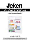 RÉFRIGÉRATEUR ENCASTRABLE MODÈLE : BBB21PI25 blanc NOTICE D’UTILISATION Avant l’installation ou la première utilisation de cet appareil, lire attentivement cette notice. La conserver soigneusement par la suite. TABLE DES MATIÈRES TABLE DES MATIÈRES ........................................................................................ 1 CONSIGNES DE SÉCURITÉ .................................................................................. 3 DESCRIPTION DE L’APPAREIL .......................................................................... 11 INSTALLATION ................................................................................................. 12 RÉGLAGE DE LA TEMPÉRATURE ...................................................................... 20 UTILISATION .................................................................................................... 25 ENTRETIEN ET MAINTENANCE ........................................................................ 28 MODIFICATION DU SENS D’OUVERTURE DE LA PORTE .................................. 32 GUIDE DE DÉPANNAGE ................................................................................... 35 CONSEILS POUR RÉDUIRE VOTRE CONSOMMATION D’ÉNERGIE ................... 38 GARANTIE ........................................................................................................ 39 CARACTÉRISTIQUES TECHNIQUES................................................................... 40 PROTECTION DE L’ENVIRONNEMENT ............................................................. 45 1 Vous venez d'acheter notre produit et nous vous remercions. Nous apportons un soin particulier au design, à l'ergonomie et à la simplicité d'usage de nos produits. Nous espérons que cet appareil vous donnera entière satisfaction. Dans le souci d'une amélioration constante de nos produits, nous nous réservons le droit d'apporter à leurs caractéristiques techniques, fonctionnelles ou esthétiques toutes modifications liées à leur évolution. LISEZ ATTENTIVEMENT CES INSTRUCTIONS AVANT D'UTILISER L'APPAREIL ET CONSERVEZ-LES POUR POUVOIR LES CONSULTER ULTÉRIEUREMENT. 2 CONSIGNES DE SÉCURITÉ CONSIGNES GÉNÉRALES DE SÉCURITÉ QUANT À L'UTILISATION D'UN APPAREIL ÉLECTRIQUE 1. AVERTISSEMENT : afin d’éviter tout risque d’incendie, d’électrocution ou de blessure, veillez à toujours suivre les consignes de sécurité suivantes quand vous utilisez un appareil électrique. 2. Veillez à ce que les différents types d’emballage (cartons, sacs en plastique, polystyrène, bandes collantes, liens, etc.) soient hors de portée des enfants. Ces éléments comportent un risque potentiel. 3. Lors du déballage de l'appareil, de son installation et avant chaque utilisation, vérifiez son bon état général. Si vous constatez une quelconque anomalie sur l'appareil, le cordon d'alimentation ou la fiche, n'utilisez pas l'appareil et adressez-vous au service après-vente pour qu'il soit vérifié ou réparé. 4. Cet appareil n’est pas destiné à un usage professionnel ou commercial, ou pour d’autre but que celui pour lequel il a été conçu. Cet appareil peut cependant être utilisé dans des applications domestiques et analogues telles que : 3 - des coins cuisine réservés au personnel dans des magasins, bureaux et autres environnements professionnels ; - des fermes ; - l’utilisation par les clients des hôtels, motels et autres environnements à caractère résidentiel ; - des environnements du type chambres d’hôtes. Mais n’est pas destiné à être utilisé dans : - la restauration et autres applications similaires y compris la vente au détail. - également non destiné à être utilisé comme appareil encastrable. 5. L’installation du produit doit respecter strictement les exigences de la norme NF C15-100. 6. Avant de brancher votre appareil, assurez-vous que la tension électrique de votre domicile correspond à celle indiquée sur la plaque signalétique de l'appareil. 7. Ne laissez pas l'appareil sans surveillance lorsqu'il fonctionne. 8. Cet appareil peut être utilisé par des enfants âgés d'au moins 8 ans et par des personnes ayant des capacités physiques, sensorielles ou mentales réduites ou dénuées d’expérience ou de connaissance, s'ils (si elles) sont correctement surveillé(e)s ou si des 4 instructions relatives à l'utilisation de l'appareil en toute sécurité leur ont été données et si les risques encourus ont été appréhendés. Les enfants ne doivent pas jouer avec l’appareil. Le nettoyage et l'entretien de l'appareil ne doivent pas être effectués par des enfants, à moins qu'ils ne soient âgés d'au moins 8 ans et qu'ils soient sous la surveillance d'un adulte. 9. Cet appareil n’est pas un jouet. Les enfants de moins de 8 ans ne doivent pas utiliser l'appareil sans la surveillance d'un adulte. 10. Pour éviter tout risque d’incendie, d’électrocution ou autres blessures aux personnes, ne plongez jamais l'appareil, le cordon d’alimentation ou la fiche dans l’eau ou tout autre liquide. Ne manipulez pas l’appareil et la fiche avec les mains mouillées. 11. Le cordon d'alimentation doit être manipulé avec précaution. L'appareil ne doit pas être tiré par le cordon. Celui-ci ne doit pas être placé sur le rebord d'une table ou d'un plan de travail. Il ne doit pas entrer en contact avec des surfaces chaudes. Lorsque vous le débranchez, tirez-le toujours au niveau de la fiche, ne tirez pas sur le câble lui-même. 5 12. AVERTISSEMENT : Lors du positionnement de l’appareil, s’assurer que le cordon d’alimentation n’est pas coincé ni endommagé. 13. Si le cordon d’alimentation est endommagé, il doit être remplacé par le fabricant, son service après-vente ou une personne de qualification similaire, afin d'éviter tout danger. 14. Toute intervention sur l'appareil pendant son installation ou toute réparation doit être effectuée par le service après-vente