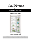 RÉFRIGÉRATEUR MODÈLE : DL1-29N-1 NOTICE D’UTILISATION Avant l’installation ou la première utilisation de cet appareil, lire attentivement cette notice. La conserver soigneusement par la suite. TABLE DES MATIÈRES TABLE DES MATIÈRES ........................................................................................ 1 CONSIGNES DE SÉCURITÉ .................................................................................. 3 DESCRIPTION DE L’APPAREIL .......................................................................... 11 INSTALLATION ................................................................................................. 12 RÉGLAGE DE LA TEMPÉRATURE ...................................................................... 16 UTILISATION .................................................................................................... 19 ENTRETIEN ET MAINTENANCE ........................................................................ 21 MODIFICATION DU SENS D’OUVERTURE DE LA PORTE .................................. 25 GUIDE DE DÉPANNAGE ................................................................................... 28 CONSEILS POUR RÉDUIRE VOTRE CONSOMMATION D’ÉNERGIE ................... 31 CARACTÉRISTIQUES TECHNIQUES................................................................... 32 SCHÉMA ÉLECTRIQUE ..................................................................................... 33 PROTECTION DE L’ENVIRONNEMENT ............................................................. 34 1 Vous venez d'acquérir un produit de la marque California et nous vous en remercions. Nous apportons un soin particulier au design, à l'ergonomie et à la simplicité d'usage de nos produits. Nous espérons que cet appareil vous donnera entière satisfaction. Dans le souci d'une amélioration constante de nos produits, nous nous réservons le droit d'apporter à leurs caractéristiques techniques, fonctionnelles ou esthétiques toutes modifications liées à leur évolution. LISEZ ATTENTIVEMENT CES INSTRUCTIONS AVANT D'UTILISER L'APPAREIL ET CONSERVEZ-LES POUR POUVOIR LES CONSULTER ULTÉRIEUREMENT. 2 CONSIGNES DE SÉCURITÉ CONSIGNES GÉNÉRALES DE SÉCURITÉ QUANT À L'UTILISATION D'UN APPAREIL ÉLECTRIQUE 1. AVERTISSEMENT : afin d’éviter tout risque d’incendie, d’électrocution ou de blessure, veillez à toujours suivre les consignes de sécurité suivantes quand vous utilisez un appareil électrique. 2. Veillez à ce que les différents types d’emballage (cartons, sacs en plastique, polystyrène, bandes collantes, liens, etc.) soient hors de portée des enfants. Ces éléments comportent un risque potentiel. 3. Lors du déballage de l'appareil, de son installation et avant chaque utilisation, vérifiez son bon état général. Si vous constatez une quelconque anomalie sur l'appareil, le cordon d'alimentation ou la fiche, n'utilisez pas l'appareil et adressez-vous au service après-vente pour qu'il soit vérifié ou réparé. 4. Cet appareil n’est pas destiné à un usage professionnel ou commercial, ou pour d’autre but que celui pour lequel il a été conçu. Cet appareil peut cependant être utilisé dans des applications domestiques et analogues telles que : 3 - des coins cuisine réservés au personnel dans des magasins, bureaux et autres environnements professionnels ; - des fermes ; - l’utilisation par les clients des hôtels, motels et autres environnements à caractère résidentiel ; - des environnements du type chambres d’hôtes. Mais n’est pas destiné à être utilisé dans : - la restauration et autres applications similaires y compris la vente au détail. 5. L’installation du produit doit respecter strictement les exigences de la norme NF C15-100. 6. Avant de brancher votre appareil, assurez-vous que la tension électrique de votre domicile correspond à celle indiquée sur la plaque signalétique de l'appareil. 7. Ne laissez pas l'appareil sans surveillance lorsqu'il fonctionne. 8. Cet appareil peut être utilisé par des enfants âgés d'au moins 8 ans et par des personnes ayant des capacités physiques, sensorielles ou mentales réduites ou dénuées d’expérience ou de connaissance, s'ils (si elles) sont correctement surveillé(e)s ou si des instructions relatives à l'utilisation de l'appareil en toute sécurité leur ont été données et si les risques encourus 4 ont été appréhendés. Les enfants ne doivent pas jouer avec l’appareil. Le nettoyage et l'entretien de l'appareil ne doivent pas être effectués par des enfants, à moins qu'ils ne soient âgés d'au moins 8 ans et qu'ils soient sous la surveillance d'un adulte. 9. Cet appareil n’est pas un jouet. Les enfants de moins de 8 ans ne doivent pas utiliser l'appareil sans la surveillance d'un adulte. 10. Pour éviter tout risque d’incendie, d’électrocution ou autres blessures aux personnes, ne plongez jamais l'appareil, le cordon d’alimentation ou la fiche dans l’eau ou tout autre liquide. Ne manipulez pas l’appareil et la fiche avec les mains mouillées. 11. Le cordon d'alimentation doit être manipulé avec précaution. L'appareil ne doit pas être tiré par le cordon. Celui-ci ne doit pas être placé sur le rebord d'une table ou d'un plan de travail. Il ne doit pas entrer en contact avec des surfaces chaudes. Lorsque vous le débranchez, tirez-le toujours au niveau de la fiche, ne tirez pas sur le câble lui-même. 12. AVERTISSEMENT : Lors du positionnement de l’appareil, s’assurer que le cordon d’alimentation n’est pas coincé ni endommagé. 5 13. Si le cordon d’alimentation est endommagé, il doit être remplacé par le fabricant, son service après-vente ou une personne de qualification similaire, afin d'éviter tout danger. 14. Toute intervention sur l'appareil pendant son installation ou toute réparation doit être effectuée par le service après-vente ou une personne de qualification similaire. 15. Toute intervention ou n