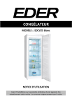CONGÉLATEUR MODÈLE : J10CV25 blanc NOTICE D’UTILISATION Avant l’installation ou la première utilisation de cet appareil, lire attentivement cette notice. La conserver soigneusement par la suite. TABLE DES MATIÈRES TABLE DES MATIÈRES ........................................................................................ 1 CONSIGNES DE SÉCURITÉ .................................................................................. 3 DESCRIPTION DE L’APPAREIL .......................................................................... 11 INSTALLATION ................................................................................................. 12 MODIFICATION DU SENS D’OUVERTURE DE LA PORTE .................................. 16 UTILISATION .................................................................................................... 19 CONSEILS ET ASTUCES..................................................................................... 21 ENTRETIEN ET MAINTENANCE ........................................................................ 24 GUIDE DE DÉPANNAGE ................................................................................... 27 GARANTIE ........................................................................................................ 30 CARACTÉRISTIQUES TECHNIQUES................................................................... 31 PROTECTION DE L’ENVIRONNEMENT ............................................................. 36 1 Vous venez d'acheter notre produit et nous vous remercions. Nous apportons un soin particulier au design, à l'ergonomie et à la simplicité d'usage de nos produits. Nous espérons que cet appareil vous donnera entière satisfaction. Dans le souci d'une amélioration constante de nos produits, nous nous réservons le droit d'apporter à leurs caractéristiques techniques, fonctionnelles ou esthétiques toutes modifications liées à leur évolution. LISEZ ATTENTIVEMENT CES INSTRUCTIONS AVANT D'UTILISER L'APPAREIL ET CONSERVEZ-LES POUR POUVOIR LES CONSULTER ULTÉRIEUREMENT. 2 CONSIGNES DE SÉCURITÉ CONSIGNES GÉNÉRALES DE SÉCURITÉ QUANT À L'UTILISATION D'UN APPAREIL ÉLECTRIQUE 1. AVERTISSEMENT : afin d’éviter tout risque d’incendie, d’électrocution ou de blessure, veillez à toujours suivre les consignes de sécurité suivantes quand vous utilisez un appareil électrique. 2. Veillez à ce que les différents types d’emballage (cartons, sacs en plastique, polystyrène, bandes collantes, liens, etc.) soient hors de portée des enfants. Ces éléments comportent un risque potentiel. 3. Lors du déballage de l'appareil, de son installation et avant chaque utilisation, vérifiez son bon état général. Si vous constatez une quelconque anomalie sur l'appareil, le cordon d'alimentation ou la fiche, n'utilisez pas l'appareil et adressez-vous au service après-vente pour qu'il soit vérifié ou réparé. 4. Cet appareil n’est pas destiné à un usage professionnel ou commercial, ou pour d’autre but que celui pour lequel il a été conçu. Cet appareil peut cependant être utilisé dans des applications domestiques et analogues telles que : 3 - des coins cuisine réservés au personnel dans des magasins, bureaux et autres environnements professionnels ; - des fermes ; - l’utilisation par les clients des hôtels, motels et autres environnements à caractère résidentiel ; - des environnements du type chambres d’hôtes. Mais n’est pas destiné à être utilisé dans : - la restauration et autres applications similaires y compris la vente au détail. - également non destiné à être utilisé comme appareil encastrable. 5. L’installation du produit doit respecter strictement les exigences de la norme NF C15-100. 6. Avant de brancher votre appareil, assurez-vous que la tension électrique de votre domicile correspond à celle indiquée sur la plaque signalétique de l'appareil. 7. Ne laissez pas l'appareil sans surveillance lorsqu'il fonctionne. 8. Cet appareil peut être utilisé par des enfants âgés d'au moins 8 ans et par des personnes ayant des capacités physiques, sensorielles ou mentales réduites ou dénuées d’expérience ou de connaissance, s'ils (si elles) sont correctement surveillé(e)s ou si des 4 instructions relatives à l'utilisation de l'appareil en toute sécurité leur ont été données et si les risques encourus ont été appréhendés. Les enfants ne doivent pas jouer avec l’appareil. Le nettoyage et l'entretien de l'appareil ne doivent pas être effectués par des enfants, à moins qu'ils ne soient âgés d'au moins 8 ans et qu'ils soient sous la surveillance d'un adulte. 9. Cet appareil n’est pas un jouet. Les enfants de moins de 8 ans ne doivent pas utiliser l'appareil sans la surveillance d'un adulte. 10. Pour éviter tout risque d’incendie, d’électrocution ou autres blessures aux personnes, ne plongez jamais l'appareil, le cordon d’alimentation ou la fiche dans l’eau ou tout autre liquide. Ne manipulez pas l’appareil et la fiche avec les mains mouillées. 11. Le cordon d'alimentation doit être manipulé avec précaution. L'appareil ne doit pas être tiré par le cordon. Celui-ci ne doit pas être placé sur le rebord d'une table ou d'un plan de travail. Il ne doit pas entrer en contact avec des surfaces chaudes. Lorsque vous le débranchez, tirez-le toujours au niveau de la fiche, ne tirez pas sur le câble lui-même. 5 12. AVERTISSEMENT : Lors du positionnement de l’appareil, s’assurer que le cordon d’alimentation n’est pas coincé ni endommagé. 13. Si le cordon d’alimentation est endommagé, il doit être remplacé par le fabricant, son service après-vente ou une personne de qualification similaire, afin d'éviter tout danger. 14. Toute intervention sur l'appareil pendant son installation ou toute réparation doit être effectuée par le service après-vente ou une personne de qualification similaire. 15. Toute intervention ou nettoyage sur le p