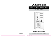 REFRIGERATEUR-CONGELATEUR MODELE : DD2-34-1 NOTICE D’UTILISATION CKJK-G01 Avant l’installation ou la première utilisation de cet appareil, Lire attentivement cette notice. La conserver soigneusement par la suite. 7954 Jeken DD2-34-1_IB INSTRUCTIONS D’UTILISATION Quand vous utilisez cet appareil, veuillez suivre les consignes de sécurité suivantes : CONSIGNES DE SECURITE AVANT L’UTILISATION PROTECTION DE L’ENVIRONNEMENT NOMENCLATURE PRECAUTIONS ET RECOMMANDATIONS GENERALES INSTALLATION UTILISATION DU COMPARTIMENT REFRIGERATEUR ZONE LA PLUS FROIDE DU REFRIGERATEUR INSTALLATION DE L’INDICATEUR DE TEMPERATURE VERIFICATION DE LA TEMPERATURE DANS LA ZONE LA PLUS FROIDE NETTOYAGE ET RESPECT DES REGLES D’HYGIENE ALIMENTAIRE CONSERVATION DES ALIMENTS DANS LE REFRIGERATEUR EN FONCTION DE LEUR NATURE DEGIVRAGE UTILISATION DU COMPARTIMENT CONGELATEUR ENTRETIEN ET MAINTENANCE MODIFICATION DU SENS D’OUVERTURE DE LA PORTE DEPANNAGE CONSEILS POUR REDUIRE VOTRE CONSOMMATION D’ENERGIE CARACTERISTIQUES REPARATIONS 1 4 4 5 5 7 8 9 10 11 12 Avertissement : afin d’éviter tout risque d’incendie, d’électrocution ou de blessure, veillez à toujours suivre les principales consignes de sécurité suivantes quand vous utilisez un appareil électrique. 13 14 15 16 17 18 19 20 21 6. 1. 2. 3. 4. 5. 7. 8. 9. 10. 11. 12. 13. CONSIGNES DE SECURITE Cet appareil est d’un usage très simple. Nous vous conseillons néanmoins de lire attentivement cette notice d’utilisation car elle contient des informations importantes concernant la sécurité et des instructions de nettoyage. Cet appareil est exclusivement destiné à un usage domestique. Tout autre usage (professionnel) est exclu. Le fabricant décline toute responsabilité en cas de blessure causée à des personnes ou de dégâts matériels dus à la non-observation des instructions d’entretien et à l’usage inadéquat de l’appareil. Après avoir retiré l’emballage des différentes pièces de l’appareil, vérifiez que celui-ci se trouve en parfait état. Si vous avez des doutes à ce sujet, n’utilisez pas l’appareil et adressez-vous au vendeur ou à un technicien qualifié. Veillez également à ce que les différents types d’emballage (cartons, sacs en plastique, polystyrène, bandes collantes, liens, etc.) soient hors de portée des enfants. Ces éléments comportent un risque potentiel. Avant d’utiliser l’appareil, vérifiez si le courant de votre secteur correspond à celui qui est indiqué sur la plaque signalétique. 14. 15. 16. 17. 18. 19. 20. 21. 22. 23. Avant l’utilisation de cet appareil, lisez attentivement la notice d’utilisation. Conservez cette notice avec soin. Ne laissez pas les enfants jouer avec cet appareil. Ne laissez pas l’appareil sans surveillance lorsqu’il est branché. Enlevez la prise quand vous n’utilisez pas l’appareil ou quand vous le nettoyez. Cet appareil n’est pas un jouet. Ayez une stricte surveillance quand vous utilisez l’appareil en présence d’enfants, d’animaux domestiques. Ne permettez pas à des enfants d’utiliser cet appareil. Vérifiez régulièrement l’état de votre appareil. N’utilisez pas l’appareil si ce dernier est endommagé. N’utilisez pas l’appareil si le cordon d’alimentation ou la prise est endommagé. N’utilisez pas l’appareil s’il est tombé, s’il est endommagé, s’il est resté dehors ou s’il est tombé dans l’eau. N’immergez jamais cet appareil dans l’eau ou tout autre liquide. Ne tirez ou portez pas l’appareil par le cordon d’alimentation, n’utilisez pas le cordon comme poignée, ne coincez pas le fil dans la porte et ne le tirez pas le long de bords ou angles acérés. Ne placez pas l’appareil sur le cordon d’alimentation. Ne laissez d’aucune façon le cordon s’enrouler ou s’emmêler. Tenez le cordon éloigné des surfaces chaudes. Ne retirez pas la prise en tirant sur le cordon. Pour enlever la prise, prenez celle-ci en main et retirez-la prudemment de la prise murale. Ne manipulez ni l’appareil, ni la prise avec les mains mouillées. Portez une attention particulière à cet appareil et suivez toutes les instructions données dans la notice d’utilisation. Utilisez uniquement une rallonge certifiée avec l’ampérage en vigueur dans votre pays. Des rallonges certifiées avec un ampérage inférieur risquent de surchauffer. Veillez à ce que personne ne trébuche sur le cordon ou la prise. Gardez cet appareil à l’intérieur et dans un endroit sec. Gardez l’appareil à l’écart des sources de chaleur comme les radiateurs, afin d’éviter la déformation des parties en plastique. Débranchez toujours le cordon d’alimentation avant de nettoyer l’appareil. Si le câble d’alimentation est endommagé, il doit être remplacé par le fabricant, son service après-vente ou des personnes de qualification similaire afin d’éviter tout danger. Toute réparation doit être effectuée par le service après-vente ou des personnes de qualification similaire. N’utilisez pas des accessoires qui ne sont pas recommandés par le fabricant. Ils pourraient endommager l’appareil. Cet appareil doit uniquement servir à un usage domestique. N’utilisez pas cet appareil à l’extérieur. N’utilisez pas l’appareil près de matériaux inflammables. N’utilisez pas d’autres accessoires que ceux étant fournis avec l’appareil. 1 2 7954 Jeken DD2-34-1_IB 24. Cet appareil n’est pas prévu pour être utilisé par des personnes (y compris les enfants) dont les capacités physiques, sensorielles ou mentales sont réduites, ou des personnes dénuées d’expérience ou de connaissance, sauf si elles ont pu bénéficier, par l’intermédiaire d’une personne responsable de leur sécurité, d’une surveillance ou d’instructions préalables concemant l’utilisation de l’appareil. Il convient de surveiller les enfants pour s’assurer qu’ils ne jouent pas avec l’appareil. 25. La lampe