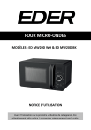 FOUR MICRO-ONDES MODÈLES : ED MW20D WH & ED MW20D BK NOTICE D’UTILISATION Avant l’installation ou la première utilisation de cet appareil, lire attentivement cette notice. La conserver soigneusement par la suite. TABLE DES MATIÈRES TABLE DES MATIÈRES ........................................................................................ 1 AVERTISSEMENTS.............................................................................................. 2 CONSIGNES DE SÉCURITÉ .................................................................................. 3 DESCRIPTION DE L’APPAREIL .......................................................................... 10 INSTALLATION ................................................................................................. 12 UTILISATION .................................................................................................... 17 CONSEILS DE CUISSON .................................................................................... 29 ENTRETIEN ET NETTOYAGE ............................................................................. 30 EN CAS DE PANNE ........................................................................................... 33 GARANTIE ........................................................................................................ 34 CARACTÉRISTIQUES TECHNIQUES................................................................... 35 PROTECTION DE L’ENVIRONNEMENT ............................................................. 36 1 AVERTISSEMENTS Vous venez d'acquérir un produit de la marque EDER et nous vous en remercions. Nous apportons un soin particulier au design, à l'ergonomie et à la simplicité d'usage de nos produits. Nous espérons que cet appareil vous donnera entière satisfaction. Dans le souci d'une amélioration constante de nos produits, nous nous réservons le droit d'apporter à leurs caractéristiques techniques, fonctionnelles ou esthétiques toutes modifications liées à leur évolution. LISEZ ATTENTIVEMENT CES INSTRUCTIONS AVANT D'UTILISER L'APPAREIL ET CONSERVEZ-LES POUR POUVOIR LES CONSULTER ULTÉRIEUREMENT. 2 CONSIGNES DE SÉCURITÉ CONSIGNES GÉNÉRALES DE SÉCURITÉ QUANT À L'UTILISATION D'UN APPAREIL ÉLECTRIQUE 1. AVERTISSEMENT : afin d’éviter tout risque d’incendie, d’électrocution ou de blessure, veillez à toujours suivre les consignes de sécurité suivantes quand vous utilisez un appareil électrique. 2. Veillez à ce que les différents types d’emballage (cartons, sacs en plastique, polystyrène, bandes collantes, liens, etc.) soient hors de portée des enfants. Ces éléments comportent un risque potentiel. 3. Lors du déballage de l'appareil, de son installation et avant chaque utilisation, vérifiez son bon état général. Si vous constatez une quelconque anomalie sur l'appareil, le cordon d'alimentation ou la fiche, n'utilisez pas l'appareil et adressez-vous au service après-vente pour qu'il soit vérifié ou réparé. 4. Cet appareil n’est pas destiné à un usage professionnel ou commercial, ou pour d’autre but que celui pour lequel il a été conçu. Cet appareil peut cependant être utilisé dans des applications domestiques et analogues telles que : 3 - des coins cuisine réservés au personnel dans des magasins, bureaux et autres environnements professionnels ; - des fermes ; - l’utilisation par les clients des hôtels, motels et autres environnements à caractère résidentiel ; - des environnements du type chambres d’hôtes. Mais n’est pas destiné à être utilisé dans : - la restauration et autres applications similaires y compris la vente au détail. 5. L’installation du produit doit respecter strictement les exigences de la norme NF C15-100. 6. Avant de brancher votre appareil, assurez-vous que la tension électrique de votre domicile correspond à celle indiquée sur la plaque signalétique de l'appareil. 7. Ne laissez pas l'appareil sans surveillance lorsqu'il fonctionne. 8. Cet appareil peut être utilisé par des enfants âgés d'au moins 8 ans et par des personnes ayant des capacités physiques, sensorielles ou mentales réduites ou dénuées d’expérience ou de connaissance, s'ils (si elles) sont correctement surveillé(e)s ou si des instructions relatives à l'utilisation de l'appareil en toute sécurité leur ont été données et si les risques encourus ont été appréhendés. Les enfants ne doivent pas jouer avec 4 l’appareil. Le nettoyage et l'entretien de l'appareil ne doivent pas être effectués par des enfants, à moins qu'ils ne soient âgés d'au moins 8 ans et qu'ils soient sous la surveillance d'un adulte. 9. Cet appareil n’est pas un jouet. Les enfants de moins de 8 ans ne doivent pas utiliser l'appareil. 10. Pour éviter tout risque d’incendie, d’électrocution ou autres blessures aux personnes, ne plongez jamais l'appareil, le cordon d’alimentation ou la fiche dans l’eau ou tout autre liquide. Ne manipulez pas l’appareil et la fiche avec les mains mouillées. 11. Le cordon d'alimentation doit être manipulé avec précaution. L'appareil ne doit pas être tiré par le cordon. Celui-ci ne doit pas être placé sur le rebord d'une table ou d'un plan de travail. Il ne doit pas entrer en contact avec des surfaces chaudes. Lorsque vous le débranchez, tirez-le toujours au niveau de la fiche, ne tirez pas sur le câble lui-même. 12. AVERTISSEMENT : Lors du positionnement de l’appareil, s’assurer que le cordon d’alimentation n’est pas coincé ni endommagé. 13. Si le cordon d’alimentation est endommagé, il doit être remplacé par le fabricant, son service après-vente ou une personne de qualification similaire, afin d'éviter tout danger. 5 14. Toute intervention sur l'appareil pendant son installation ou toute réparation doit être effectuée par le service après-vente ou une personne de qualification similaire. 15. Toute intervention ou nettoyage sur le produit doit se faire