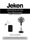 VENTILATEUR SUR PIED Avec Télécommande MODÈLE : OO15VPI30 noir NOTICE D’UTILISATION Avant l’installation ou la première utilisation de cet appareil, lire attentivement cette notice. La conserver soigneusement par la suite. 2 TABLE DES MATIÈRES TABLE DES MATIÈRES .............................................................................................3 CONSIGNES DE SÉCURITÉ.......................................................................................5 DESCRIPTION DU PRODUIT ................................................................................. 11 ASSEMBLAGE ....................................................................................................... 12 UTILISATION ......................................................................................................... 15 ENTRETIEN ET NETTOYAGE ................................................................................. 18 GARANTIE............................................................................................................. 19 CARACTÉRISTIQUES TECHNIQUES ...................................................................... 20 PROTECTION DE L’ENVIRONNEMENT ................................................................ 21 3 Vous venez d'acquérir un produit de la marque Jeken et nous vous en remercions. Nous apportons un soin particulier au design, à l'ergonomie et à la simplicité d'usage de nos produits. Nous espérons que cet appareil vous donnera entière satisfaction. Dans le souci d'une amélioration constante de nos produits, nous nous réservons le droit d'apporter à leurs caractéristiques techniques, fonctionnelles ou esthétiques toutes modifications liées à leur évolution. LISEZ ATTENTIVEMENT CES INSTRUCTIONS AVANT D'UTILISER L'APPAREIL ET CONSERVEZ-LES POUR POUVOIR LES CONSULTER ULTÉRIEUREMENT. 4 CONSIGNES DE SÉCURITÉ CONSIGNES GÉNÉRALES DE SÉCURITÉ QUANT À L'UTILISATION D'UN APPAREIL ÉLECTRIQUE 1. AVERTISSEMENT : afin d’éviter tout risque d’incendie, d’électrocution ou de blessure, veillez à toujours suivre les consignes de sécurité suivantes quand vous utilisez un appareil électrique. 2. Veillez à ce que les différents types d’emballage (cartons, sacs en plastique, polystyrène, bandes collantes, liens, etc.) soient hors de portée des enfants. Ces éléments comportent un risque potentiel. 3. Lors du déballage de l'appareil, de son installation et avant chaque utilisation, vérifiez son bon état général. Si vous constatez une quelconque anomalie sur l'appareil, le cordon d'alimentation ou la fiche, n'utilisez pas l'appareil et adressez-vous au service après-vente pour qu'il soit vérifié ou réparé. 4. Cet appareil n’est pas destiné à un usage professionnel ou commercial, ou pour d’autre but que celui pour lequel il a été conçu. Cet appareil peut cependant être utilisé dans des applications domestiques et analogues telles que : 5 - des coins cuisine réservés au personnel dans des magasins, bureaux et autres environnements professionnels ; - des fermes ; - l’utilisation par les clients des hôtels, motels et autres environnements à caractère résidentiel ; - des environnements du type chambres d’hôtes. Mais n’est pas destiné à être utilisé dans : - la restauration et autres applications similaires y compris la vente au détail. 5. L'installation du produit doit respecter strictement les exigences de la norme NF C15-100. 6. Avant de brancher votre appareil, assurez-vous que la tension électrique de votre domicile correspond à celle indiquée sur la plaque signalétique de l'appareil. 7. Ne laissez pas l'appareil sans surveillance lorsqu'il fonctionne. 8. Cet appareil peut être utilisé par des enfants âgés d'au moins 8 ans et par des personnes ayant des capacités physiques, sensorielles ou mentales réduites ou dénuées d’expérience ou de connaissance, s'ils (si elles) sont correctement surveillé(e)s ou si des instructions relatives à l'utilisation de l'appareil en toute sécurité leur ont été données et si les risques encourus ont été appréhendés. Les enfants ne doivent pas jouer 6 avec l’appareil. Le nettoyage et l'entretien de l'appareil ne doivent pas être effectués par des enfants, à moins qu'ils ne soient âgés d'au moins 8 ans et qu'ils soient sous la surveillance d'un adulte. 9. Cet appareil n’est pas un jouet. Les enfants de moins de 8 ans ne doivent pas utiliser l'appareil sans la surveillance d'un adulte. 10. Pour éviter tout risque d’incendie, d’électrocution ou autres blessures aux personnes, ne plongez jamais l'appareil, le cordon d’alimentation ou la fiche dans l’eau ou tout autre liquide. Ne manipulez pas l’appareil et la fiche avec les mains mouillées. 11. Le cordon d'alimentation doit être manipulé avec précaution. L'appareil ne doit pas être tiré par le cordon. Celui-ci ne doit pas être placé sur le rebord d'une table ou d'un plan de travail. Il ne doit pas entrer en contact avec des surfaces chaudes. Lorsque vous le débranchez, tirez-le toujours au niveau de la fiche, ne tirez pas sur le câble lui-même. 12. Si le cordon d’alimentation est endommagé, il doit être remplacé par le fabricant, son service après-vente ou une personne de qualification similaire, afin d'éviter tout danger. 7 13. Toute intervention sur l'appareil pendant son installation ou toute réparation doit être effectuée par le service après-vente ou une personne de qualification similaire. 14. Toute intervention ou nettoyage sur le produit doit se faire hors alimentation. Pour cela, la fiche d’alimentation doit être déconnectée de la prise de courant. 15. Le stockage de matériaux ou de liquides inflammables, de même que leur utilisation à proximité de l'appareil ou pour le nettoyage de l'appareil sont interdits. Les vapeurs peuvent provoquer un incendie ou une explosion. 16. N’utilisez que les accessoires fournis et recommandés par le fa