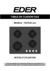 TABLE DE CUISSON GAZ MODÈLE : T20TG30 noir NOTICE D’UTILISATION Avant l’installation ou la première utilisation de cet appareil, lire attentivement cette notice. La conserver soigneusement par la suite. TABLE DES MATIÈRES TABLE DES MATIÈRES ........................................................................................ 1 AVERTISSEMENTS.............................................................................................. 2 CONSIGNES DE SÉCURITÉ .................................................................................. 3 DESCRIPTION DE L’APPAREIL .......................................................................... 13 INSTALLATION ................................................................................................. 14 UTILISATION .................................................................................................... 25 ENTRETIEN ET MAINTENANCE ........................................................................ 32 GUIDE DE DÉPANNAGE ................................................................................... 35 GARANTIE ........................................................................................................ 39 CARACTÉRISTIQUES TECHNIQUES ................................................................... 40 PROTECTION DE L’ENVIRONNEMENT ............................................................. 42 1 AVERTISSEMENTS Vous venez d'acquérir un produit de la marque EDER et nous vous en remercions. Nous apportons un soin particulier au design, à l'ergonomie et à la simplicité d'usage de nos produits. Nous espérons que cet appareil vous donnera entière satisfaction. Dans le souci d'une amélioration constante de nos produits, nous nous réservons le droit d'apporter à leurs caractéristiques techniques, fonctionnelles ou esthétiques toutes modifications liées à leur évolution. LISEZ ATTENTIVEMENT CES INSTRUCTIONS AVANT D'UTILISER L'APPAREIL ET CONSERVEZ-LES POUR POUVOIR LES CONSULTER ULTÉRIEUREMENT. 2 CONSIGNES DE SÉCURITÉ CONSIGNES GÉNÉRALES DE SÉCURITÉ QUANT À L'UTILISATION D'UN APPAREIL ÉLECTRIQUE 1. AVERTISSEMENT : afin d’éviter tout risque d’incendie, d’électrocution ou de blessure, veillez à toujours suivre les consignes de sécurité suivantes quand vous utilisez un appareil électrique. 2. Veillez à ce que les différents types d’emballage (cartons, sacs en plastique, polystyrène, bandes collantes, liens, etc.) soient hors de portée des enfants. Ces éléments comportent un risque potentiel. 3. Lors du déballage de l'appareil, de son installation et avant chaque utilisation, vérifiez son bon état général. Si vous constatez une quelconque anomalie sur l'appareil, le cordon d'alimentation ou la fiche, n'utilisez pas l'appareil et adressez-vous au service après-vente pour qu'il soit vérifié ou réparé. 4. Cet appareil n’est pas destiné à un usage professionnel ou commercial, ou pour d’autre but que celui pour lequel il a été conçu. Cet appareil peut cependant être utilisé dans des applications domestiques et analogues telles que : 3 - des coins cuisine réservés au personnel dans des magasins, bureaux et autres environnements professionnels ; - des fermes ; - l’utilisation par les clients des hôtels, motels et autres environnements à caractère résidentiel ; - des environnements du type chambres d’hôtes. Mais n’est pas destiné à être utilisé dans : - la restauration et autres applications similaires y compris la vente au détail. 5. L’installation du produit doit respecter strictement les exigences de la norme NF C15-100. 6. Avant de brancher votre appareil, assurez-vous que la tension électrique de votre domicile correspond à celle indiquée sur la plaque signalétique de l'appareil. 7. Ne laissez pas l'appareil sans surveillance lorsqu'il fonctionne. 8. Cet appareil peut être utilisé par des enfants âgés d'au moins 8 ans et par des personnes ayant des capacités physiques, sensorielles ou mentales réduites ou dénuées d’expérience ou de connaissance, s'ils (si elles) sont correctement surveillé(e)s ou si des instructions relatives à l'utilisation de l'appareil en toute sécurité leur ont été 4 données et si les risques encourus ont été appréhendés. Les enfants ne doivent pas jouer avec l’appareil. Le nettoyage et l'entretien par l'usager ne doivent pas être effectués par des enfants sans surveillance. 9. Il convient de surveiller les enfants pour s’assurer qu’ils ne jouent pas avec l’appareil. 10. Pour éviter tout risque d’incendie, d’électrocution ou autres blessures aux personnes, ne plongez jamais l'appareil, le cordon d’alimentation ou la fiche dans l’eau ou tout autre liquide. Ne manipulez pas l’appareil et la fiche avec les mains mouillées. 11. Le cordon d'alimentation doit être manipulé avec précaution. L'appareil ne doit pas être tiré par le cordon. Celui-ci ne doit pas être placé sur le rebord d'une table ou d'un plan de travail. Il ne doit pas entrer en contact avec des surfaces chaudes. Lorsque vous le débranchez, tirez-le toujours au niveau de la fiche, ne tirez pas sur le câble lui-même. 12. AVERTISSEMENT : Lors du positionnement de l’appareil, s’assurer que le cordon d’alimentation n’est pas coincé ni endommagé. 13. Si le cordon d’alimentation est endommagé, il doit être remplacé par le fabricant, son service après5 vente ou une personne de qualification similaire, afin d'éviter tout danger. 14. Toute intervention sur l'appareil pendant son installation ou toute réparation doit être effectuée par le service après-vente ou une personne de qualification similaire. 15. Toute intervention ou nettoyage sur le produit doit se faire hors alimentation. Pour cela, la fiche d’alimentation doit être déconnectée de la prise de courant. 16. Le stockage de matériaux ou de liquides inflammables, de même que leur utilisation à proximité de l