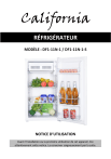 RÉFRIGÉRATEUR MODÈLE : DF1-11N-1 / DF1-11N-1-S NOTICE D’UTILISATION Avant l’installation ou la première utilisation de cet appareil, lire attentivement cette notice. La conserver soigneusement par la suite. TABLE DES MATIÈRES TABLE DES MATIÈRES ........................................................................................ 1 CONSIGNES DE SÉCURITÉ .................................................................................. 3 DESCRIPTION DE L’APPAREIL .......................................................................... 11 INSTALLATION ................................................................................................. 12 RÉGLAGE DE LA TEMPÉRATURE ...................................................................... 17 UTILISATION .................................................................................................... 20 ENTRETIEN ET MAINTENANCE ........................................................................ 22 MODIFICATION DU SENS D’OUVERTURE DE LA PORTE .................................. 26 GUIDE DE DÉPANNAGE ................................................................................... 29 CONSEILS POUR RÉDUIRE VOTRE CONSOMMATION D’ÉNERGIE ................... 32 GARANTIE ........................................................................................................ 33 CARACTÉRISTIQUES TECHNIQUES................................................................... 34 PROTECTION DE L’ENVIRONNEMENT ............................................................. 40 1 Vous venez d'acheter notre produit et nous vous remercions. Nous apportons un soin particulier au design, à l'ergonomie et à la simplicité d'usage de nos produits. Nous espérons que cet appareil vous donnera entière satisfaction. Dans le souci d'une amélioration constante de nos produits, nous nous réservons le droit d'apporter à leurs caractéristiques techniques, fonctionnelles ou esthétiques toutes modifications liées à leur évolution. LISEZ ATTENTIVEMENT CES INSTRUCTIONS AVANT D'UTILISER L'APPAREIL ET CONSERVEZ-LES POUR POUVOIR LES CONSULTER ULTÉRIEUREMENT. 2 CONSIGNES DE SÉCURITÉ CONSIGNES GÉNÉRALES DE SÉCURITÉ QUANT À L'UTILISATION D'UN APPAREIL ÉLECTRIQUE 1. AVERTISSEMENT : afin d’éviter tout risque d’incendie, d’électrocution ou de blessure, veillez à toujours suivre les consignes de sécurité suivantes quand vous utilisez un appareil électrique. 2. Veillez à ce que les différents types d’emballage (cartons, sacs en plastique, polystyrène, bandes collantes, liens, etc.) soient hors de portée des enfants. Ces éléments comportent un risque potentiel. 3. Lors du déballage de l'appareil, de son installation et avant chaque utilisation, vérifiez son bon état général. Si vous constatez une quelconque anomalie sur l'appareil, le cordon d'alimentation ou la fiche, n'utilisez pas l'appareil et adressez-vous au service après-vente pour qu'il soit vérifié ou réparé. 4. Cet appareil n’est pas destiné à un usage professionnel ou commercial, ou pour d’autre but que celui pour lequel il a été conçu. Cet appareil peut cependant être utilisé dans des applications domestiques et analogues telles que : 3 - des coins cuisine réservés au personnel dans des magasins, bureaux et autres environnements professionnels ; - des fermes ; - l’utilisation par les clients des hôtels, motels et autres environnements à caractère résidentiel ; - des environnements du type chambres d’hôtes. Mais n’est pas destiné à être utilisé dans : - la restauration et autres applications similaires y compris la vente au détail. - également non destiné à être utilisé comme appareil encastrable. 5. L’installation du produit doit respecter strictement les exigences de la norme NF C15-100. 6. Avant de brancher votre appareil, assurez-vous que la tension électrique de votre domicile correspond à celle indiquée sur la plaque signalétique de l'appareil. 7. Ne laissez pas l'appareil sans surveillance lorsqu'il fonctionne. 8. Cet appareil peut être utilisé par des enfants âgés d'au moins 8 ans et par des personnes ayant des capacités physiques, sensorielles ou mentales réduites ou dénuées d’expérience ou de connaissance, s'ils (si elles) sont correctement surveillé(e)s ou si des 4 instructions relatives à l'utilisation de l'appareil en toute sécurité leur ont été données et si les risques encourus ont été appréhendés. Les enfants ne doivent pas jouer avec l’appareil. Le nettoyage et l'entretien par l'usager ne doivent pas être effectués par des enfants sans surveillance. 9. Cet appareil n’est pas un jouet. Les enfants de moins de 8 ans ne doivent pas utiliser l'appareil sans la surveillance d'un adulte. 10. Pour éviter tout risque d’incendie, d’électrocution ou autres blessures aux personnes, ne plongez jamais l'appareil, le cordon d’alimentation ou la fiche dans l’eau ou tout autre liquide. Ne manipulez pas l’appareil et la fiche avec les mains mouillées. 11. Le cordon d'alimentation doit être manipulé avec précaution. L'appareil ne doit pas être tiré par le cordon. Celui-ci ne doit pas être placé sur le rebord d'une table ou d'un plan de travail. Il ne doit pas entrer en contact avec des surfaces chaudes. Lorsque vous le débranchez, tirez-le toujours au niveau de la fiche, ne tirez pas sur le câble lui-même. 12. AVERTISSEMENT : Lors du positionnement de l’appareil, s’assurer que le cordon d’alimentation n’est pas coincé ni endommagé. 5 13. Si le cordon d’alimentation est endommagé, il doit être remplacé par le fabricant, son service après-vente ou une personne de qualification similaire, afin d'éviter tout danger. 14. Toute intervention sur l'appareil pendant son installation ou toute réparation doit être effectuée par le service après-vente ou une personne de qualification similaire. 15. Toute intervention ou nettoyage sur le 