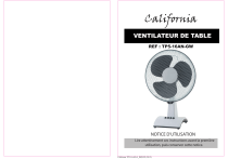 VENTILATEUR DE TABLE REF : TP5-16AN-GW NOTICE D’UTILISATION Lire attentivement ces instructions avant la première utilisation, puis conserver cette notice. California TP5-16AN-G_IB(NOV,2015) TABLE DES MATIÈRES AVERTISSEMENTS CONSIGNES DE SECURITÉ CARACTÉRISTIQUES NOMENCLATURE MONTAGE UTILISATION ENTRETIEN - NETTOYAGE RÉPARATIONS PROTECTION DE L’ENVIRONNEMENT 1 2 6 6 7 7 8 8 9 AVERTISSEMENTS Le fabricant décline toute responsabilité en cas de blessure causée à des personnes ou de dégât matériel dus à la nonobservation des instructions d’entretien et à l’usage inadéquat de l’appareil. Après avoir retiré l’emballage des différentes pièces de l’appareil, vérifiez que celui-ci se trouve en parfait état. Si vous avez des doutes à ce sujet, n’utilisez pas l’appareil et adressez-vous à un vendeur ou à un technicien qualifié. Veillez également à ce que les différents types d’emballage (cartons, sacs en plastique, polystyrène, bandes collantes, liens, etc.) soient hors de portée des enfants. Ces éléments Ces éléments comportent un risque potentiel. Avant d’utiliser l’appareil, vérifiez si le courant de votre secteur correspond à celui qui est indiqué sur la plaque signalétique. Quand vous utilisez cet appareil, veuillez suivre les consignes de sécurité suivantes. MISES EN GARDE IMPORTANTES. LIRE ATTENTIVEMENT ET CONSERVER POUR RÉFÉRENCE ULTÉRIEURE. CONSIGNES DE SECURITÈ Avant l’utilisation de cet appareil, lisez attentivement la notice d’utilisation. Conservez cette notice avec soin. Vérifiez premièrement si la tension indiquée sur le produit correspond à votre alimentation électrique. Avertissement : afin d’éviter tout risque d’incendie, d’électrocution ou de blessure, veillez à toujours suivre les principales consignes de sécurité suivantes quand vous utilisez un appareil électrique. Vérifiez régulièrement l’état de votre appareil. N’utilisez pas l’appareil si ce dernier est endommagé. Ne manipulez ni l’appareil, ni la prise avec les mains mouillées. N’utilisez pas l’appareil si le cordon d’alimentation ou la prise est endommagé(e). N’utilisez pasl’appareil s’il est tombé, s’il est endommagé, s’il est resté dehors ou s’il est tombé dans l’eau. Retournez l’appareil au service après-vente le plus proche pour qu’il soit réparé ou ajusté. Ne tirez et ne portez pas l’appareil par le cordon d’alimentation, n’utilisez pas le cordon comme poignée, ne coincez pas le fil 1 2 8000 California ST10-508_IB dans la porte et ne le tirez pas le long de bords ou angles acérés. Ne placez pas l’appareil sur le cordon d’alimentation. Ne laissez en aucune façon le cordon s’enrouler ou s’emmêler. Tenez le cordon éloigné des surfaces chaudes. Ne retirez pas la prise en tirant sur le cordon. Pour la retirer, prenez-la en main et retirez-la prudemment de la prise murale. Utilisez uniquement une rallonge certifiée avec l’ampérage en vigueur dans votre pays. Des rallonges certifiées avec un ampérage inférieur risquent de surchauffer. Veillez à ce que personne ne trébuche sur le cordon ou la prise. Attention : débranchez toujours le cordon d'alimentation ou coupez le disjoncteur avant de procéder au nettoyage. Si le cordon d’alimentation est endommagé, il doit être remplacé par le fabricant, son service après-vente ou une personne de qualification similaire, afin d'éviter tout danger. Toute réparation doit être effectuée par le service après-vente ou des personnes de qualification similaire. Tous travaux électriques requis dans le cadre de l’installation de cet appareil doivent être effectués par un électricien qualifié ou une personne compétente. Eteignez et débranchez l’appareil lorsque vous ne l’utilisez pas. N’utilisez pas l’appareil près de matériaux inflammables. N’utilisez pas d’autres accessoires que ceux étant fournis avec l’appareil. Il convient de surveiller les enfants pour s’assurer qu’ils ne jouent pas avec l’appareil. Cet appareil n’est pas un jouet. Ayez une stricte surveillance quand vous utilisez l’appareil en présence d’enfants ou d’animaux domestiques. Ne nettoyez jamais l’appareil avec des produits liquides inflammables. Les vapeurs risqueraient de provoquer un incendie ou une explosion. Cet appareil peut être utilisé par des enfants âgés d'au moins 8 ans et par des personnes ayant des capacités physiques, sensorielles ou mentales réduites ou dénuées d’expérience ou de connaissance, s'ils (si elles) sont correctement surveillé(e)s ou si des instructions relatives à l'utilisation de l'appareil en toute sécurité leur ont été données et si les risques encourus ont été appréhendés. Les enfants ne doivent pas jouer avec l’appareil. Le nettoyage et l'entretien par l'usager ne doivent pas être effectués par des enfants sans surveillance. Ne stockez pas et n’utilisez pas d’essence ou toute autre vapeur ou liquide inflammable à proximité de cet appareil. Les fumées peuvent entraîner un incendie ou une explosion. Cet appareil est destiné à être utilisé dans des applications domestiques et analogues telles que : - les coins cuisine réservés au personnel des magasins, bureaux et autres environnements professionnels ; - les fermes ; - l’utilisation par les clients des hôtels, motels et autres environnements à caractère résidentiel ; - les environnements du type chambres d’hôtes. Toutes interventions ou nettoyage sur le produit doivent se faire 3 4 California KS-92L_IB CARACTÉRISTIQUES hors alimentation. Pour cela la fiche d’alimentation doit être déconnectée de la prise de courant. Pour éviter tout risque d’incendie, d’électrocution ou autres blessures aux personnes, ne plongez jamais le cordon d’alimentation ou la prise dans de l’eau ou tout autre liquide. Avertissement ! Une fois l’installation terminée, il est strictement interd