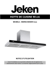 HOTTE DE CUISINE 90 cm MODÈLE : MMM14H9044 inox NOTICE D’UTILISATION Avant l’installation ou la première utilisation de cet appareil, lire attentivement cette notice. La conserver soigneusement par la suite. TABLE DES MATIÈRES TABLE DES MATIÈRES ........................................................................................ 1 AVERTISSEMENTS.............................................................................................. 3 CONSIGNES DE SÉCURITÉ .................................................................................. 4 DESCRIPTION DU PRODUIT ............................................................................. 10 INSTALLATION ................................................................................................. 11 UTILISATION .................................................................................................... 18 ENTRETIEN ET NETTOYAGE ............................................................................. 19 GUIDE DE DÉPANNAGE ................................................................................... 22 GARANTIE ........................................................................................................ 24 CARACTÉRISTIQUES TECHNIQUES................................................................... 25 PROTECTION DE L’ENVIRONNEMENT ............................................................. 27 1 Vous venez d'acheter notre produit et nous vous remercions. Nous apportons un soin particulier au design, à l'ergonomie et à la simplicité d'usage de nos produits. Nous espérons que cet appareil vous donnera entière satisfaction. Dans le souci d'une amélioration constante de nos produits, nous nous réservons le droit d'apporter à leurs caractéristiques techniques, fonctionnelles ou esthétiques toutes modifications liées à leur évolution. LISEZ ATTENTIVEMENT CES INSTRUCTIONS AVANT D'UTILISER L'APPAREIL ET CONSERVEZ-LES POUR POUVOIR LES CONSULTER ULTÉRIEUREMENT. 2 AVERTISSEMENTS Le fabricant décline toute responsabilité en cas de blessure causée à des personnes ou de dégât matériel dus à la non-observation des instructions d’entretien et à l’usage inadéquat de l’appareil. Après avoir retiré l’emballage des différentes pièces de l’appareil, vérifiez que celui-ci se trouve en parfait état. Si vous avez des doutes à ce sujet, n’utilisez pas l’appareil et adressezvous à un vendeur ou à un technicien qualifié. Veillez également à ce que les différents types d’emballage (cartons, sacs en plastique, polystyrène, bandes collantes, liens, etc.) soient hors de portée des enfants. Ces éléments comportent un risque potentiel. Avant d’utiliser l’appareil, vérifiez si le courant de votre secteur correspond à celui qui est indiqué sur la plaque signalétique. Quand vous utilisez cet appareil, veuillez suivre les consignes de sécurité suivantes. 3 CONSIGNES DE SÉCURITÉ Avant l’utilisation de cet appareil, lisez attentivement la notice d’utilisation. Conservez cette notice avec soin. 1. Vérifiez premièrement si la tension indiquée sur le produit correspond à votre alimentation électrique. 2. AVERTISSEMENT : afin d’éviter tout risque d’incendie, d’électrocution ou de blessure, veillez à toujours suivre les principales consignes de sécurité suivantes quand vous utilisez un appareil électrique. 3. Vérifiez régulièrement l’état de votre appareil. N’utilisez pas l’appareil si ce dernier est endommagé. 4. Ne manipulez ni l’appareil, ni la prise avec les mains mouillées. 5. N’utilisez pas l’appareil si le cordon d’alimentation ou la prise est endommagé(e). N’utilisez pas l’appareil s’il est tombé, s’il est endommagé, s’il est resté dehors ou s’il est tombé dans l’eau. Retournez l’appareil au service après-vente le plus proche pour qu’il soit réparé ou ajusté. 6. Ne tirez et ne portez pas l’appareil par le cordon d’alimentation, n’utilisez pas le cordon comme poignée, ne coincez pas le fil dans la porte et ne le tirez pas le long de bords ou angles acérés. 4 7. Ne placez pas l’appareil sur le cordon d’alimentation. Ne laissez en aucune façon le cordon s’enrouler ou s’emmêler. Tenez le cordon éloigné des surfaces chaudes. 8. Ne retirez pas la prise en tirant sur le cordon. Pour la retirer, prenez-la en main et retirez-la prudemment de la prise murale. 9. Utilisez uniquement une rallonge certifiée avec l’ampérage en vigueur dans votre pays. Des rallonges certifiées avec un ampérage inférieur risquent de surchauffer. Veillez à ce que personne ne trébuche sur le cordon ou la prise. 10. ATTENTION : débranchez toujours le cordon d'alimentation ou coupez le disjoncteur avant de procéder au nettoyage. 11. Si le cordon d’alimentation est endommagé, il doit être remplacé par le fabricant, son service aprèsvente ou une personne de qualification similaire, afin d'éviter tout danger. 12. Toute réparation doit être effectuée par le service après-vente ou des personnes de qualification similaire. 13. Éteignez et débranchez I’appareil lorsque vous ne I’utilisez pas. 5 14. Tous travaux électriques requis dans le cadre de l’installation de cet appareil doivent être effectués par un électricien qualifié ou une personne compétente. 15. AVERTISSEMENT : Ne pas suivre les instructions pour l’installation des vis ou dispositifs de fixation peut entraîner des dangers électriques. 16. N’utilisez pas l’appareil près de matériaux inflammables. 17. N’utilisez pas d’autres accessoires que ceux étant fournis avec l’appareil. 18. Cet appareil peut être utilisé par des enfants âgés d'au moins 8 ans et par des personnes ayant des capacités physiques, sensorielles ou mentales réduites ou dénuées d’expérience ou de connaissance, s'ils (si elles) sont correctement surveillé(e)s ou si des instructions relatives à l'utilisation de l'app