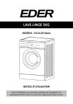 LAVE-LINGE 5KG MODÈLE : K11LL25 blanc NOTICE D’UTILISATION Avant l’installation ou la première utilisation de cet appareil, lire attentivement cette notice. La conserver soigneusement par la suite. TABLE DES MATIÈRES TABLE DES MATIÈRES ........................................................................................ 1 AVERTISSEMENTS.............................................................................................. 2 CONSIGNES DE SÉCURITÉ .................................................................................. 3 DESCRIPTION DE L’APPAREIL .......................................................................... 12 INSTALLATION ................................................................................................. 13 BANDEAU DE COMMANDES ........................................................................... 23 UTILISATION .................................................................................................... 28 ENTRETIEN ET NETTOYAGE ............................................................................. 35 PANNES ET SOLUTIONS ................................................................................... 38 GARANTIE ........................................................................................................ 42 CARACTÉRISTIQUES TECHNIQUES................................................................... 43 SCHÉMA ÉLECTRIQUE ..................................................................................... 47 PROTECTION DE L’ENVIRONNEMENT ............................................................. 48 1 AVERTISSEMENTS Vous venez d'acquérir un produit de la marque Eder et nous vous en remercions. Nous apportons un soin particulier au design, à l'ergonomie et à la simplicité d'usage de nos produits. Nous espérons que cet appareil vous donnera entière satisfaction. Dans le souci d'une amélioration constante de nos produits, nous nous réservons le droit d'apporter à leurs caractéristiques techniques, fonctionnelles ou esthétiques toutes modifications liées à leur évolution. LISEZ ATTENTIVEMENT CES INSTRUCTIONS AVANT D'UTILISER L'APPAREIL ET CONSERVEZ-LES POUR POUVOIR LES CONSULTER ULTÉRIEUREMENT. 2 CONSIGNES DE SÉCURITÉ CONSIGNES GÉNÉRALES DE SÉCURITÉ QUANT À L'UTILISATION D'UN APPAREIL ÉLECTRIQUE 1. AVERTISSEMENT : afin d’éviter tout risque d’incendie, d’électrocution ou de blessure, veillez à toujours suivre les consignes de sécurité suivantes quand vous utilisez un appareil électrique. 2. Veillez à ce que les différents types d’emballage (cartons, sacs en plastique, polystyrène, bandes collantes, liens, etc.) soient hors de portée des enfants. Ces éléments comportent un risque potentiel. 3. Lors du déballage de l'appareil, de son installation et avant chaque utilisation, vérifiez son bon état général. Si vous constatez une quelconque anomalie sur l'appareil, le cordon d'alimentation ou la fiche, n'utilisez pas l'appareil et adressez-vous au service aprèsvente pour qu'il soit vérifié ou réparé. 3 4. Cet appareil n’est pas destiné à un usage professionnel ou commercial, ou pour d’autre but que celui pour lequel il a été conçu. Cet appareil peut cependant être utilisé dans des applications domestiques et analogues telles que : - des coins cuisine réservés au personnel dans des magasins, bureaux et autres environnements professionnels ; - des fermes ; - l’utilisation par les clients des hôtels, motels et autres environnements à caractère résidentiel ; - des environnements du type chambres d’hôtes. Mais n’est pas destiné à être utilisé dans : - la restauration et autres applications similaires y compris la vente au détail. 5. L’installation du produit doit respecter strictement les exigences de la norme NF C15100. 6. Avant de brancher votre appareil, assurezvous que la tension électrique de votre domicile correspond à celle indiquée sur la plaque signalétique de l'appareil. 4 7. Ne laissez pas l'appareil sans surveillance lorsqu'il fonctionne. 8. Cet appareil peut être utilisé par des enfants âgés d'au moins 8 ans et par des personnes ayant des capacités physiques, sensorielles ou mentales réduites ou dénuées d’expérience ou de connaissance, s'ils (si elles) sont correctement surveillé(e)s ou si des instructions relatives à l'utilisation de l'appareil en toute sécurité leur ont été données et si les risques encourus ont été appréhendés. Les enfants ne doivent pas jouer avec l’appareil. Le nettoyage et l'entretien par l'usager ne doivent pas être effectués par des enfants sans surveillance. 9. Pour éviter tout risque d’incendie, d’électrocution ou autres blessures aux personnes, ne plongez jamais l'appareil, le cordon d’alimentation ou la fiche dans l’eau ou tout autre liquide. Ne manipulez pas l’appareil et la fiche avec les mains mouillées. 10. Le cordon d'alimentation doit être manipulé avec précaution. L'appareil ne doit pas être tiré par le cordon. Celui-ci ne doit pas être placé sur le rebord d'une table ou d'un plan de travail. 5 Il ne doit pas entrer en contact avec des surfaces chaudes. Lorsque vous le débranchez, tirez-le toujours au niveau de la fiche, ne tirez pas sur le câble lui-même. 11. AVERTISSEMENT : Lors du positionnement de l’appareil, s’assurer que le cordon d’alimentation n’est pas coincé ni endommagé. 12. Si le cordon d’alimentation est endommagé, il doit être remplacé par le fabricant, son service après-vente ou une personne de qualification similaire, afin d'éviter tout danger. 13. Toute intervention sur l'appareil pendant son installation ou toute réparation doit être effectuée par le service après-vente ou une personne de qualification similaire. 14. Toute intervention ou nettoyage sur le produit doit se faire hors alimentation. Pour cela, la fiche d’alimentation doit être déconnectée de la prise de courant. 15. 