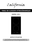 TABLE DE CUISSON VITROCÉRAMIQUE MODÈLE : HC2-1 NOTICE D’UTILISATION Avant l’installation ou la première utilisation de cet appareil, lire attentivement cette notice. La conserver soigneusement par la suite. TABLE DES MATIÈRES TABLE DES MATIÈRES ..................................................................................... 1 AVERTISSEMENTS .......................................................................................... 2 CONSIGNES DE SÉCURITÉ ............................................................................... 3 DESCRIPTION DE L’APPAREIL .......................................................................... 9 CONSIGNES D’INSTALLATION ....................................................................... 10 UTILISATION ................................................................................................ 18 ENTRETIEN ET NETTOYAGE .......................................................................... 24 GUIDE DE DÉPANNAGE ................................................................................ 28 AUTRES CONSEILS D’UTILISATION ................................................................ 29 CARACTÉRISTIQUES TECHNIQUES ................................................................ 30 PROTECTION DE L’ENVIRONNEMENT ........................................................... 32 1 AVERTISSEMENTS Le fabricant décline toute responsabilité en cas de blessure causée à des personnes ou de dégât matériel dus à la non-observation des instructions d’entretien et à l’usage inadéquat de l’appareil. Après avoir retiré l’emballage des différentes pièces de l’appareil, vérifiez que celui-ci se trouve en parfait état. Si vous avez des doutes à ce sujet, n’utilisez pas l’appareil et adressezvous à un vendeur ou à un technicien qualifié. Veillez également à ce que les différents types d’emballage (cartons, sacs en plastique, polystyrène, bandes collantes, liens, etc.) soient hors de portée des enfants. Ces éléments comportent un risque potentiel. Avant d’utiliser l’appareil, vérifiez si le courant de votre secteur correspond à celui qui est indiqué sur la plaque signalétique. Quand vous utilisez cet appareil, veuillez suivre les consignes de sécurité suivantes. MISES EN GARDE IMPORTANTES. LIRE ATTENTIVEMENT ET CONSERVER POUR RÉFÉRENCE ULTÉRIEURE. Avant l’utilisation de cet appareil, lisez attentivement la notice d’utilisation. Conservez cette notice avec soin. 2 CONSIGNES DE SÉCURITÉ 1. Vérifiez premièrement si la tension indiquée sur le produit correspond à votre alimentation électrique. 2. Avertissement : afin d’éviter tout risque d’incendie, d’électrocution ou de blessure, veillez à toujours suivre les principales consignes de sécurité suivantes quand vous utilisez un appareil électrique. 3. Vérifiez régulièrement l’état de votre appareil. N’utilisez pas l’appareil si ce dernier est endommagé. 4. Ne manipulez ni l’appareil, ni la prise avec les mains mouillées. 5. N’utilisez pas l’appareil si le cordon d’alimentation ou la prise est endommagé(e). N’utilisez pas l’appareil s’il est tombé, s’il est endommagé, s’il est resté dehors ou s’il est tombé dans l’eau. Retournez l’appareil au service après-vente le plus proche pour qu’il soit réparé ou ajusté. 6. Ne tirez et ne portez pas l’appareil par le cordon d’alimentation, n’utilisez pas le cordon comme poignée, ne coincez pas le fil dans la porte et ne le tirez pas le long de bords ou angles acérés. 7. Ne placez pas l’appareil sur le cordon d’alimentation. Ne laissez en aucune façon le cordon s’enrouler ou 3 s’emmêler. Tenez le cordon éloigné des surfaces chaudes. 8. Ne retirez pas la prise en tirant sur le cordon. Pour la retirer, prenez-la en main et retirez-la prudemment de la prise murale. 9. Utilisez uniquement une rallonge certifiée avec l’ampérage correspondant à votre installation électrique. L’utilisation d’une rallonge non certifiée et/ou avec un ampérage inférieur risquerait de surchauffer et de provoquer un incendie. 10. Attention : débranchez toujours le cordon d'alimentation ou coupez le disjoncteur avant de procéder au nettoyage. 11. Si le cordon d’alimentation est endommagé, il doit être remplacé par le fabricant, son service après-vente ou une personne de qualification similaire, afin d'éviter tout danger. 12. Toute réparation doit être effectuée par le service après-vente ou des personnes qualifiées. 13. Tous travaux électriques requis dans le cadre de l’installation de cet appareil doivent être effectués par un électricien qualifié ou une personne compétente. 14. Éteignez et débranchez l’appareil lorsque vous ne l’utilisez pas. 4 15. N’utilisez pas l’appareil près de matériaux inflammables. 16. N’utilisez pas d’autres accessoires que ceux étant fournis avec l’appareil. 17. L’appareil n’est pas destiné à être mis en fonctionnement au moyen d’une minuterie extérieure ou par un système de commande à distance séparée. 18. Cet appareil peut être utilisé par des enfants âgés d'au moins 8 ans et par des personnes ayant des capacités physiques, sensorielles ou mentales réduites ou dénuées d’expérience ou de connaissance, s'ils (si elles) sont correctement surveillé(e)s ou si des instructions relatives à l'utilisation de l'appareil en toute sécurité leur ont été données et si les risques encourus ont été appréhendés. Les enfants ne doivent pas jouer avec l’appareil. Le nettoyage et l'entretien par l'usager ne doivent pas être effectués par des enfants sans surveillance. 19. Il convient de surveiller les enfants pour s’assurer qu’ils ne jouent pas avec l’appareil. 20. Cet appareil n’est pas un jouet. Ayez une stricte surveillance quand vous utilisez l’appareil en présence d’enfants ou d’animaux domestiques. 5 21. Ne nettoye
