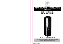 RÉFRIGÉRATEUR - CONGÉLATEUR VINTAGE REF : COMB300N (BCD-310C-C53H) NOTICE D’UTILISATION Lire attentivement ces instructions avant la première utilisation, puis conserver cette notice. BCD-310C-GB_v1_Sep-16 TABLE DES MATIÈRES AVERTISSEMENTS CONSIGNES DE SECURITÉ NOMENCLATURE INSTALLATION UTILISATION INSTALLATION DE L’INDICATEUR DE TEMPÉRATURE VÉRIFICATION DE LA TEMPÉRATURE DANS LA ZONE LA PLUS FROIDE CONSERVATION DES ALIMENTS DANS LE RÉFRIGÉRATEUR EN FONCTION DE LEUR NATURE UTILISATION DU COMPARTIMENT CONGÉLATEUR CONSEILS POUR RÉDUIRE VOTRE CONSOMMATION D’ÉNERGIE ENTRETIEN - NETTOYAGE DÉGIVRAGE DÉCONNEXION DE L'APPAREIL EMBALLAGE ET DÉPLACEMENT NOTIFICATIONS UTILISATEUR CONSEILS POUR LE DÉPANNAGE CARACTÉRISTIQUES PROTECTION DE L’ENVIRONNEMENT 1 2 8 9 10 11 12 13 13 14 15 16 16 17 17 18 19 20 AVERTISSEMENTS Veillez également à ce que les différents types d’emballage (cartons, sacs en plastique, polystyrène, bandes collantes, liens, etc.) soient hors de portée des enfants. Ces éléments comportent un risque potentiel. Avant d’utiliser l’appareil, vérifiez si le courant de votre secteur correspond à celui qui est indiqué sur la plaque signalétique. Quand vous utilisez cet appareil, veuillez suivre les consignes de sécurité suivantes. MISES EN GARDE IMPORTANTES. ET CONSERVER ATTENTIVEMENT RÉFÉRENCE ULTÉRIEURE. LIRE POUR CONSIGNES DE SECURITÉ Le fabricant décline toute responsabilité en cas de blessure causée à des personnes ou de dégât matériel dus à la non-observation des instructions d’entretien et à l’usage inadéquat de l’appareil. Après avoir retiré l’emballage des différentes pièces de l’appareil, vérifiez que celui-ci se trouve en parfait état. Si vous avez des doutes à ce sujet, n’utilisez pas l’appareil et adressez-vous à un vendeur ou à un technicien qualifié. Avant l’utilisation de cet appareil, lisez attentivement la notice d’utilisation. Conservez cette notice avec soin. Vérifiez premièrement si la tension indiquée sur le produit correspond à votre alimentation électrique. Avertissement : afin d’éviter tout risque d’incendie, d’électrocution ou de blessure, veillez à toujours suivre les principales consignes de sécurité suivantes quand vous utilisez un appareil électrique. 1 2 1. Vérifiez régulièrement l’état de votre appareil. N’utilisez pas l’appareil si ce dernier est endommagé. 2. Ne manipulez ni l’appareil, ni la prise avec les mains mouillées. 3. N’utilisez pas l’appareil si le cordon d’alimentation ou la prise est endommagé(e). N’utilisez pas l’appareil s’il est tombé, s’il est endommagé, s’il est resté dehors ou s’il est tombé dans l’eau. Retournez l’appareil au service après-vente le plus proche pour qu’il soit réparé ou ajusté. 4. Ne tirez et ne portez pas l’appareil par le cordon d’alimentation, n’utilisez pas le cordon comme poignée, ne coincez pas le fil dans la porte et ne le tirez pas le long de bords ou angles acérés. 5. Ne placez pas l’appareil sur le cordon d’alimentation. Ne laissez en aucune façon le cordon s’enrouler ou s’emmêler. Tenez le cordon éloigné des surfaces chaudes. 6. Ne retirez pas la prise en tirant sur le cordon. Pour la retirer, prenez-la en main et retirez-la prudemment de la prise murale. 7. Utilisez uniquement une rallonge certifiée avec l’ampérage en vigueur dans votre pays. Des rallonges certifiées avec un ampérage inférieur risquent de surchauffer. Veillez à ce que personne ne trébuche sur le cordon ou la prise. 8. Attention : débranchez toujours le cordon d'alimentation ou coupez le disjoncteur avant de procéder au nettoyage. 9. Si le cordon d’alimentation est endommagé, il doit être remplacé par le fabricant, son service après-vente ou une personne de qualification similaire, afin d'éviter tout danger. 10. Toute réparation doit être effectuée par le service après-vente ou des personnes de qualification similaire. 11. Tous travaux électriques requis dans le cadre de l’installation de cet appareil doivent être effectués par un électricien qualifié ou une personne compétente. 12. Eteignez et débranchez l’appareil lorsque vous ne l’utilisez pas. 13. N’utilisez pas l’appareil près de matériaux inflammables. 14. N'utilisez pas d'autres accessoires que ceux étant fournis avec l'appareil. 15. Cet appareil peut être utilisé par des enfants âgés d'au moins 8 ans et par des personnes ayant des capacités physiques, sensorielles ou mentales réduites ou dénuées d’expérience ou de connaissance, s'ils 3 4 (si elles) sont correctement surveillé(e)s ou si des instructions relatives à l'utilisation de l'appareil en toute sécurité leur ont été données et si les risques encourus ont été appréhendés. Les enfants ne doivent pas jouer avec l’appareil. Le nettoyage et l'entretien par l'usager ne doivent pas être effectués par des enfants sans surveillance. 16. Il convient de surveiller les enfants pour s’assurer qu’ils ne jouent pas avec l’appareil. 17. Cet appareil n’est pas un jouet. Ayez une stricte surveillance quand vous utilisez l’appareil en présence d’enfants ou d’animaux domestiques. 18. Ne nettoyez jamais l’appareil avec des produits liquides inflammables. Les vapeurs risqueraient de provoquer un incendie ou une explosion. 19. Ne stockez pas et n’utilisez pas d’essence ou toute autre vapeur ou liquide inflammable à proximité de cet appareil. Les fumées peuvent entraîner un incendie ou une explosion. 20. Cet appareil est destiné à être utilisé dans des applications domestiques et analogues telles que : les coins cuisine réservés au personnel des magasins, bureaux et autres environnements professionnels ; les fermes ; l’utilisation par les clients des hôtels, motels et autres environnements à caractère résidentiel ; les environnements du type chambres d’hôtes. 21. Toutes interven
