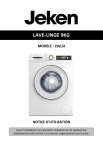 LAVE-LINGE 9KG MODÈLE : 29LLSJ NOTICE D’UTILISATION Avant l’installation ou la première utilisation de cet appareil, lire attentivement cette notice. La conserver soigneusement par la suite. TABLE DES MATIÈRES TABLE DES MATIÈRES ........................................................................................ 1 AVERTISSEMENTS.............................................................................................. 2 CONSIGNES DE SÉCURITÉ .................................................................................. 3 DESCRIPTION DE L’APPAREIL .......................................................................... 13 INSTALLATION ................................................................................................. 14 BANDEAU DE COMMANDES ........................................................................... 24 UTILISATION .................................................................................................... 31 ENTRETIEN ET NETTOYAGE ............................................................................. 36 PANNES ET SOLUTIONS ................................................................................... 39 GARANTIE ........................................................................................................ 44 CARACTÉRISTIQUES TECHNIQUES................................................................... 45 PROTECTION DE L’ENVIRONNEMENT ............................................................. 50 1 AVERTISSEMENTS Vous venez d'acheter notre produit et nous vous remercions. Nous apportons un soin particulier au design, à l'ergonomie et à la simplicité d'usage de nos produits. Nous espérons que cet appareil vous donnera entière satisfaction. Dans le souci d'une amélioration constante de nos produits, nous nous réservons le droit d'apporter à leurs caractéristiques techniques, fonctionnelles ou esthétiques toutes modifications liées à leur évolution. LISEZ ATTENTIVEMENT CES INSTRUCTIONS AVANT D'UTILISER L'APPAREIL ET CONSERVEZ-LES POUR POUVOIR LES CONSULTER ULTÉRIEUREMENT. 2 CONSIGNES DE SÉCURITÉ CONSIGNES GÉNÉRALES DE SÉCURITÉ QUANT À L'UTILISATION D'UN APPAREIL ÉLECTRIQUE 1. AVERTISSEMENT : afin d’éviter tout risque d’incendie, d’électrocution ou de blessure, veillez à toujours suivre les consignes de sécurité suivantes quand vous utilisez un appareil électrique. 2. Veillez à ce que les différents types d’emballage (cartons, sacs en plastique, polystyrène, bandes collantes, liens, etc.) soient hors de portée des enfants. Ces éléments comportent un risque potentiel. 3. Lors du déballage de l'appareil, de son installation et avant chaque utilisation, vérifiez son bon état général. Si vous constatez une quelconque anomalie sur l'appareil, le cordon d'alimentation ou la fiche, n'utilisez pas l'appareil et adressez-vous au service aprèsvente pour qu'il soit vérifié ou réparé. 3 4. Cet appareil n’est pas destiné à un usage professionnel ou commercial, ou pour d’autre but que celui pour lequel il a été conçu. Cet appareil peut cependant être utilisé dans des applications domestiques et analogues telles que : - des coins cuisine réservés au personnel dans des magasins, bureaux et autres environnements professionnels ; - des fermes ; - l’utilisation par les clients des hôtels, motels et autres environnements à caractère résidentiel ; - des environnements du type chambres d’hôtes. - des emplacements prévus pour un usage collectif dans des immeubles d’habitation ou dans des laveries automatiques. Mais n’est pas destiné à être utilisé dans : - la restauration et autres applications similaires y compris la vente au détail. 5. L’installation du produit doit respecter strictement les exigences de la norme NF C15100. 4 6. Avant de brancher votre appareil, assurezvous que la tension électrique de votre domicile correspond à celle indiquée sur la plaque signalétique de l'appareil. 7. Ne laissez pas l'appareil sans surveillance lorsqu'il fonctionne. 8. Cet appareil peut être utilisé par des enfants âgés d'au moins 8 ans et par des personnes ayant des capacités physiques, sensorielles ou mentales réduites ou dénuées d’expérience ou de connaissance, s'ils (si elles) sont correctement surveillé(e)s ou si des instructions relatives à l'utilisation de l'appareil en toute sécurité leur ont été données et si les risques encourus ont été appréhendés. Les enfants ne doivent pas jouer avec l’appareil. Le nettoyage et l'entretien par l'usager ne doivent pas être effectués par des enfants sans surveillance. 9. Pour éviter tout risque d’incendie, d’électrocution ou autres blessures aux personnes, ne plongez jamais l'appareil, le cordon d’alimentation ou la fiche dans l’eau ou tout autre liquide. Ne manipulez pas l’appareil et la fiche avec les mains mouillées. 5 10. Le cordon d'alimentation doit être manipulé avec précaution. L'appareil ne doit pas être tiré par le cordon. Celui-ci ne doit pas être placé sur le rebord d'une table ou d'un plan de travail. Il ne doit pas entrer en contact avec des surfaces chaudes. Lorsque vous le débranchez, tirez-le toujours au niveau de la fiche, ne tirez pas sur le câble lui-même. 11. AVERTISSEMENT : Lors du positionnement de l’appareil, s’assurer que le cordon d’alimentation n’est pas coincé ni endommagé. 12. Si le cordon d’alimentation est endommagé, il doit être remplacé par le fabricant, son service après-vente ou une personne de qualification similaire, afin d'éviter tout danger. 13. Toute intervention sur l'appareil pendant son installation ou toute réparation doit être effectuée par le service après-vente ou une personne de qualification similaire. 14. Toute intervention ou nettoyage sur le produit doit se faire hors alimentation. Pour cela, la fiche d’alimentation doit être déconnectée de la prise de courant. 6 15. Le stockage de