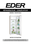 RÉFRIGÉRATEUR - CONGÉLATEUR MODÈLE : D41P25 blanc NOTICE D’UTILISATION Avant l’installation ou la première utilisation de cet appareil, lire attentivement cette notice. La conserver soigneusement par la suite. TABLE DES MATIÈRES TABLE DES MATIÈRES ........................................................................................ 1 CONSIGNES DE SÉCURITÉ .................................................................................. 3 DESCRIPTION DE L’APPAREIL .......................................................................... 11 INSTALLATION ................................................................................................. 12 RÉGLAGE DE LA TEMPÉRATURE ...................................................................... 16 UTILISATION .................................................................................................... 19 ENTRETIEN ET MAINTENANCE ........................................................................ 22 MODIFICATION DU SENS D’OUVERTURE DE LA PORTE .................................. 26 GUIDE DE DÉPANNAGE ................................................................................... 29 CONSEILS POUR RÉDUIRE VOTRE CONSOMMATION D’ÉNERGIE ................... 32 CARACTÉRISTIQUES TECHNIQUES................................................................... 33 SCHÉMA ÉLECTRIQUE ..................................................................................... 34 PROTECTION DE L’ENVIRONNEMENT ............................................................. 35 1 Vous venez d'acquérir un produit de la marque Eder et nous vous en remercions. Nous apportons un soin particulier au design, à l'ergonomie et à la simplicité d'usage de nos produits. Nous espérons que cet appareil vous donnera entière satisfaction. Dans le souci d'une amélioration constante de nos produits, nous nous réservons le droit d'apporter à leurs caractéristiques techniques, fonctionnelles ou esthétiques toutes modifications liées à leur évolution. LISEZ ATTENTIVEMENT CES INSTRUCTIONS AVANT D'UTILISER L'APPAREIL ET CONSERVEZ-LES POUR POUVOIR LES CONSULTER ULTÉRIEUREMENT. 2 CONSIGNES DE SÉCURITÉ CONSIGNES GÉNÉRALES DE SÉCURITÉ QUANT À L'UTILISATION D'UN APPAREIL ÉLECTRIQUE 1. AVERTISSEMENT : afin d’éviter tout risque d’incendie, d’électrocution ou de blessure, veillez à toujours suivre les consignes de sécurité suivantes quand vous utilisez un appareil électrique. 2. Veillez à ce que les différents types d’emballage (cartons, sacs en plastique, polystyrène, bandes collantes, liens, etc.) soient hors de portée des enfants. Ces éléments comportent un risque potentiel. 3. Lors du déballage de l'appareil, de son installation et avant chaque utilisation, vérifiez son bon état général. Si vous constatez une quelconque anomalie sur l'appareil, le cordon d'alimentation ou la fiche, n'utilisez pas l'appareil et adressez-vous au service après-vente pour qu'il soit vérifié ou réparé. 4. Cet appareil n’est pas destiné à un usage professionnel ou commercial, ou pour d’autre but que celui pour lequel il a été conçu. Cet appareil peut cependant être utilisé dans des applications domestiques et analogues telles que : 3 - des coins cuisine réservés au personnel dans des magasins, bureaux et autres environnements professionnels ; - des fermes ; - l’utilisation par les clients des hôtels, motels et autres environnements à caractère résidentiel ; - des environnements du type chambres d’hôtes. Mais n’est pas destiné à être utilisé dans : - la restauration et autres applications similaires y compris la vente au détail. 5. L’installation du produit doit respecter strictement les exigences de la norme NF C15-100. 6. Avant de brancher votre appareil, assurez-vous que la tension électrique de votre domicile correspond à celle indiquée sur la plaque signalétique de l'appareil. 7. Ne laissez pas l'appareil sans surveillance lorsqu'il fonctionne. 8. Cet appareil peut être utilisé par des enfants âgés d'au moins 8 ans et par des personnes ayant des capacités physiques, sensorielles ou mentales réduites ou dénuées d’expérience ou de connaissance, s'ils (si elles) sont correctement surveillé(e)s ou si des instructions relatives à l'utilisation de l'appareil en toute sécurité leur ont été données et si les risques encourus 4 ont été appréhendés. Les enfants ne doivent pas jouer avec l’appareil. Le nettoyage et l'entretien de l'appareil ne doivent pas être effectués par des enfants, à moins qu'ils ne soient âgés d'au moins 8 ans et qu'ils soient sous la surveillance d'un adulte. 9. Cet appareil n’est pas un jouet. Les enfants de moins de 8 ans ne doivent pas utiliser l'appareil sans la surveillance d'un adulte. 10. Pour éviter tout risque d’incendie, d’électrocution ou autres blessures aux personnes, ne plongez jamais l'appareil, le cordon d’alimentation ou la fiche dans l’eau ou tout autre liquide. Ne manipulez pas l’appareil et la fiche avec les mains mouillées. 11. Le cordon d'alimentation doit être manipulé avec précaution. L'appareil ne doit pas être tiré par le cordon. Celui-ci ne doit pas être placé sur le rebord d'une table ou d'un plan de travail. Il ne doit pas entrer en contact avec des surfaces chaudes. Lorsque vous le débranchez, tirez-le toujours au niveau de la fiche, ne tirez pas sur le câble lui-même. 12. AVERTISSEMENT : Lors du positionnement de l’appareil, s’assurer que le cordon d’alimentation n’est pas coincé ni endommagé. 5 13. Si le cordon d’alimentation est endommagé, il doit être remplacé par le fabricant, son service après-vente ou une personne de qualification similaire, afin d'éviter tout danger. 14. Toute intervention sur l'appareil pendant son installation ou toute réparation doit être effectuée par le service après-vente ou une personne de qualification similaire. 15. Toute inter