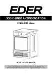SÈCHE-LINGE À CONDENSATION FF6SLC25 blanc NOTICE D’UTILISATION Avant l’installation ou la première utilisation de cet appareil, lire attentivement cette notice. La conserver soigneusement par la suite. 1 SOMMAIRE SOMMAIRE ........................................................................................................ 2 CONSIGNES DE SÉCURITÉ .................................................................................. 4 DESCRIPTION DU PRODUIT ............................................................................. 13 AVANT UTILISATION ........................................................................................ 15 INSTALLATION ................................................................................................. 16 UTILISATION .................................................................................................... 21 CONSEILS DE SÉCHAGE ................................................................................... 26 PROGRAMMES DE SÉCHAGE ........................................................................... 29 ENTRETIEN ET NETTOYAGE ............................................................................. 30 PANNES ET SOLUTIONS ................................................................................... 35 GARANTIE ........................................................................................................ 37 CARACTÉRISTIQUES TECHNIQUES................................................................... 38 PROTECTION DE L’ENVIRONNEMENT ............................................................. 41 2 Vous venez d'acquérir un produit de la marque Eder et nous vous en remercions. Nous apportons un soin particulier au design, à l'ergonomie et à la simplicité d'usage de nos produits. Nous espérons que cet appareil vous donnera entière satisfaction. Dans le souci d'une amélioration constante de nos produits, nous nous réservons le droit d'apporter à leurs caractéristiques techniques, fonctionnelles ou esthétiques toutes modifications liées à leur évolution. LISEZ ATTENTIVEMENT CES INSTRUCTIONS AVANT D'UTILISER L'APPAREIL ET CONSERVEZ-LES POUR POUVOIR LES CONSULTER ULTÉRIEUREMENT. 3 CONSIGNES DE SÉCURITÉ CONSIGNES GÉNÉRALES DE SÉCURITÉ QUANT À L'UTILISATION D'UN APPAREIL ÉLECTRIQUE 1. AVERTISSEMENT : afin d’éviter tout risque d’incendie, d’électrocution ou de blessure, veillez à toujours suivre les consignes de sécurité suivantes quand vous utilisez un appareil électrique. 2. Veillez à ce que les différents types d’emballage (cartons, sacs en plastique, polystyrène, bandes collantes, liens, etc.) soient hors de portée des enfants. Ces éléments comportent un risque potentiel. 3. Lors du déballage de l'appareil, de son installation et avant chaque utilisation, vérifiez son bon état général. Si vous constatez une quelconque anomalie sur l'appareil, le cordon d'alimentation ou la fiche, n'utilisez pas l'appareil et adressez-vous au service après-vente pour qu'il soit vérifié ou réparé. 4. Cet appareil n’est pas destiné à un usage professionnel ou commercial, ou pour d’autre but que celui pour lequel il a été conçu. Cet appareil peut cependant être utilisé dans des applications domestiques et analogues telles que : 4 - des coins cuisine réservés au personnel dans des magasins, bureaux et autres environnements professionnels ; - des fermes ; - l’utilisation par les clients des hôtels, motels et autres environnements à caractère résidentiel ; - des environnements du type chambres d’hôtes. Mais n’est pas destiné à être utilisé dans : - la restauration et autres applications similaires y compris la vente au détail 5. L’installation du produit doit respecter strictement les exigences de la norme NF C15-100. 6. Avant de brancher votre appareil, assurez-vous que la tension électrique de votre domicile correspond à celle indiquée sur la plaque signalétique de l'appareil. 7. Ne laissez pas l'appareil sans surveillance lorsqu'il fonctionne. 8. Cet appareil peut être utilisé par des enfants âgés d'au moins 8 ans et par des personnes ayant des capacités physiques, sensorielles ou mentales réduites ou dénuées d’expérience ou de connaissance, s'ils (si elles) sont correctement surveillé(e)s ou si des instructions relatives à l'utilisation de l'appareil en toute sécurité leur ont été données et si les risques encourus 5 ont été appréhendés. Les enfants ne doivent pas jouer avec l’appareil. Le nettoyage et l'entretien de l'appareil ne doivent pas être effectués par des enfants, à moins qu'ils ne soient âgés d'au moins 8 ans et qu'ils soient sous la surveillance d'un adulte. 9. Cet appareil n’est pas un jouet. Les enfants de moins de 8 ans ne doivent pas utiliser l'appareil sans la surveillance d'un adulte. 10. Pour éviter tout risque d’incendie, d’électrocution ou autres blessures aux personnes, ne plongez jamais l'appareil, le cordon d’alimentation ou la fiche dans l’eau ou tout autre liquide. Ne manipulez pas l’appareil et la fiche avec les mains mouillées. 11. Le cordon d'alimentation doit être manipulé avec précaution. L'appareil ne doit pas être tiré par le cordon. Celui-ci ne doit pas être placé sur le rebord d'une table ou d'un plan de travail. Il ne doit pas entrer en contact avec des surfaces chaudes. Lorsque vous le débranchez, tirez-le toujours au niveau de la fiche, ne tirez pas sur le câble lui-même. 12. AVERTISSEMENT : Lors du positionnement de l’appareil, s’assurer que le cordon d’alimentation n’est pas coincé ni endommagé. 6 13. Si le cordon d’alimentation est endommagé, il doit être remplacé par le fabricant, son service après-vente ou une personne de qualification similaire, afin d'éviter tout danger. 14. Toute intervention sur l'appareil pendant son installation ou toute réparation doit être effectuée par le service après-vente ou une per