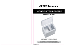 CONGELATEUR COFFRE MODELE : MF-150 NOTICE D’UTILISATION Avant l’installation ou la première utilisation de cet appareil, Lire attentivement cette notice. La conserver soigneusement par la suite. 8110 Jeken MF-150_IB TABLE DES MATIERES AVERTISSEMENT1 INSTRUCTIONS D’INSTALLATION 8 DESCRIPTION DE L’APPAREIL 10 ACCESSOIRES11 CONNEXION ELECTRIQUE 12 REGLAGE DE LA TEMPERATURE 12 INSTALLATION ET MISE EN SERVICE DE L’APPAREIL 13 CONGELATION / CONSERVATION DES ALIMENTS FRAIS 14 HAUTEUR MAXIMALE D’EMPILAGE 15 DUREE DE CONSERVATION 16 NETTOYAGE ET ENTRETIEN 16 DEGIVRAGE17 REPARER SOI-MEME LES PANNES 19 DETECTION DES PANNES/ORIGINES/REMEDES 20 CARACTERISTIQUES23 SCHEMA ELECTRIQUE 24 CONSEILS POUR REDUIRE VOTRE CONSOMMATION D’ENERGIE 24 REPARATIONS25 AVERTISSEMENT Cet appareil est d’un usage très simple. Nous vous conseillons néanmoins de lire attentivement cette notice d’utilisation car elle contient des informations importantes concernant la sécurité et des instructions de nettoyage. Cet appareil est exclusivement destiné à un usage domestique. Tout autre usage (professionnel) est exclu. Le fabricant décline toute responsabilité en cas de blessure causée à des personnes ou de dégât matériel dus à la non-observation des instructions d’entretien et à l’usage inadéquat de l’appareil. Après avoir retiré l’emballage des différentes pièces de l’appareil, vérifiez que celui-ci se trouve en parfait état. Si vous avez des doutes à ce sujet, n’utilisez pas l’appareil et adressez-vous au vendeur ou à un technicien qualifié. Veillez également à ce que les différents types d’emballage (cartons, sacs en plastique, polystyrène, bandes collantes, liens, etc.) soient hors de portée des enfants. Ces éléments comportent un risque potentiel. Avant d’utiliser l’appareil, vérifiez si le courant de votre secteur correspond à celui qui est indiqué sur la plaque signalétique. Quand vous utilisez cet appareil, veuillez suivre les consignes de sécurité suivantes. CONSIGNES DE SECURITE Avertissement : afin d’éviter tout risque d’incendie, d’électrocution ou de blessure, veillez à toujours suivre les principales consignes de sécurité suivantes quand vous utilisez un appareil électrique. 1. Avant l’utilisation de cet appareil, lisez attentivement la notice d’utilisation. Conservez cette notice avec soin. 1 2 8110 Jeken MF-150_IB 2. Ne laissez pas les enfants jouer avec cet appareil. 3. Ne laissez pas l’appareil sans surveillance lorsqu’il est 10. Ne manipulez ni l’appareil, ni la prise avec les mains branché. Retirez la prise lorsque vous n’utilisez pas l’appareil ou lorsque vous le nettoyez. 4. Cet appareil n’est pas un jouet. Ayez une stricte surveillance quand vous utilisez l’appareil en présence d’enfants ou d’animaux domestiques. Ne permettez pas à des enfants d’utiliser cet appareil. 5. Vérifiez régulièrement l’état de votre appareil. N’utilisez pas l’appareil si ce dernier est endommagé. 6. N’utilisez pas l’appareil si le cordon d’alimentation ou la prise est endommagé. N’utilisez pas l’appareil s’il est tombé, s’il est endommagé, s’il est resté dehors ou s’il est tombé dans l’eau. 7. Ne tirez ou portez pas l’appareil par le cordon d’alimentation, n’utilisez pas le cordon comme poignée, ne coincez pas le fil dans la porte et ne le tirez pas le long de bords ou angles acérés. 8. Ne placez pas l’appareil sur le cordon d’alimentation. Ne laissez d’aucune façon le cordon s’enrouler ou s’emmêler. Tenez le cordon éloigné des surfaces chaudes. 9. Ne retirez pas la prise en tirant sur le cordon. Pour enlever la prise, prenez celle-ci en main et retirez-la prudemment de la prise murale. mouillées. 11. Portez une attention particulière à cet appareil et suivez toutes les instructions données dans la notice d’utilisation. 12. Utilisez uniquement une rallonge certifiée avec l’ampérage en vigueur dans votre pays. Des rallonges certifiées avec un ampérage inférieur risquent de surchauffer. Veillez à ce que personne ne trébuche sur le cordon ou la prise. 13. Débranchez toujours le cordon d’alimentation avant de nettoyer l’appareil. 14. Si le cordon d’alimentation est endommagé, il doit être remplacé par le fabricant, son service après-vente ou des personnes de qualification similaire, afin d’éviter tout danger. 15. Toute réparation doit être effectuée par le service après-vente ou des personnes de qualification similaire. 16. Eteignez et débranchez l’appareil lorsque vous ne l’utilisez pas. 17. Cet appareil doit uniquement servir à un usage domestique. 18. Ne laissez pas l’appareil sans surveillance lorsqu’il est en fonctionnement. 3 4 8110 Jeken MF-150_IB 19. N’utilisez pas l’appareil près de matériaux inflammables. 20. N’utilisez pas d’autres accessoires que ceux étant fournis avec l’appareil. 21. Cet appareil n’est pas prévu pour être utilisé par des personnes (y compris les enfants) dont les capacités physiques, sensorielles ou mentales sont réduites, ou des personnes dénuées d’expérience ou de connaissance, sauf si elles ont pu bénéficier, par l’intermédiaire d’une personne responsable de leur sécurité, d’une surveillance ou d’instructions préalables concernant l’utilisation de l’appareil. 22. Il convient de surveiller les enfants pour s’assurer qu’ils ne jouent pas avec l’appareil. 23. Avant de vous débarrasser de votre ancien appareil : retirez la porte et laissez les tiroirs en place pour que les enfants ne puissent pas aller à l’intérieur. 24. Ne laissez jamais les enfants utiliser, jouer avec ou à l’intérieur de l’appareil. 25. Ne nettoyez jamais l’appareil avec des produits liquides inflammables. Les vapeurs risqueraient de provoquer un incendie ou une explosion. 26. Ne stockez pas et n’utilisez pas d’essence ou toute autre vapeur ou liquide infl