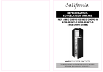 RÉFRIGÉRATEURCONGÉLATEUR VINTAGE REF : BCD-295VC-GB BCD-295VC-R BCD-295VC-C BCD-295VC-S (BCD-295V-C53H) NOTICE D’UTILISATION Lire attentivement ces instructions avant la première utilisation, puis conserver cette notice. TABLE DES MATIÈRES AVERTISSEMENTS CONSIGNES DE SÉCURITÉ NOMENCLATURE INSTALLATION UTILISATION INSTALLATION DE L’INDICATEUR DE TEMPÉRATURE VÉRIFICATION DE LA TEMPÉRATURE DANS LA ZONE LA PLUS FROIDE CONSERVATION DES ALIMENTS DANS LE RÉFRIGÉRATEUR EN FONCTION DE LEUR NATURE UTILISATION DU COMPARTIMENT CONGÉLATEUR CONSEILS POUR RÉDUIRE VOTRE CONSOMMATION D’ÉNERGIE ENTRETIEN - NETTOYAGE DÉGIVRAGE DÉCONNEXION DE L'APPAREIL EMBALLAGE ET DÉPLACEMENT NOTIFICATIONS UTILISATEUR CONSEILS POUR LE DÉPANNAGE CARACTÉRISTIQUES PROTECTION DE L’ENVIRONNEMENT 1 2 7 9 10 11 12 13 13 14 15 16 16 17 17 18 19 20 AVERTISSEMENTS Le fabricant décline toute responsabilité en cas de blessure causée à des personnes ou de dégât matériel dus à la nonobservation des instructions d’entretien et à l’usage inadéquat de l’appareil. Après avoir retiré l’emballage des différentes pièces de l’appareil, vérifiez que celui-ci se trouve en parfait état. Si vous avez des doutes à ce sujet, n’utilisez pas l’appareil et adressez-vous à un vendeur ou à un technicien qualifié. Veillez également à ce que les différents types d’emballage (cartons, sacs en plastique, polystyrène, bandes collantes, liens, etc.) soient hors de portée des enfants. Ces éléments comportent un risque potentiel. Avant d’utiliser l’appareil, vérifiez si le courant de votre secteur correspond à celui qui est indiqué sur la plaque signalétique. Quand vous utilisez cet appareil, veuillez suivre les consignes de sécurité suivantes. 1 MISES EN GARDE IMPORTANTES. ATTENTIVEMENT ET CONSERVER RÉFÉRENCE ULTÉRIEURE. LIRE POUR CONSIGNES DE SÉCURITÉ Avant l’utilisation de cet appareil, lisez attentivement la notice d’utilisation. Conservez cette notice avec soin. Vérifiez premièrement si la tension indiquée sur le produit correspond à votre alimentation électrique. Avertissement : afin d’éviter tout risque d’incendie, d’électrocution ou de blessure, veillez à toujours suivre les principales consignes de sécurité suivantes quand vous utilisez un appareil électrique. Vérifiez régulièrement l’état de votre appareil. N’utilisez pas l’appareil si ce dernier est endommagé. Ne manipulez ni l’appareil, ni la prise avec les mains mouillées. N’utilisez pas l’appareil si le cordon d’alimentation ou la prise est endommagé(e). N’utilisez pas l’appareil s’il est tombé, s’il est endommagé, s’il est resté dehors ou s’il est tombé dans l’eau. Retournez l’appareil au service aprèsvente le plus proche pour qu’il soit réparé ou ajusté. 2 Ne tirez et ne portez pas l’appareil par le cordon d’alimentation, n’utilisez pas le cordon comme poignée, ne coincez pas le fil dans la porte et ne le tirez pas le long de bords ou angles acérés. Ne placez pas l’appareil sur le cordon d’alimentation. Ne laissez en aucune façon le cordon s’enrouler ou s’emmêler. Tenez le cordon éloigné des surfaces chaudes. Ne retirez pas la prise en tirant sur le cordon. Pour la retirer, prenez-la en main et retirez-la prudemment de la prise murale. Utilisez uniquement une rallonge certifiée avec l’ampérage en vigueur dans votre pays. Des rallonges certifiées avec un ampérage inférieur risquent de surchauffer. Veillez à ce que personne ne trébuche sur le cordon ou la prise. Attention : débranchez toujours le cordon d'alimentation ou coupez le disjoncteur avant de procéder au nettoyage. Si le cordon d’alimentation est endommagé, il doit être remplacé par le fabricant, son service après-vente ou une personne de qualification similaire, afin d'éviter tout danger. Toute réparation doit être effectuée par le service aprèsvente ou des personnes de qualification similaire. Tous travaux électriques requis dans le cadre de l’installation de cet appareil doivent être effectués par un électricien qualifié ou une personne compétente. Eteignez et débranchez l’appareil lorsque vous ne l’utilisez pas. N’utilisez pas l’appareil près de matériaux inflammables. N’utilisez pas d’autres accessoires que ceux étant fournis avec l’appareil. Cet appareil peut être utilisé par des enfants âgés d'au moins 8 ans et par des personnes ayant des capacités physiques, sensorielles ou mentales réduites ou dénuées d’expérience ou de connaissance, s'ils (si elles) sont correctement surveillé(e)s ou si des instructions relatives à l'utilisation de l'appareil en toute sécurité leur ont été données et si les risques encourus ont été appréhendés. Les enfants ne doivent pas jouer avec l’appareil. Le nettoyage et l'entretien par l'usager ne doivent pas être effectués par des enfants sans surveillance. Il convient de surveiller les enfants pour s’assurer qu’ils ne jouent pas avec l’appareil. 3 4 Cet appareil n’est pas un jouet. Ayez une stricte surveillance quand vous utilisez l’appareil en présence d’enfants ou d’animaux domestiques. Ne nettoyez jamais l’appareil avec des produits liquides inflammables. Les vapeurs risqueraient de provoquer un incendie ou une explosion. Ne stockez pas et n’utilisez pas d’essence ou toute autre vapeur ou liquide inflammable à proximité de cet appareil. Les fumées peuvent entraîner un incendie ou une explosion. Cet appareil est destiné à être utilisé dans des applications domestiques et analogues telles que : - les coins cuisine réservés au personnel des magasins, bureaux et autres environnements professionnels ; - les fermes ; - l’utilisation par les clients des hôtels, motels et autres environnements à caractère résidentiel ; - les environnements du type chambres d’hôtes. Toutes interventions ou nettoyage sur le produit doivent se fa