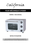 FOUR MÉCANIQUE À POSER MODÈLE : KE22 (KE22bc) NOTICE D’UTILISATION Avant l’installation ou la première utilisation de cet appareil, lire attentivement cette notice. La conserver soigneusement par la suite. TABLE DES MATIÈRES TABLE DES MATIÈRES ..................................................................................... 1 CONSIGNES DE SÉCURITÉ ............................................................................... 3 DESCRIPTION DE L’APPAREIL ........................................................................ 10 UTILISATION ................................................................................................ 12 ENTRETIEN ET NETTOYAGE .......................................................................... 15 PANNES ET SOLUTIONS ................................................................................ 16 PROTECTION DE L’ENVIRONNEMENT ........................................................... 17 1 Vous venez d'acquérir un produit de la marque California et nous vous en remercions. Nous apportons un soin particulier au design, à l'ergonomie et à la simplicité d'usage de nos produits. Nous espérons que cet appareil vous donnera entière satisfaction. Dans le souci d'une amélioration constante de nos produits, nous nous réservons le droit d'apporter à leurs caractéristiques techniques, fonctionnelles ou esthétiques toutes modifications liées à leur évolution. LISEZ ATTENTIVEMENT CES INSTRUCTIONS AVANT D'UTILISER L'APPAREIL ET CONSERVEZ-LES POUR POUVOIR LES CONSULTER ULTÉRIEUREMENT. 2 CONSIGNES DE SÉCURITÉ CONSIGNES GÉNÉRALES DE SÉCURITÉ QUANT À L'UTILISATION D'UN APPAREIL ÉLECTRIQUE 1. AVERTISSEMENT : afin d’éviter tout risque d’incendie, d’électrocution ou de blessure, veillez à toujours suivre les consignes de sécurité suivantes quand vous utilisez un appareil électrique. 2. Veillez à ce que les différents types d’emballage (cartons, sacs en plastique, polystyrène, bandes collantes, liens, etc.) soient hors de portée des enfants. Ces éléments comportent un risque potentiel. 3. Lors du déballage de l'appareil, de son installation et avant chaque utilisation, vérifiez son bon état général. Si vous constatez une quelconque anomalie sur l'appareil, le cordon d'alimentation ou la fiche, n'utilisez pas l'appareil et adressez-vous au service après-vente pour qu'il soit vérifié ou réparé. 4. Cet appareil n’est pas destiné à un usage professionnel ou commercial, ou pour d’autre but que celui pour lequel il a été conçu. Cet appareil peut cependant être utilisé dans des applications domestiques et analogues telles que : 3 - des coins cuisine réservés au personnel dans des magasins, bureaux et autres environnements professionnels ; - des fermes ; - l’utilisation par les clients des hôtels, motels et autres environnements à caractère résidentiel ; - des environnements du type chambres d’hôtes. Mais n’est pas destiné à être utilisé dans : - la restauration et autres applications similaires y compris la vente au détail. 5. L'installation du produit doit respecter strictement les exigences de la norme NF C15-100. 6. Avant de brancher votre appareil, assurez-vous que la tension électrique de votre domicile correspond à celle indiquée sur la plaque signalétique de l'appareil. 7. Ne laissez pas l'appareil sans surveillance lorsqu'il fonctionne. 8. Cet appareil peut être utilisé par des enfants âgés d'au moins 8 ans et par des personnes ayant des capacités physiques, sensorielles ou mentales réduites ou dénuées d’expérience ou de connaissance, s'ils (si elles) sont correctement surveillé(e)s ou si des instructions relatives à l'utilisation de l'appareil en toute sécurité leur ont été données et si les risques encourus ont été 4 appréhendés. Les enfants ne doivent pas jouer avec l’appareil. Le nettoyage et l'entretien de l'appareil ne doivent pas être effectués par des enfants, à moins qu'ils ne soient âgés d'au moins 8 ans et qu'ils soient sous la surveillance d'un adulte. 9. Cet appareil n’est pas un jouet. Les enfants de moins de 8 ans ne doivent pas utiliser l'appareil sans la surveillance d'un adulte. 10. Pour éviter tout risque d’incendie, d’électrocution ou autres blessures aux personnes, ne plongez jamais l'appareil, le cordon d’alimentation ou la fiche dans l’eau ou tout autre liquide. Ne manipulez pas l’appareil et la fiche avec les mains mouillées. 11. Le cordon d'alimentation doit être manipulé avec précaution. L'appareil ne doit pas être tiré par le cordon. Celui-ci ne doit pas être placé sur le rebord d'une table ou d'un plan de travail. Il ne doit pas entrer en contact avec des surfaces chaudes. Lorsque vous le débranchez, tirez-le toujours au niveau de la fiche, ne tirez pas sur le câble lui-même. 12. Si le cordon d’alimentation est endommagé, il doit être remplacé par le fabricant, son service aprèsvente ou une personne de qualification similaire, afin d'éviter tout danger. 5 13. Toute intervention sur l'appareil pendant son installation ou toute réparation doit être effectuée par le service après-vente ou une personne de qualification similaire. 14. Toute intervention ou nettoyage sur le produit doit se faire hors alimentation. Pour cela, la fiche d’alimentation doit être déconnectée de la prise de courant. 15. Le stockage de matériaux ou de liquides inflammables, de même que leur utilisation à proximité de l'appareil ou pour le nettoyage de l'appareil sont interdits. Les vapeurs peuvent provoquer un incendie ou une explosion. 16. N’utilisez que les accessoires fournis et recommandés par le fabricant. CONSIGNES DE SÉCURITÉ L'UTILISATION D'UN FOUR QUANT À 1. MISE EN GARDE : la température de la porte, de la surface extérieure et des surfaces accessibles peut être élevée lorsque l’appareil fonctionne et provoquer des brulures. Ne pas toucher de surfaces chaudes sans gant
