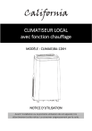 CLIMATISEUR LOCAL avec fonction chauffage MODÈLE : CLIMA018A-12KH NOTICE D’UTILISATION Avant l’installation ou la première utilisation de cet appareil, lire attentivement cette notice. La conserver soigneusement par la suite. TABLE DES MATIÈRES TABLE DES MATIÈRES .................................................................................... 1 CONSIGNES DE SÉCURITÉ .............................................................................. 3 DESCRIPTION DE L’APPAREIL ....................................................................... 12 INSTALLATION ............................................................................................. 15 UTILISATION ................................................................................................ 22 Consignes de vidange .................................................................................. 25 ENTRETIEN ET STOCKAGE ............................................................................ 27 GUIDE DE DÉPANNAGE / RÉPARATIONS ...................................................... 30 RÉPARATIONS .............................................................................................. 33 Transport, marquage et stockage des unités .............................................. 34 CARACTÉRISTIQUES TECHNIQUES ............................................................... 50 GARANTIE .................................................................................................... 52 PROTECTION DE L’ENVIRONNEMENT.......................................................... 53 1 Vous venez d'acquérir un produit de la marque California et nous vous en remercions. Nous apportons un soin particulier au design, à l'ergonomie et à la simplicité d'usage de nos produits. Nous espérons que cet appareil vous donnera entière satisfaction. Dans le souci d'une amélioration constante de nos produits, nous nous réservons le droit d'apporter à leurs caractéristiques techniques, fonctionnelles ou esthétiques toutes modifications liées à leur évolution. LISEZ ATTENTIVEMENT CES INSTRUCTIONS AVANT D'UTILISER L'APPAREIL ET CONSERVEZ-LES POUR POUVOIR LES CONSULTER ULTÉRIEUREMENT. 2 CONSIGNES DE SÉCURITÉ CONSIGNES GÉNÉRALES DE SÉCURITÉ QUANT À L'UTILISATION D'UN APPAREIL ÉLECTRIQUE 1. AVERTISSEMENT : afin d’éviter tout risque d’incendie, d’électrocution ou de blessure, veillez à toujours suivre les consignes de sécurité suivantes quand vous utilisez un appareil électrique. 2. Veillez à ce que les différents types d’emballage (cartons, sacs en plastique, polystyrène, bandes collantes, liens, etc.) soient hors de portée des enfants. Ces éléments comportent un risque potentiel. 3. Lors du déballage de l'appareil, de son installation et avant chaque utilisation, vérifiez son bon état général. Si vous constatez une quelconque anomalie sur l'appareil, le cordon d'alimentation ou la fiche, n'utilisez pas l'appareil et adressez-vous au service après-vente pour qu'il soit vérifié ou réparé. 4. Cet appareil n’est pas destiné à un usage professionnel ou commercial, ou pour d’autre but que celui pour lequel il a été conçu. Cet appareil peut cependant être utilisé dans des applications domestiques et analogues telles que : - des coins cuisine réservés au personnel dans des magasins, bureaux et autres environnements professionnels ; - des fermes ; 3 - l’utilisation par les clients des hôtels, motels et autres environnements à caractère résidentiel ; - des environnements du type chambres d’hôtes. Mais n’est pas destiné à être utilisé dans : - la restauration et autres applications similaires y compris la vente au détail. 5. L'installation du produit doit respecter strictement les exigences de la norme NF C15-100. 6. Avant de brancher votre appareil, assurez-vous que la tension électrique de votre domicile correspond à celle indiquée sur la plaque signalétique de l'appareil. 7. Ne laissez pas l'appareil sans surveillance lorsqu'il fonctionne. 8. Cet appareil peut être utilisé par des enfants âgés d'au moins 8 ans et par des personnes ayant des capacités physiques, sensorielles ou mentales réduites ou dénuées d’expérience ou de connaissance, s'ils (si elles) sont correctement surveillé(e)s ou si des instructions relatives à l'utilisation de l'appareil en toute sécurité leur ont été données et si les risques encourus ont été appréhendés. Les enfants ne doivent pas jouer avec l’appareil. Le nettoyage et l'entretien de l'appareil ne doivent pas être effectués par des enfants, à moins qu'ils ne soient âgés d'au moins 8 ans et qu'ils soient sous la surveillance d'un adulte. 4 9. Cet appareil n’est pas un jouet. Les enfants de moins de 8 ans ne doivent pas utiliser l'appareil sans la surveillance d'un adulte. 10. Pour éviter tout risque d’incendie, d’électrocution ou autres blessures aux personnes, ne plongez jamais l'appareil, le cordon d’alimentation ou la fiche dans l’eau ou tout autre liquide. Ne manipulez pas l’appareil et la fiche avec les mains mouillées. 11. Le cordon d'alimentation doit être manipulé avec précaution. L'appareil ne doit pas être tiré par le cordon. Celui-ci ne doit pas être placé sur le rebord d'une table ou d'un plan de travail. Il ne doit pas entrer en contact avec des surfaces chaudes. Lorsque vous le débranchez, tirez-le toujours au niveau de la fiche, ne tirez pas sur le câble lui-même. 12. Si le cordon d’alimentation est endommagé, il doit être remplacé par le fabricant, son service après-vente ou une personne de qualification similaire, afin d'éviter tout danger. 13. Toute intervention sur l'appareil pendant son installation ou toute réparation doit être effectuée par le service après-vente ou une personne de qualification similaire. 14. Toute intervention ou nettoyage sur le produit doit se faire hors alimentation. Pour cela, la fiche 5 d’alimentation doi