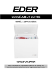 CONGÉLATEUR COFFRE MODÈLE : DD4CB25 blanc NOTICE D’UTILISATION Avant l’installation ou la première utilisation de cet appareil, lire attentivement cette notice. La conserver soigneusement par la suite. 1 TABLE DES MATIÈRES TABLE DES MATIÈRES ........................................................................................ 2 CONSIGNES DE SÉCURITÉ .................................................................................. 4 DESCRIPTION DU PRODUIT ............................................................................. 12 INSTALLATION ................................................................................................. 13 UTILISATION .................................................................................................... 15 CONSEILS ET ASTUCES..................................................................................... 17 ENTRETIEN ET NETTOYAGE ............................................................................. 19 DÉGIVRAGE DE L’APPAREIL ............................................................................. 21 PANNES ET SOLUTIONS ................................................................................... 22 CARACTÉRISTIQUES TECHNIQUES................................................................... 23 SCHÉMA ÉLECTRIQUE ..................................................................................... 24 PROTECTION DE L’ENVIRONNEMENT ............................................................. 25 2 Vous venez d'acquérir un produit de la marque Eder et nous vous en remercions. Nous apportons un soin particulier au design, à l'ergonomie et à la simplicité d'usage de nos produits. Nous espérons que cet appareil vous donnera entière satisfaction. Dans le souci d'une amélioration constante de nos produits, nous nous réservons le droit d'apporter à leurs caractéristiques techniques, fonctionnelles ou esthétiques toutes modifications liées à leur évolution. LISEZ ATTENTIVEMENT CES INSTRUCTIONS AVANT D'UTILISER L'APPAREIL ET CONSERVEZ-LES POUR POUVOIR LES CONSULTER ULTÉRIEUREMENT. 3 CONSIGNES DE SÉCURITÉ CONSIGNES GÉNÉRALES DE SÉCURITÉ QUANT À L'UTILISATION D'UN APPAREIL ÉLECTRIQUE 1. AVERTISSEMENT : afin d’éviter tout risque d’incendie, d’électrocution ou de blessure, veillez à toujours suivre les consignes de sécurité suivantes quand vous utilisez un appareil électrique. 2. Veillez à ce que les différents types d’emballage (cartons, sacs en plastique, polystyrène, bandes collantes, liens, etc.) soient hors de portée des enfants. Ces éléments comportent un risque potentiel. 3. Lors du déballage de l'appareil, de son installation et avant chaque utilisation, vérifiez son bon état général. Si vous constatez une quelconque anomalie sur l'appareil, le cordon d'alimentation ou la fiche, n'utilisez pas l'appareil et adressez-vous au service après-vente pour qu'il soit vérifié ou réparé. 4. Cet appareil n’est pas destiné à un usage professionnel ou commercial, ou pour d’autre but que celui pour lequel il a été conçu. Cet appareil peut cependant être utilisé dans des applications domestiques et analogues telles que : 4 - des coins cuisine réservés au personnel dans des magasins, bureaux et autres environnements professionnels ; - des fermes ; - l’utilisation par les clients des hôtels, motels et autres environnements à caractère résidentiel ; - des environnements du type chambres d’hôtes. Mais n’est pas destiné à être utilisé dans : - la restauration et autres applications similaires y compris la vente au détail. 5. L’installation du produit doit respecter strictement les exigences de la norme NF C15-100. 6. Avant de brancher votre appareil, assurez-vous que la tension électrique de votre domicile correspond à celle indiquée sur la plaque signalétique de l'appareil. 7. Ne laissez pas l'appareil sans surveillance lorsqu'il fonctionne. 8. Cet appareil peut être utilisé par des enfants âgés d'au moins 8 ans et par des personnes ayant des capacités physiques, sensorielles ou mentales réduites ou dénuées d’expérience ou de connaissance, s'ils (si elles) sont correctement surveillé(e)s ou si des instructions relatives à l'utilisation de l'appareil en toute sécurité leur ont été données et si les risques encourus 5 ont été appréhendés. Les enfants ne doivent pas jouer avec l’appareil. Le nettoyage et l'entretien de l'appareil ne doivent pas être effectués par des enfants, à moins qu'ils ne soient âgés d'au moins 8 ans et qu'ils soient sous la surveillance d'un adulte. 9. Cet appareil n’est pas un jouet. Les enfants de moins de 8 ans ne doivent pas utiliser l'appareil sans la surveillance d'un adulte. 10. Pour éviter tout risque d’incendie, d’électrocution ou autres blessures aux personnes, ne plongez jamais l'appareil, le cordon d’alimentation ou la fiche dans l’eau ou tout autre liquide. Ne manipulez pas l’appareil et la fiche avec les mains mouillées. 11. Le cordon d'alimentation doit être manipulé avec précaution. L'appareil ne doit pas être tiré par le cordon. Celui-ci ne doit pas être placé sur le rebord d'une table ou d'un plan de travail. Il ne doit pas entrer en contact avec des surfaces chaudes. Lorsque vous le débranchez, tirez-le toujours au niveau de la fiche, ne tirez pas sur le câble lui-même. 12. AVERTISSEMENT : Lors du positionnement de l’appareil, s’assurer que le cordon d’alimentation n’est pas coincé ni endommagé. 6 13. Si le cordon d’alimentation est endommagé, il doit être remplacé par le fabricant, son service après-vente ou une personne de qualification similaire, afin d'éviter tout danger. 14. Toute intervention sur l'appareil pendant son installation ou toute réparation doit être effectuée par le service après-vente ou une personne de qualification similaire. 15. Toute intervention ou nettoyage sur le produit doit se faire hors a