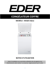 CONGÉLATEUR COFFRE MODÈLE : I9CB25 blanc NOTICE D’UTILISATION Avant l’installation ou la première utilisation de cet appareil, lire attentivement cette notice. La conserver soigneusement par la suite. 1 TABLE DES MATIÈRES TABLE DES MATIÈRES ........................................................................................ 2 CONSIGNES DE SÉCURITÉ .................................................................................. 4 DESCRIPTION DU PRODUIT ............................................................................. 12 INSTALLATION ................................................................................................. 13 UTILISATION .................................................................................................... 15 CONSEILS ET ASTUCES..................................................................................... 17 ENTRETIEN ET NETTOYAGE ............................................................................. 19 DÉGIVRAGE DE L’APPAREIL ............................................................................. 21 PANNES ET SOLUTIONS ................................................................................... 22 CARACTÉRISTIQUES TECHNIQUES................................................................... 23 SCHÉMA ÉLECTRIQUE ..................................................................................... 24 PROTECTION DE L’ENVIRONNEMENT ............................................................. 25 2 Vous venez d'acquérir un produit de la marque Eder et nous vous en remercions. Nous apportons un soin particulier au design, à l'ergonomie et à la simplicité d'usage de nos produits. Nous espérons que cet appareil vous donnera entière satisfaction. Dans le souci d'une amélioration constante de nos produits, nous nous réservons le droit d'apporter à leurs caractéristiques techniques, fonctionnelles ou esthétiques toutes modifications liées à leur évolution. LISEZ ATTENTIVEMENT CES INSTRUCTIONS AVANT D'UTILISER L'APPAREIL ET CONSERVEZ-LES POUR POUVOIR LES CONSULTER ULTÉRIEUREMENT. 3 CONSIGNES DE SÉCURITÉ CONSIGNES GÉNÉRALES DE SÉCURITÉ QUANT À L'UTILISATION D'UN APPAREIL ÉLECTRIQUE 1. AVERTISSEMENT : afin d’éviter tout risque d’incendie, d’électrocution ou de blessure, veillez à toujours suivre les consignes de sécurité suivantes quand vous utilisez un appareil électrique. 2. Veillez à ce que les différents types d’emballage (cartons, sacs en plastique, polystyrène, bandes collantes, liens, etc.) soient hors de portée des enfants. Ces éléments comportent un risque potentiel. 3. Lors du déballage de l'appareil, de son installation et avant chaque utilisation, vérifiez son bon état général. Si vous constatez une quelconque anomalie sur l'appareil, le cordon d'alimentation ou la fiche, n'utilisez pas l'appareil et adressez-vous au service après-vente pour qu'il soit vérifié ou réparé. 4. Cet appareil n’est pas destiné à un usage professionnel ou commercial, ou pour d’autre but que celui pour lequel il a été conçu. Cet appareil peut cependant être utilisé dans des applications domestiques et analogues telles que : 4 - des coins cuisine réservés au personnel dans des magasins, bureaux et autres environnements professionnels ; - des fermes ; - l’utilisation par les clients des hôtels, motels et autres environnements à caractère résidentiel ; - des environnements du type chambres d’hôtes. Mais n’est pas destiné à être utilisé dans : - la restauration et autres applications similaires y compris la vente au détail. 5. L’installation du produit doit respecter strictement les exigences de la norme NF C15-100. 6. Avant de brancher votre appareil, assurez-vous que la tension électrique de votre domicile correspond à celle indiquée sur la plaque signalétique de l'appareil. 7. Ne laissez pas l'appareil sans surveillance lorsqu'il fonctionne. 8. Cet appareil peut être utilisé par des enfants âgés d'au moins 8 ans et par des personnes ayant des capacités physiques, sensorielles ou mentales réduites ou dénuées d’expérience ou de connaissance, s'ils (si elles) sont correctement surveillé(e)s ou si des instructions relatives à l'utilisation de l'appareil en toute sécurité leur ont été données et si les risques encourus 5 ont été appréhendés. Les enfants ne doivent pas jouer avec l’appareil. Le nettoyage et l'entretien de l'appareil ne doivent pas être effectués par des enfants, à moins qu'ils ne soient âgés d'au moins 8 ans et qu'ils soient sous la surveillance d'un adulte. 9. Cet appareil n’est pas un jouet. Les enfants de moins de 8 ans ne doivent pas utiliser l'appareil sans la surveillance d'un adulte. 10. Pour éviter tout risque d’incendie, d’électrocution ou autres blessures aux personnes, ne plongez jamais l'appareil, le cordon d’alimentation ou la fiche dans l’eau ou tout autre liquide. Ne manipulez pas l’appareil et la fiche avec les mains mouillées. 11. Le cordon d'alimentation doit être manipulé avec précaution. L'appareil ne doit pas être tiré par le cordon. Celui-ci ne doit pas être placé sur le rebord d'une table ou d'un plan de travail. Il ne doit pas entrer en contact avec des surfaces chaudes. Lorsque vous le débranchez, tirez-le toujours au niveau de la fiche, ne tirez pas sur le câble lui-même. 12. AVERTISSEMENT : Lors du positionnement de l’appareil, s’assurer que le cordon d’alimentation n’est pas coincé ni endommagé. 6 13. Si le cordon d’alimentation est endommagé, il doit être remplacé par le fabricant, son service après-vente ou une personne de qualification similaire, afin d'éviter tout danger. 14. Toute intervention sur l'appareil pendant son installation ou toute réparation doit être effectuée par le service après-vente ou une personne de qualification similaire. 15. Toute intervention ou nettoyage sur le produit doit se faire hors al