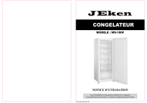 CONGELATEUR MODELE : WS-180F NOTICE D’UTILISATION Avant l’installation ou la première utilisation de cet appareil, Lire attentivement cette notice. La conserver soigneusement par la suite. 7835 Jeken WS-180F_IB CONSIGNES DE SECURITE TABLE DES MATIERES AVERTISSEMENT CONSIGNES DE SECURITE INSTRUCTIONS D’INSTALLATION MODIFICATION DU SENS D’OUVERTURE DE LA PORTE UTILISATION DE L’APPAREIL NETTOYAGE ET ENTRETIEN RESPECT DES REGLES D’HYGIENE ALIMENTAIRE RESOLUTION DES PROBLEMES CONSEILS POUR REDUIRE VOTRE CONSOMMATION D’ENERGIE CARACTERISTIQUES REPARATIONS 1 2 4 5 7 9 11 12 13 14 15 Avertissement : afin d’éviter tout risque d’incendie, d’électrocution ou de blessure, veillez à toujours suivre les principales consignes de sécurité suivantes quand vous utilisez un appareil électrique. 1. 2. 3. 4. 5. 6. 7. 8. 9. AVERTISSEMENT Cet appareil est d’un usage très simple. Nous vous conseillons néanmoins de lire attentivement cette notice d’utilisation car elle contient des informations importantes concernant la sécurité et des instructions de nettoyage. Cet appareil est exclusivement destiné à un usage domestique. Tout autre usage (professionnel) est exclu. Le fabricant décline toute responsabilité en cas de blessure causée à des personnes ou de dégât matériel dus à la non-observation des instructions d’entretien et à l’usage inadéquat de l’appareil. Après avoir retiré l’emballage des différentes pièces de l’appareil, vérifiez que celui-ci se trouve en parfait état. Si vous avez des doutes à ce sujet, n’utilisez pas l’appareil et adressez-vous au vendeur ou à un technicien qualifié. Veillez également à ce que les différents types d’emballage (cartons, sacs en plastique, polystyrène, bandes collantes, liens, etc.) soient hors de portée des enfants. Ces éléments comportent un risque potentiel. Avant d’utiliser l’appareil, vérifiez si le courant de votre secteur correspond à celui qui est indiqué sur la plaque signalétique. 10. 11. 12. 13. 14. 15. 16. 17. 18. 19. 20. 21. 22. Avant l’utilisation de cet appareil, lisez attentivement la notice d’utilisation. Conservez cette notice avec soin. Ne laissez pas les enfants jouer avec cet appareil. Ne laissez pas l’appareil sans surveillance lorsqu’il est branché. Retirez la prise lorsque vous n’utilisez pas l’appareil ou lorsque vous le nettoyez. Cet appareil n’est pas un jouet. Ayez une stricte surveillance quand vous utilisez l’appareil en présence d’enfants, d’animaux domestiques. Ne permettez pas à des enfants d’utiliser cet appareil. Vérifiez régulièrement l’état de votre appareil. N’utilisez pas l’appareil si ce dernier est endommagé. N’utilisez pas l’appareil si le cordon d’alimentation ou la prise est endommagé. N’utilisez pas l’appareil s’il est tombé, s’il est endommagé, s’il est resté dehors ou s’il est tombé dans l’eau. Ne tirez ou portez pas l’appareil par le cordon d’alimentation, n’utilisez pas le cordon comme poignée, ne coincez pas le fil dans la porte et ne le tirez pas le long de bords ou angles acérés. Ne placez pas l’appareil sur le cordon d’alimentation. Ne laissez d’aucune façon le cordon s’enrouler ou s’emmêler. Tenez le cordon éloigné des surfaces chaudes. Ne retirez pas la prise en tirant sur le cordon. Pour enlever la prise, prenez celle-ci en main et retirez-la prudemment de la prise murale. Ne manipulez ni l’appareil, ni la prise avec les mains mouillées. Portez une attention particulière à cet appareil et suivez toutes les instructions données dans la notice d’utilisation. Utilisez uniquement une rallonge certifiée avec l’ampérage en vigueur dans votre pays. Des rallonges certifiées avec un ampérage inférieur risquent de surchauffer. Veillez à ce que personne ne trébuche sur le cordon ou la prise. Débranchez toujours le cordon d’alimentation avant de nettoyer l’appareil. Si le cordon d’alimentation est endommagé, il doit être remplacé par le fabricant, son service après-vente ou des personnes de qualification similaire, afin d’éviter tout danger. Toute réparation doit être effectuée par le service après-vente ou des personnes de qualification similaire. Eteignez et débranchez l’appareil lorsque vous ne l’utilisez pas. Cet appareil doit uniquement servir à un usage domestique. Ne laissez pas l’appareil sans surveillance lorsqu’il est en marche. N’utilisez pas l’appareil près de matériaux inflammables. N’utilisez pas d’autres accessoires que ceux étant fournis avec l’appareil. Cet appareil n’est pas prévu pour être utilisé par des personnes (y compris les enfants) dont les capacités physiques, sensorielles ou mentales sont réduites, ou des personnes dénuées d’expérience ou de connaissance, sauf si elles ont pu bénéficier, par l’intermédiaire d’une personne responsable de leur sécurité, d’une surveillance ou d’instructions préalables concernant l’utilisation de l’appareil. Il convient de surveiller les enfants pour s’assurer qu’ils ne jouent pas avec l’appareil. Quand vous utilisez cet appareil, veuillez suivre les consignes de sécurité suivantes. 1 2 7835 Jeken WS-180F_IB 23. Avant de vous débarrasser de votre ancien appareil : retirez la porte et laissez les tiroirs en place pour que les enfants ne puissent pas aller à l’intérieur. 24. Ne laissez jamais les enfants utiliser, jouer avec ou à l’intérieur de l’appareil. 25. Ne nettoyez jamais l’appareil avec des produits liquides inflammables. Les vapeurs risqueraient de provoquer un incendie ou une explosion. 26. Ne stockez pas et n’utilisez pas d’essence ou toute autre vapeur ou liquide inflammable à proximité de ce congélateur ou de tout autre appareil. Les fumées peuvent entraîner un incendie ou une explosion. 27. Veuillez ne pas obstruer les ouvertures sur l’appareil ou dans la structure intégrée