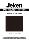TABLE DE CUISSON À INDUCTION MODÈLE : JE IH3FLEXB BK NOTICE D’UTILISATION Avant l’installation ou la première utilisation de cet appareil, lire attentivement cette notice. La conserver soigneusement par la suite. TABLE DES MATIÈRES TABLE DES MATIÈRES ........................................................................................ 1 AVERTISSEMENTS.............................................................................................. 2 CONSIGNES DE SÉCURITÉ .................................................................................. 3 DESCRIPTION DE L’APPAREIL .......................................................................... 11 INSTALLATION ................................................................................................. 12 AVANT UTILISATION ........................................................................................ 19 UTILISATION .................................................................................................... 21 ENTRETIEN ET MAINTENANCE ........................................................................ 32 GUIDE DE DÉPANNAGE ................................................................................... 34 GARANTIE ........................................................................................................ 39 CARACTÉRISTIQUES TECHNIQUES................................................................... 40 PROTECTION DE L’ENVIRONNEMENT ............................................................. 41 1 AVERTISSEMENTS Vous venez d'acquérir un produit de la marque JEKEN et nous vous en remercions. Nous apportons un soin particulier au design, à l'ergonomie et à la simplicité d'usage de nos produits. Nous espérons que cet appareil vous donnera entière satisfaction. Dans le souci d'une amélioration constante de nos produits, nous nous réservons le droit d'apporter à leurs caractéristiques techniques, fonctionnelles ou esthétiques toutes modifications liées à leur évolution. LISEZ ATTENTIVEMENT CES INSTRUCTIONS AVANT D'UTILISER L'APPAREIL ET CONSERVEZ-LES POUR POUVOIR LES CONSULTER ULTÉRIEUREMENT. 2 CONSIGNES DE SÉCURITÉ CONSIGNES GÉNÉRALES DE SÉCURITÉ QUANT À L'UTILISATION D'UN APPAREIL ÉLECTRIQUE 1. AVERTISSEMENT : afin d’éviter tout risque d’incendie, d’électrocution ou de blessure, veillez à toujours suivre les consignes de sécurité suivantes quand vous utilisez un appareil électrique. 2. Veillez à ce que les différents types d’emballage (cartons, sacs en plastique, polystyrène, bandes collantes, liens, etc.) soient hors de portée des enfants. Ces éléments comportent un risque potentiel. 3. Lors du déballage de l'appareil, de son installation et avant chaque utilisation, vérifiez son bon état général. Si vous constatez une quelconque anomalie sur l'appareil, le cordon d'alimentation ou la fiche, n'utilisez pas l'appareil et adressez-vous au service après-vente pour qu'il soit vérifié ou réparé. 4. Cet appareil n’est pas destiné à un usage professionnel ou commercial, ou pour d’autre but que celui pour lequel il a été conçu. Cet appareil peut cependant être utilisé dans des applications domestiques et analogues telles que : 3 - des coins cuisine réservés au personnel dans des magasins, bureaux et autres environnements professionnels ; - des fermes ; - l’utilisation par les clients des hôtels, motels et autres environnements à caractère résidentiel ; - des environnements du type chambres d’hôtes. Mais n’est pas destiné à être utilisé dans : - la restauration et autres applications similaires y compris la vente au détail. 5. L’installation du produit doit respecter strictement les exigences de la norme NF C15-100. 6. Avant de brancher votre appareil, assurez-vous que la tension électrique de votre domicile correspond à celle indiquée sur la plaque signalétique de l'appareil. 7. Ne laissez pas l'appareil sans surveillance lorsqu'il fonctionne. 8. Cet appareil peut être utilisé par des enfants âgés d'au moins 8 ans et par des personnes ayant des capacités physiques, sensorielles ou mentales réduites ou dénuées d’expérience ou de connaissance, s'ils (si elles) sont correctement surveillé(e)s ou si des instructions relatives à l'utilisation de l'appareil en toute sécurité leur ont été données et si les risques encourus ont été 4 appréhendés. Les enfants ne doivent pas jouer avec l’appareil. Le nettoyage et l'entretien de l'appareil ne doivent pas être effectués par des enfants, à moins qu'ils ne soient âgés d'au moins 8 ans et qu'ils soient sous la surveillance d'un adulte. 9. Cet appareil n’est pas un jouet. Les enfants de moins de 8 ans ne doivent pas utiliser l'appareil. 10. Pour éviter tout risque d’incendie, d’électrocution ou autres blessures aux personnes, ne plongez jamais l'appareil, le cordon d’alimentation ou la fiche dans l’eau ou tout autre liquide. Ne manipulez pas l’appareil et la fiche avec les mains mouillées. 11. Le cordon d'alimentation doit être manipulé avec précaution. L'appareil ne doit pas être tiré par le cordon. Celui-ci ne doit pas être placé sur le rebord d'une table ou d'un plan de travail. Il ne doit pas entrer en contact avec des surfaces chaudes. Lorsque vous le débranchez, tirez-le toujours au niveau de la fiche, ne tirez pas sur le câble lui-même. 12. AVERTISSEMENT : Lors du positionnement de l’appareil, s’assurer que le cordon d’alimentation n’est pas coincé ni endommagé. 13. Si le cordon d’alimentation est endommagé, il doit être remplacé par le fabricant, son service après5 vente ou une personne de qualification similaire, afin d'éviter tout danger. 14. Toute intervention sur l'appareil pendant son installation ou toute réparation doit être effectuée par le service après-vente ou une personne de qualification similaire. 15. Toute intervention ou nettoyage sur le produit doit se faire hor