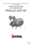 INSTRUCTIONS RELATIVES À L’INSTALLATION, À LA MISE EN SERVICE ET À LA MAINTENANCE POMPE CENTRIFUGE AUTO-AMORÇANTE 01.031.32.0001 PROLAC HCP SP Notice Originale 01.031.30.03FR (B) 2024/07 Déclaration de conformité CE INOXPA S.A.U. Telers, 60 17820 - Banyoles (Espagne) déclare sous sa responsabilité que la Machine : POMPE CENTRIFUGE AUTO-AMORÇANTE Modèle : PROLAC HCP SP Type : PROLAC HCP SP 50-150 PROLAC HCP SP 50-190 PROLAC HCP SP 65-215 Numéro de série : IXXXXXXXXX à IXXXXXXXXX XXXXXXXXXIINXXX à XXXXXXXXXIINXXX est conforme aux dispositions applicables des directives suivantes : Directive de Machines 2006/42/CE Directive 2011/65/UE relative à la limitation de l’utilisation de certaines substances dangereuses dans les équipements électriques et électroniques. Règlement (CE) nº 1935/2004 Règlement (CE) nº 2023/2006 et aux normes harmonisées et/ou aux règlements suivants : EN ISO 12100:2010 EN 809:1998+A1:2009/AC:2010 EN 60204-1:2018 EN ISO 14159:2008 EN 1672-2:2005+A1:2009 EN 12162:2001+A1:2009 EN IEC 63000:2018 Le dossier technique a été préparé par la personne qui signe le présent document. David Reyero Brunet Responsable du bureau technique 10 juin 2024 Document : 01.031.30.04FR Révision : (B) 2024/06 C onformité de INOXPA S.A.U. Telers, 60 17820 - Banyoles (Espagne) déclare sous sa responsabilité que la Machine : POMPE CENTRIFUGE AUTO-AMORÇANTE Modèle : PROLAC HCP SP Type : PROLAC HCP SP 50-150 PROLAC HCP SP 50-190 PROLAC HCP SP 65-215 Numéro de série : IXXXXXXXXX à IXXXXXXXXX XXXXXXXXXIINXXX à XXXXXXXXXIINXXX est conforme à toutes les dispositions applicables des règlements : Supply of Machinery (Safety) Regulations 2008 The Restriction of the Use of Certain Hazardous Substances in Electrical and Electronic Equipment Regulations 2012 (as amended) Déclaration ainsi qu’aux normes harmonisées : EN ISO 12100:2010 EN 809:1998+A1:2009/AC:2010 EN 60204-1:2018 EN ISO 14159:2008 EN 1672-2:2005+A1:2009 EN 12162:2001+A1:2009 EN IEC 63000:2018 Le dossier technique a été préparé par le signataire de ce document. David Reyero Brunet Responsable du bureau technique 10 juin 2024 Document : 01.031.30.05FR Révision : (A) 2024/06 1. Table des matières 1. Table des matières 2. Informations générales 2.1. Manuel d’instructions............................................................................................................................... 4 2.2. Conformité aux instructions..................................................................................................................... 4 2.3. Garantie................................................................................................................................................... 4 3. Sécurité 3.1. Symboles d’avertissement....................................................................................................................... 5 3.2. Consignes générales de sécurité............................................................................................................. 5 4. Informations générales 4.1. Description............................................................................................................................................... 7 4.2. Principe de fonctionnement..................................................................................................................... 7 4.3. Application................................................................................................................................................ 7 5. Installation 5.1. Réception de la pompe............................................................................................................................ 8 5.2. Identification de la pompe........................................................................................................................ 8 5.3. Transport et stockage.............................................................................................................................. 9 5.4. Emplacement........................................................................................................................................... 9 5.5. Pieds réglables...................................................................................................................................... 10 5.6. Tuyauteries............................................................................................................................................ 10 5.7. Réservoir de pressurisation................................................................................................................... 11 5.8. Installation électrique............................................................................................................................. 11 6. Mise en service 6.1. Vérifications avant de mettre la pompe en service................................................................................ 13 6.2. Vérifications lors de la mise en service de la pompe............................................................................. 14 7. Dysfonctionnements 8. Entretien 8.1. Informations générales.......................................................................................................................... 16 8.2. Vérification de la garniture mécanique................................................................................................... 16 8.3. Maintenance des joints.......................................................................................................................... 16 8.4. Couple de serrage................................................................................................................................. 16 8.5. Stockage................................................................................................................................................ 17 8.6. Nettoyage.......................................