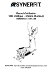 Manuel d’utilisation Vélo elliptique – Modèle Challenge Référence : SNT223 IMPORTANT: Merci de prendre connaissance de ce manuel avant toute utilisation. Cher client: Merci d'avoir choisi notre produit. Il est important de lire ce manuel en entier avant d'utiliser l'équipement INFORMATIONS DE SÉCURITÉ IMPORTANTES Veuillez noter ce qui suit avant d'assembler et d'utiliser l'équipement. • Veuillez suivre les instructions; • Veuillez vérifier si tous les boulons et les pièces de connexion de l'équipement sont verrouillés avant utilisation afin d’assurer la sécurité des utilisateurs; • Ne pas exposer l'équipement à des endroits humides, ce qui entraînerait une défaillance. • Veuillez placer les pièces sur un tapis (caoutchouc ou bois) lors de l'assemblage, pour éviter les salissures; • Avant l'exercice, assurez-vous qu'aucun autre objet n'est placé à moins de 2 mètres autour de l'équipement; • Nettoyez-le uniquement avec un chiffon humide, pas avec nettoyants à base de solvants et notez également après chaque exercice que vous devez essuyer la transpiration de l'équipement; • Un exercice incorrect ou excessif peut nuire à votre santé. Il est recommandé de consulter un médecin avant de faire de l'exercice. Il vous donnera un maximum d’ information (y compris le pouls, les watts, la durée, etc.) afin que vous puissiez vous exercer et obtenir des informations précises. Remarque: Cet appareil ne convient pas à un usage thérapeutique. • La maintenance ne peut être faite qu’en utilisant les accessoires d'origine fournis par l'usine; • Cette machine ne peut être utilisée que par une personne à la fois. • Il faut toujours porter des vêtements de sport et des chaussures de sport adaptés lors de l'exercice; • Si vous vous sentez faible, étourdi ou éprouvez de la douleur pendant l'exercice, arrêtez-vous et consultez votre médecin; • Les enfants et les personnes handicapées ne peuvent utiliser l’appareil que lorsqu'ils sont sous tutelle; • La conception de ce produit vous permet d’ajuster la résistance afin d’ajuster l'intensité du mouvement, et peut être ajustée d'avant en arrière (niveau facile à difficile) pour sélectionner la résistance appropriée; • La capacité de poids maximum de ce produit est de 100 kilos; • Cet équipement est conçu pour une utilisation en intérieur uniquement! ATTENTION: TOUTES LES VIS ET LES ÉCROUS DOIVENT ÊTRE SERRÉS AVANT L'EXERCICE ASTUCE:VOUS POUVEZ TOURNER LE BOUCHON DU TUBE AVANT POUR FACILITER LE DÉPLACEMENT DE L'ÉQUIPEMENT INSTRUCTIONS D’ASSEMBLAGE Avant de commencer le montage: • Assurez-vous qu'il y a assez d'espace autour de la machine avant de l'assembler. • Assurez-vous d’avoir les bons outils • Vérifiez les pièces et le matériel. Dessin éclaté 1 Dessin éclaté 2 • Liste des pièces : Description N° Quantité 1 Cadre principal 1 2 Poste central 1 3 Couverture de chaîne gauche 1 4 Couverture de la chaîne droite 1 5 Barre de poignée gauche 1 6 Barre de poignée droite 1 7 jeu de poulies 1 9 Poignée de mousse pour barre de poignée φ31 * φ37 * 370 Printemps: ×18 × 48 Dia: Φ2 10 Stabilisateur avant 1 11 Tube de pédale 2 12 Pédale droite 1 13 Pédale gauche 1 14 Boulon S16 (M10) 4 15 Boulon de charnière de la pédale gauche Φ16 × 89 × 1/2 "× 20 (S8) 1 16 Boulon de charnière de la pédale droiteΦ16 × 89 × 1/2 "× 20 (S8) 1 17 Essieu inertiel Φ10 * 125 * M10 * 1 * 17 1 8 2 1 19 Manivelle Conjointe 140 * 260,1 / 2 "Dents Gauche et Droite Ceinture 390PJ5 20 Ensembles de montage à manivelle 1 21 Bouchon rotatif 2 22 Rondelle en plastique φ25 * φ16.1 * 1 2 18 1 1 23 Ordinateur 1 24 Rondelle d'arc D8 2 25 Fil de contrôle de tension 1 26 Essieu 1 27 Rondelle plate en plastique φ25 * φ8.5 * 1 2 28 Stabilisateur arrière 1 29 Roulement 6000ZZ 3 30 Boulon à tête à six pans creux M8 * 65 dents long 20 S5, avec résistance 2 31 Ligne principale: 1000mm 1 32 Poulie 1 33 Bouchon stabilisateur arrière 2 34 Ajuster la tige 1 35 Tableau magnétique 1 36 Écrou en nylon (droit) Épaisseur 1/2 "× 20 8 S19 1 37 Écrou en nylon (gauche) 1/2 "× 20- épaisseur 8 S19 1 38 Essieu inertiel Φ10 * 125 * M10 * 1 * 17 1 39 Écrou hexagonal, M6 2 40 Douille Φ29 × .220.2 × 16 6 41 Douille Φ28 * Φ24 * Φ16 * 14 4 42 Fil de contrôle de tension 1 43 Ecrou hexagonal M10 3 44 Joint de soudure 2 45 Aimant rond Φ15 × 6 1 46 Écrou hexagonal M10x1xH5 2 Description N° 47 Capteur d'aiguille long: 1300mm 48 Fiche de fil Ф12 Quantité 1 2 49 Rondelle de blocage Ø30 2 50 Inertie roue bague Φ16 * Φ10.2 * 17 1 51 Boulon à col carré M8 * 65 □ 8, dent longue 20 2 52 Barre de poignée d'impulsion 1 53 Écrou hexagonal M8 6 54 Boulon à tête à six pans creux M8 * 20 dent pleine, S5, avec résistance 4 55 Rondelle φ8.5 * φ19 * 1.5 16 56 57 58 59 Boulons hexagonaux M8 × 40 dents de la barre d'épaisseur 15 Boulons hexagonaux M8 × 20 dent pleine avec résistance Écrou borgne M8 Boulon à tête à six pans creux M8 * 45 dents long 15 S5 4 2 6 2 60 Boulon à tête hexagonale M10 × 70 dents de barres épaisses longues 15 2 61 Boulon hexagonal M8 × 40 1 62 Rondelle en plastique φ22 * φ10.5 * 1 4 63 Rondelle à ressort D8 13 64 Coupleur Bbar 2 65 Douille Φ22 * Φ16 * Φ10 * 15 4 66 Vis à tôle à tête cylindrique bombée à empreinte cruciforme ST4.2 * 12 Tête φ10 2 67 Bouchon à tête champignon Ф32 × 2 Tête Ф50 2 68 Vis à tôle à tête cylindrique bombée à empreinte cruciforme ST4.2 * 20 Tête φ8 12 69 Joint de trou de manivelle externe 2 70 Écrou hexagonal M10 S17 1 71 Ligne d'impulsion de main 500mm, tube de φ22 2 72 Rondelle plate Ø28 * Ø8.2 * 1.5 2 73 Rondelle ondulée φ27 * φ20 * 0.3 2 74 Rondelle à ressort Φ13 × Φ20 × 2 2 75 Boulon hexagonal M5 * 45, dents longues 25 avec résistance 1 76 Arc Rondelle φ5.5 * φ12 * 1 1 77 Boulon hexagonal M6 * 70, dent pleine 1 78 Vis cruciforme à tête cylindrique bombé