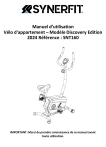 Manuel d’utilisation Vélo d'appartement – Modèle Discovery Edition 2024 Référence : SNT160 IMPORTANT: Merci de prendre connaissance de ce manuel avant toute utilisation. INFORMATIONS DE SÉCURITÉ IMPORTANTES • Merci d'avoir choisi notre produit. Veuillez l’utiliser correctement pour assurer votre sécurité et votre santé. Veuillez lire attentivement ce manuel avant d'assembler et d'utiliser l'équipement. Nous vous conseillons d’entretenir et d’utiliser l'équipement correctement pour une utilisation sûre et efficace. Il est de votre responsabilité de vous assurer que tous les utilisateurs de l'équipement sont informés de tous les avertissements et précautions indiqués dans ce manuel. • Veuillez consulter votre médecin avant de commencer un programme d'exercices pour déterminer si vous souffrez de problèmes médicaux ou physiques qui pourraient mettre votre santé et votre sécurité en danger ou vous empêcher d'utiliser l'équipement correctement. Les conseils de votre médecin sont essentiels si vous prenez des médicaments susceptibles d'affecter votre fréquence cardiaque, votre pression artérielle ou votre taux de cholestérol. • Soyez conscient des signaux de votre corps. Un exercice incorrect ou excessif peut nuire à votre santé. Arrêtez de faire de l'exercice si vous ressentez l'un des symptômes suivants: douleur, sensation d'oppression dans la poitrine, rythme cardiaque irrégulier, essoufflement, sensation, étourdissement ou sensation de nausée. Si vous rencontrez l'une de ces conditions, il faut consulter votre médecin avant de poursuivre votre programme d'exercices. • Tenez les enfants et les animaux domestiques éloignés de l'équipement. L'équipement n’est conçu que pour un usage par un adulte. • Utilisez l'équipement sur une surface plane et solide avec une housse de protection pour votre sol ou votre moquette. L'équipement doit avoir au moins 1.20 mètre d'espace libre tout autour pour assurer la sécurité. • Assurez-vous que tous les écrous et boulons sont bien serrés avant d'utiliser l'équipement. La sécurité de l'équipement ne peut être maintenue que s'il est régulièrement examiné pour déceler tout dommage et/ou usure. • Il est recommandé de lubrifier toutes les pièces mobiles tous les mois. • Il faut toujours utiliser l'équipement comme indiqué. Si vous constatez des composants défectueux lors du montage ou de la vérification de l'équipement, ou si vous entendez des bruits inhabituels provenant de l'équipement au cours de l'exercice, arrêtez immédiatement d'utiliser l'équipement et n'utilisez pas l'équipement tant que le problème n'a pas été corrigé. • Veuillez porter des vêtements appropriés lors de l'utilisation de l'équipement. Évitez de porter des vêtements amples qui pourraient s'emmêler dans l'équipement. • Ne pas mettre les doigts ou des objets dans les pièces mobiles de l'équipement. • La capacité de poids maximum de cette unité est de 130 kilos. • Cet équipement ne convient pas à un usage thérapeutique. • Déplacez-vous avec précaution lorsque vous soulevez et déplacez l'équipement. Il faut toujours utiliser la technique de levage appropriée et demander de l'aide si nécessaire. • Votre produit est conçu pour une utilisation dans des conditions fraîches et sèches. Évitez de le stocker dans des endroits extrêmement froids, chauds ou humides, car cela pourrait entraîner de la corrosion et d'autres problèmes connexes. • Cet équipement est conçu pour une utilisation en intérieur uniquement! Il n'est pas destiné à un usage commercial! INSTRUCTIONS D’ASSEMBLAGE Dessin éclaté • Liste des pièces : No 1 2 3 Nom Manchon de tube Avant Manchon de tube arrière Boulon à tête hexagonale M10*60 Quantité 2 1 2 4 Cadre principal 1 5 Coussin courbé ф10 4 6 Écrou M10 4 7 Écrou hexagonal M6 3 8 Boulon hexagonal M6*40 1 9 10 11 Ressort Aimant Boulon hexagonal M10*40 1 5 1 12 Roue libre 1 13 14 15 1 1 1 16 17L 17R 18 Poussant Rondelle ф10 Écrou en nylon M10 M10 Pièce magnifique Pédale de gauche Pédale de droite Écrou hexagonal 19 Écrou 1 20 21 22 23 Rondelle Douille Roulement à billes Écrou 1 2 2 1 24 25 26 27 28 29 Rondelle Manivelle Boulon Boulon transversal Courroie Boulon hexagonal M6*9 1 1 2 8 1 6 30 Boulon hexagonal M6*15 2 31 32 33 34 35 Rondelle ф6 Bloc de roulement Palier 6001RS Siège de palier Roue d’inertie 2 2 2 2 1 1 1 1 1 Remarque 36 Essieu 1 37 Bouchon rotatif 2 38 Stabilisateur avant 1 39 Vis autotaraudeuse à tête cruciforme 4 40 Joint de manivelle 2 41 Cache-chaîne (droit) (droit) 1 42 Cache-chaîne (gauche) (gauche) 1 43 Poignée 2 44 Capteur de pulsations 2 45 Barre de maintien 1 46 Capuchon circulaire 2 47 Moniteur 1 48 Tube central 1 49 Boulon à tête cylindrique bombée M5*10 2 50 Boulon à tête cylindrique hexagonale M8*15 5 51 Rondelle incurvée ф8 6 52 Boulon M5*40 1 53 Coussin incurve ф5 1 54 Contrôleur de tension 1 55 Fil de contrôle central 1 56 Selle 1 57 Tube de selle 1 58 Coussin ф8 3 59 Écrou en nylon M8 3 60 Tube de selle 1 61 Pièce d’ajustement hauteur siège 1 62 Câble de contrôle tension 1 63 Capteur sensoriel 1 64 Boulon à tête cylindrique hexagonale M6* 30 1 Avant de commencer le montage: • Assurez-vous qu'il y a assez d'espace autour de la machine avant de l'assembler. • Utilisez les outils fournis (recommandé) ou vos propres outils. • Vérifiez les pièces et le matériel. Étape 1: Tout d’abord, verrouillez le Stabilisateur Avant (38) sur le Cadre Principal (4) avec le Boulon (26), du Coussin Courbé (5) et de l'Écrou (6). Ensuite, verrouillez le Stabilisateur Arrière sur le Cadre Principal avec le boulon hexagonal (3). Étape 2: Faites passer le fil de contrôle de tension par le Tube Central (48); Verrouillez ensuite à l'aide du Boulon cruciforme à tête cylindrique (52) et du coussin (53). Étape 3: Connectez le capteur d'aiguille et le fil du moniteur 